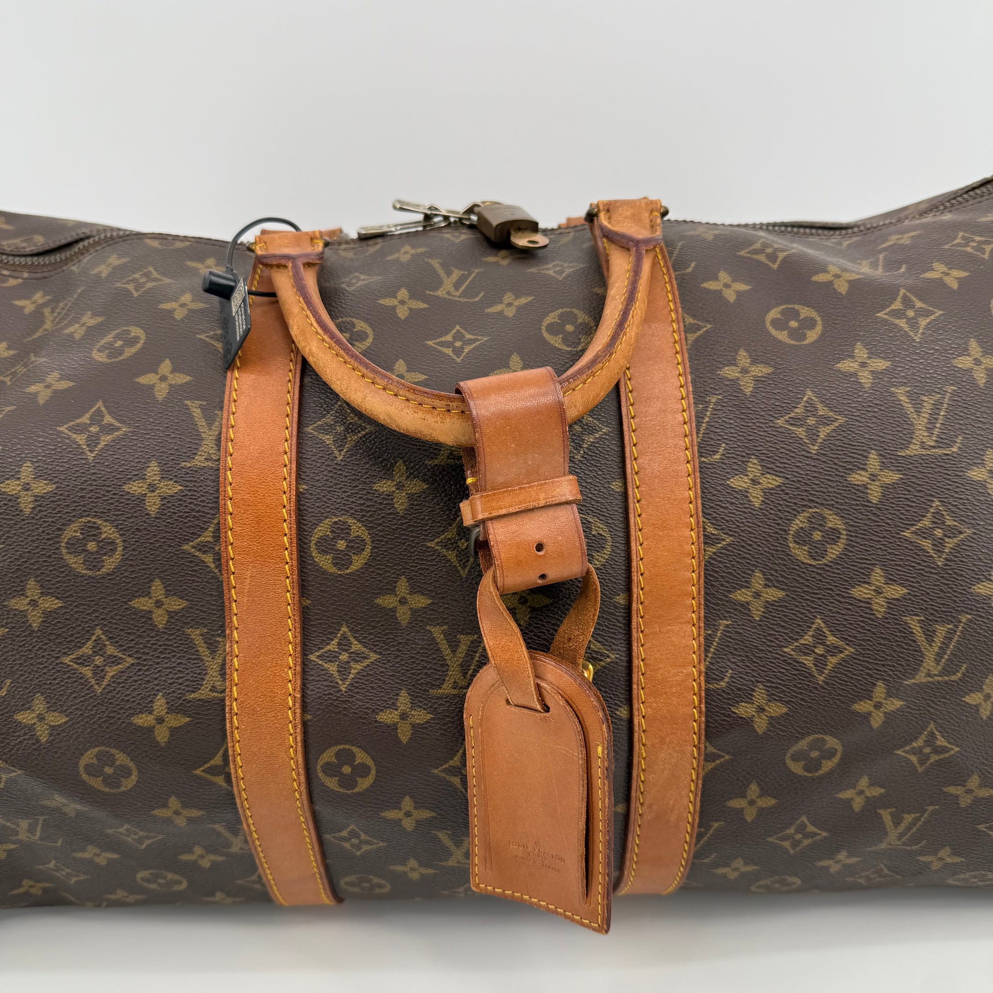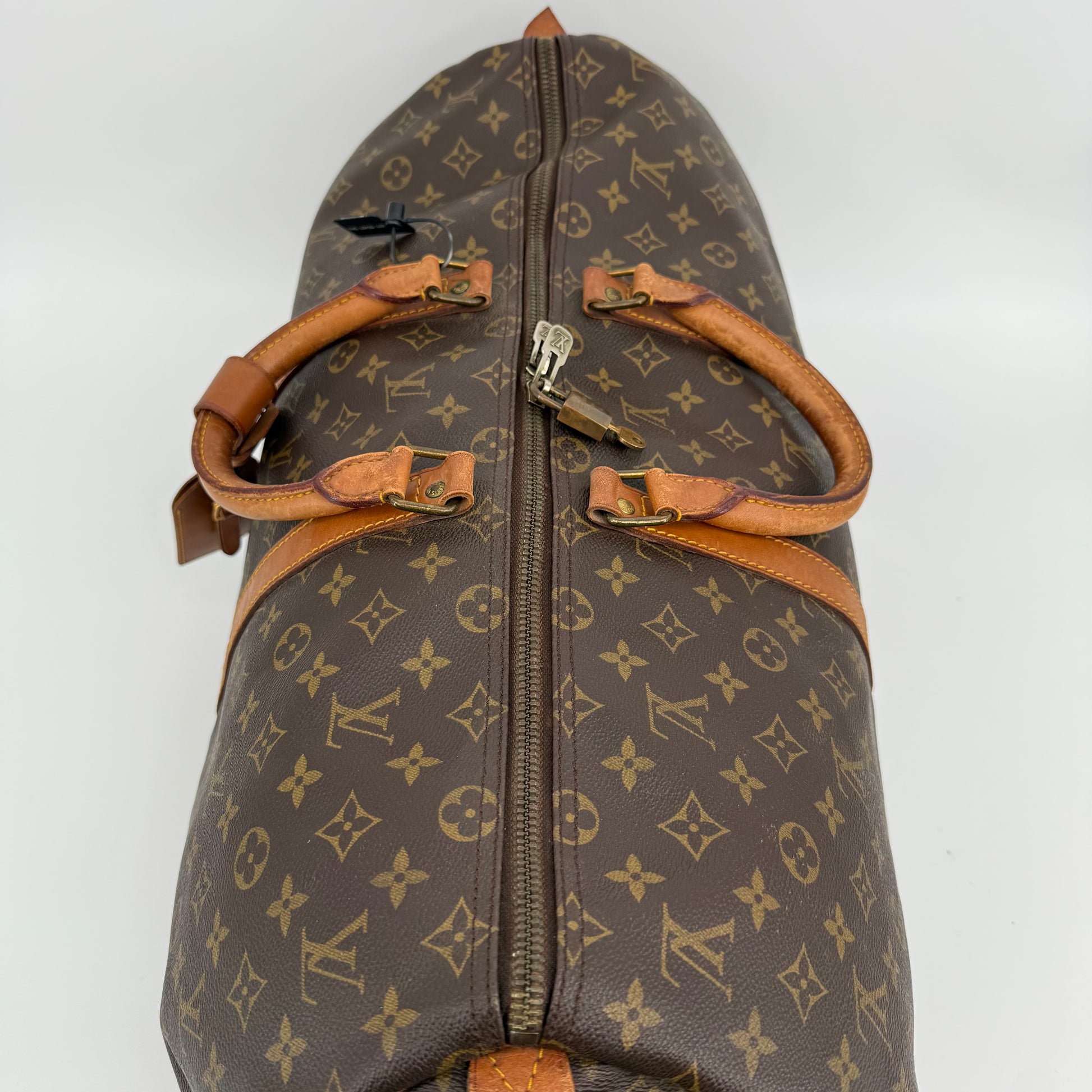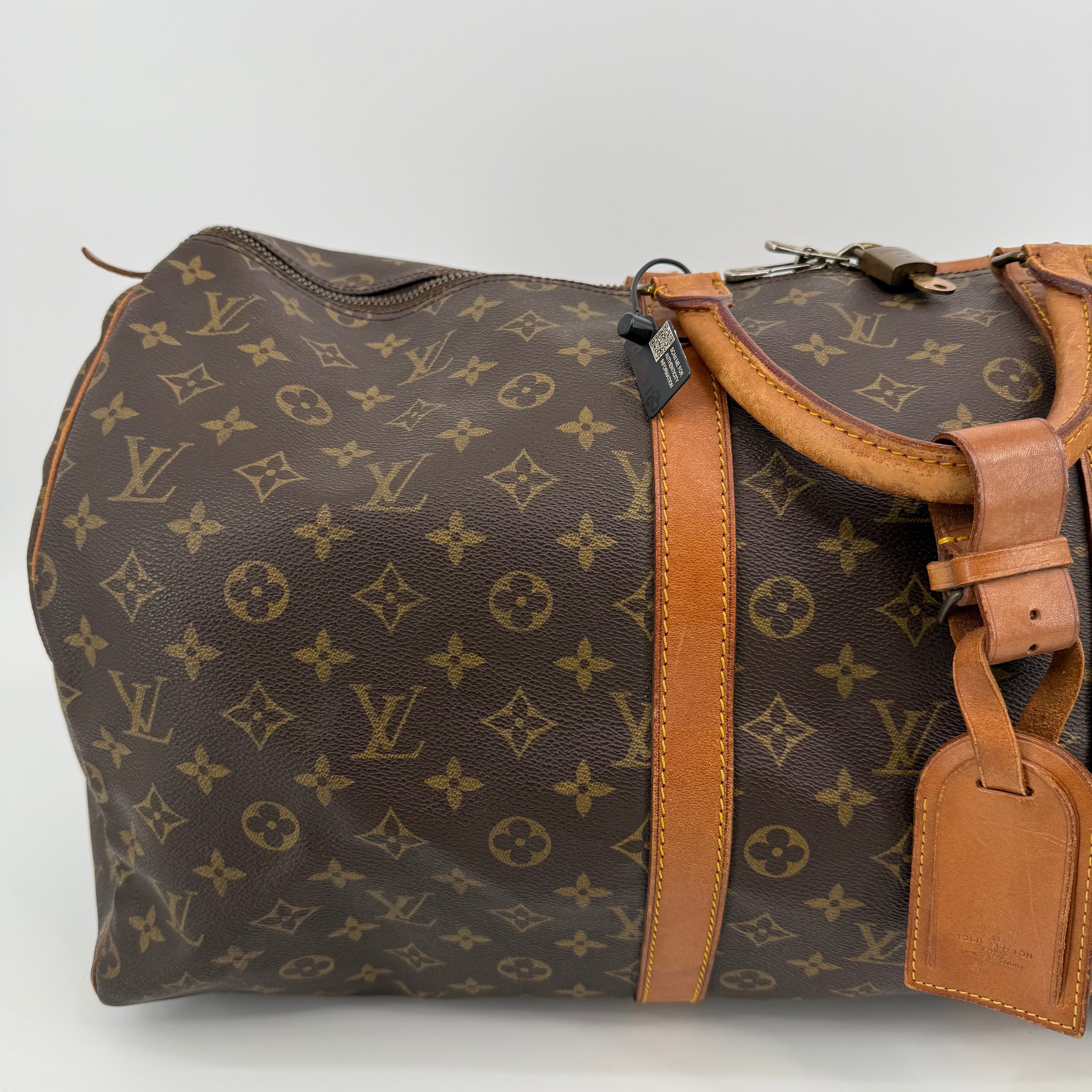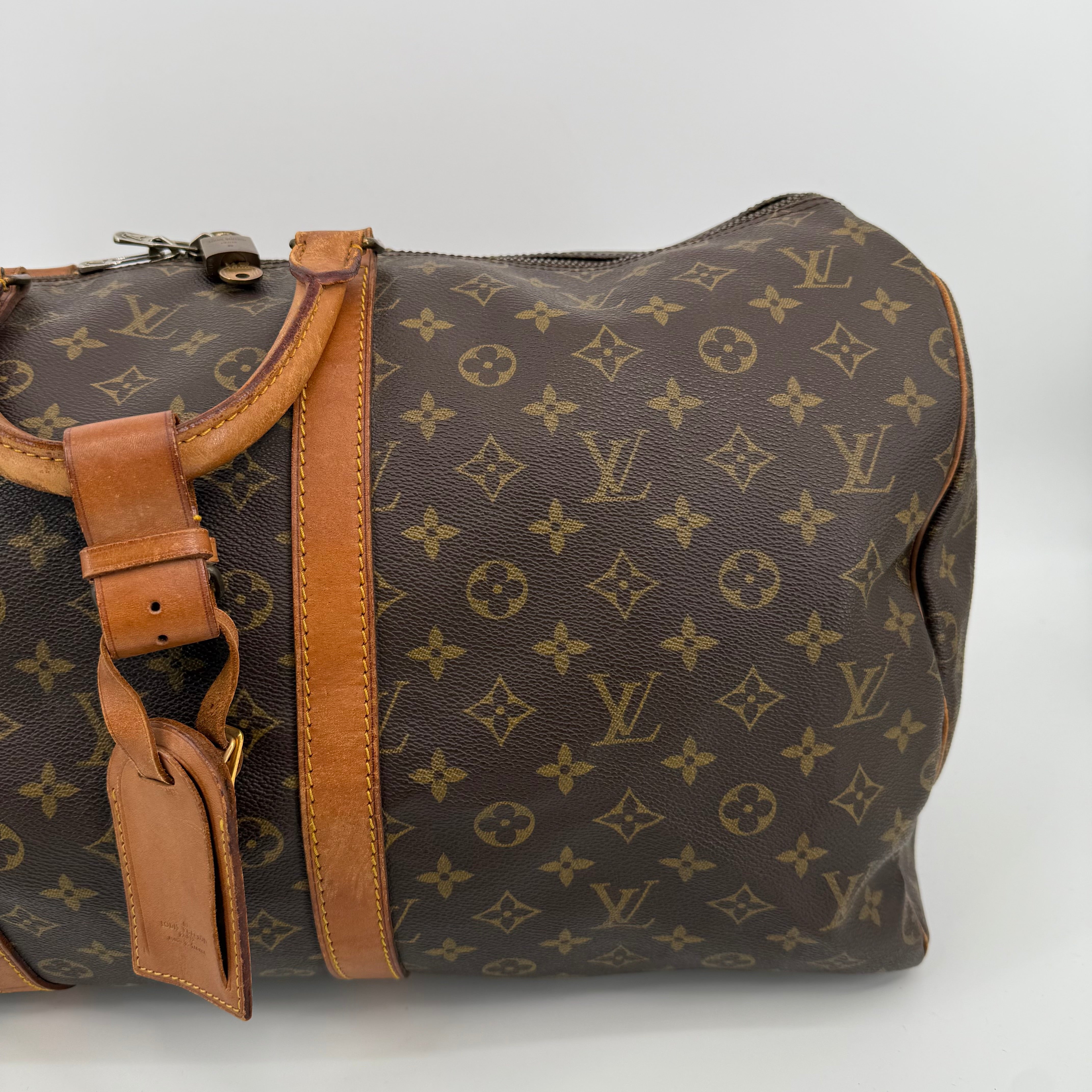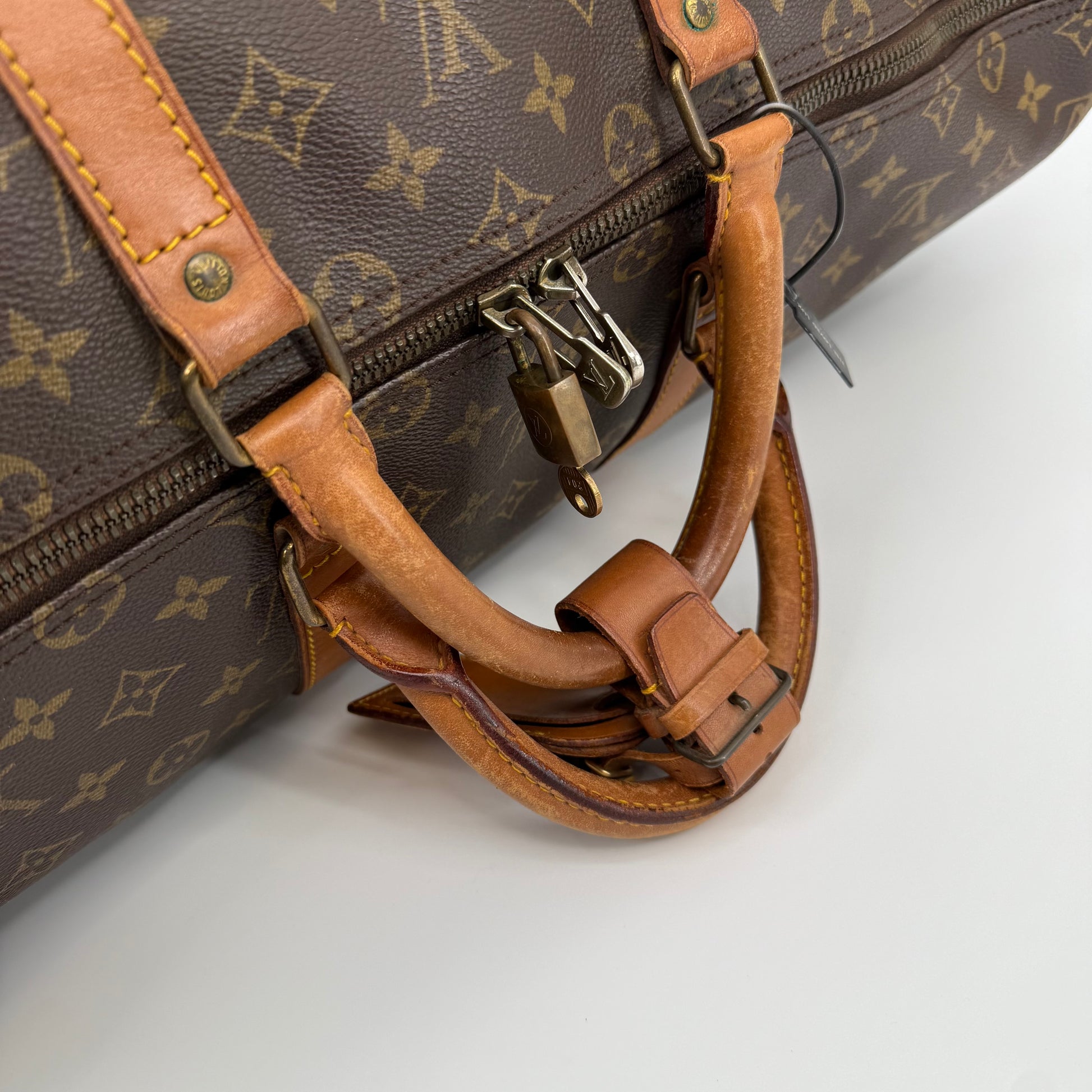 Pre-owned Louis Vuitton Monogram Keepall 55 in classic coated canvas with Vachetta leather accents. Designed with rolled leather handles, zip closure and a roomy interior perfect for travel. Displays typical ageing and wear to the leather and hardware, yet the structure is sound and the bag remains reliable and ready for use.