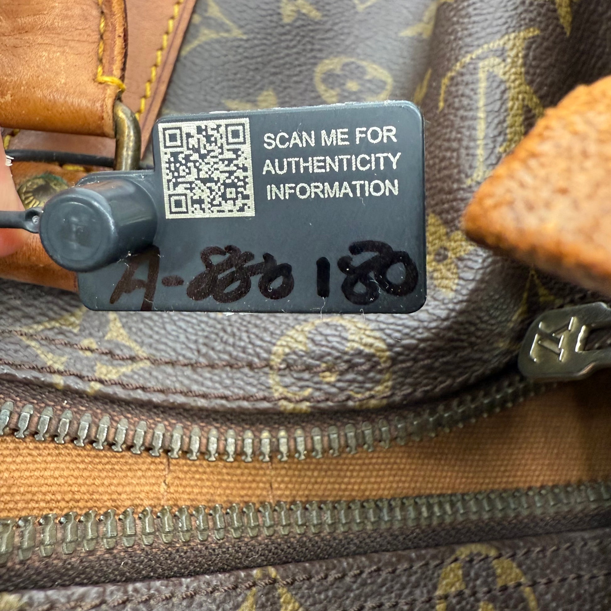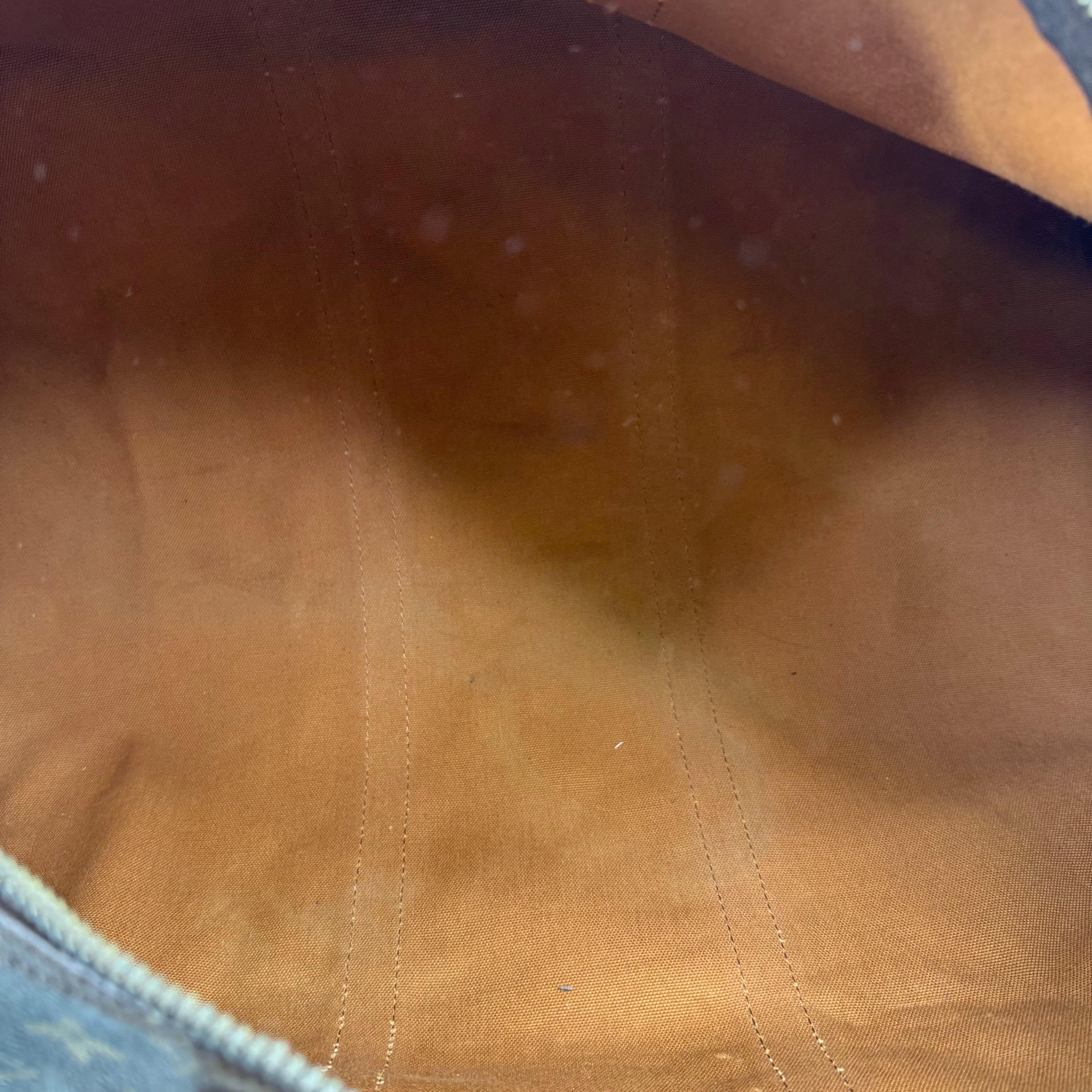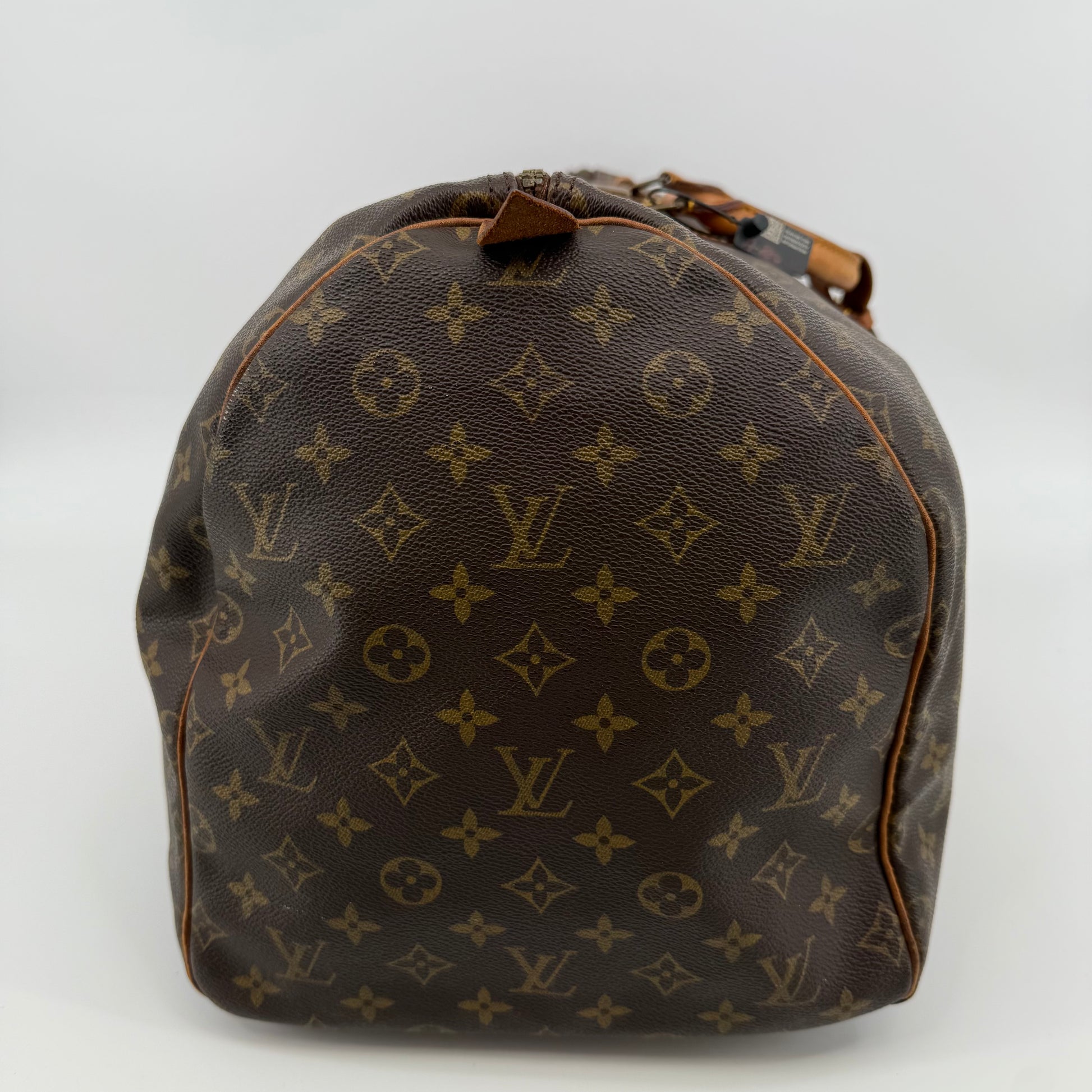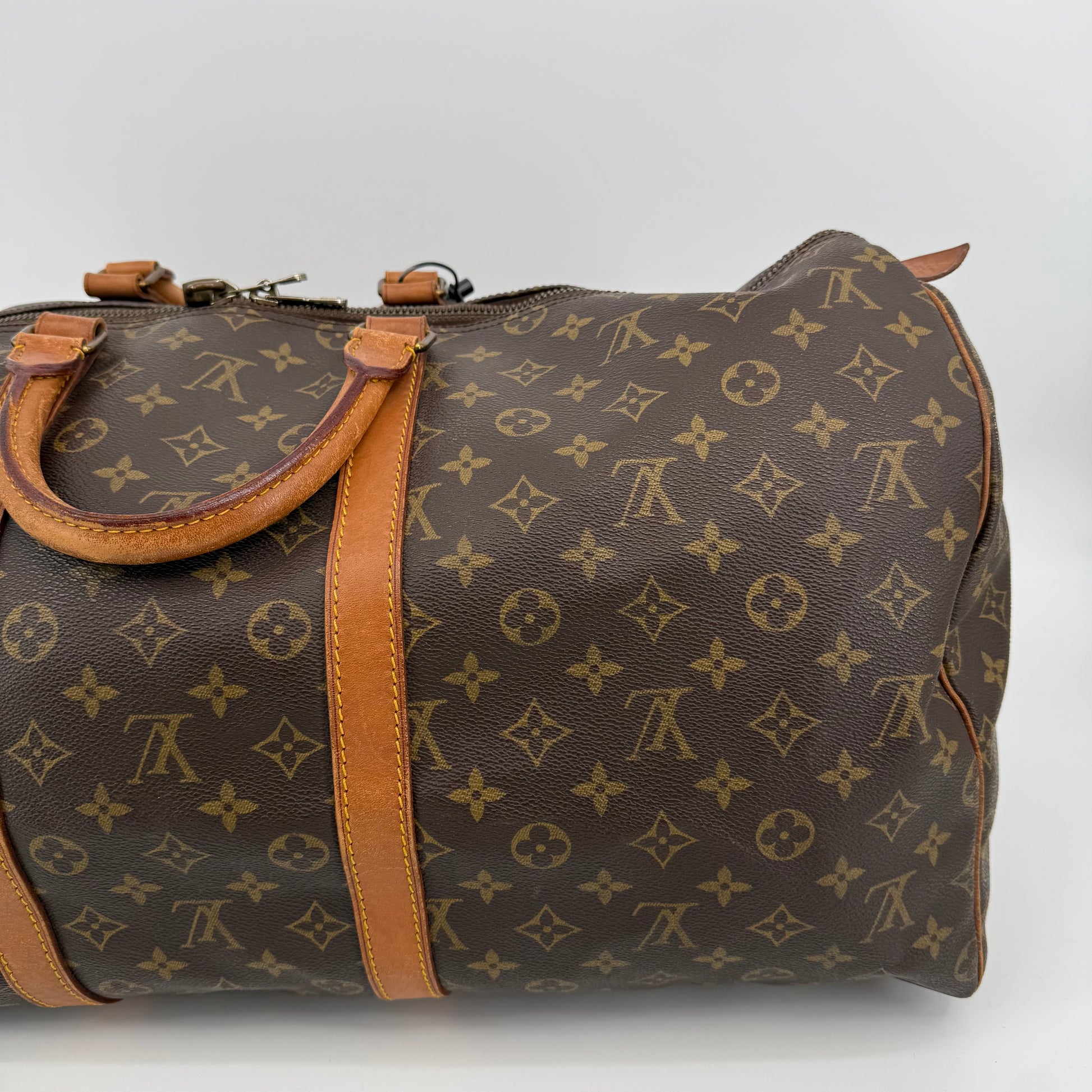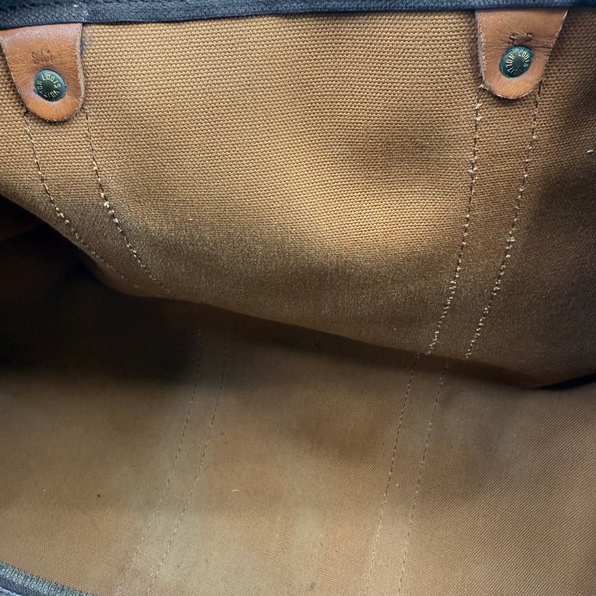 Pre-owned Louis Vuitton Monogram Keepall 55 in classic coated canvas with Vachetta leather accents. Designed with rolled leather handles, zip closure and a roomy interior perfect for travel. Displays typical ageing and wear to the leather and hardware, yet the structure is sound and the bag remains reliable and ready for use.
