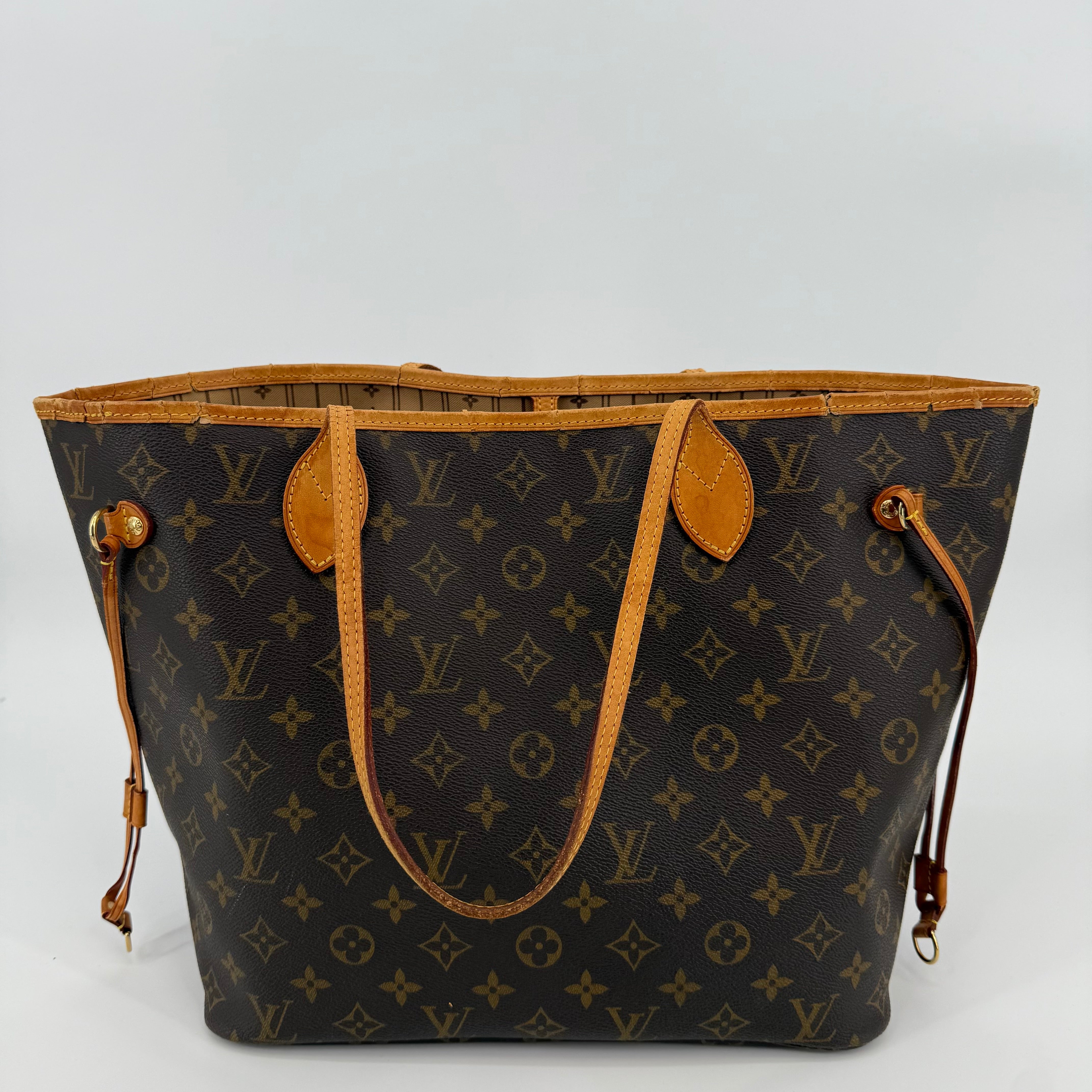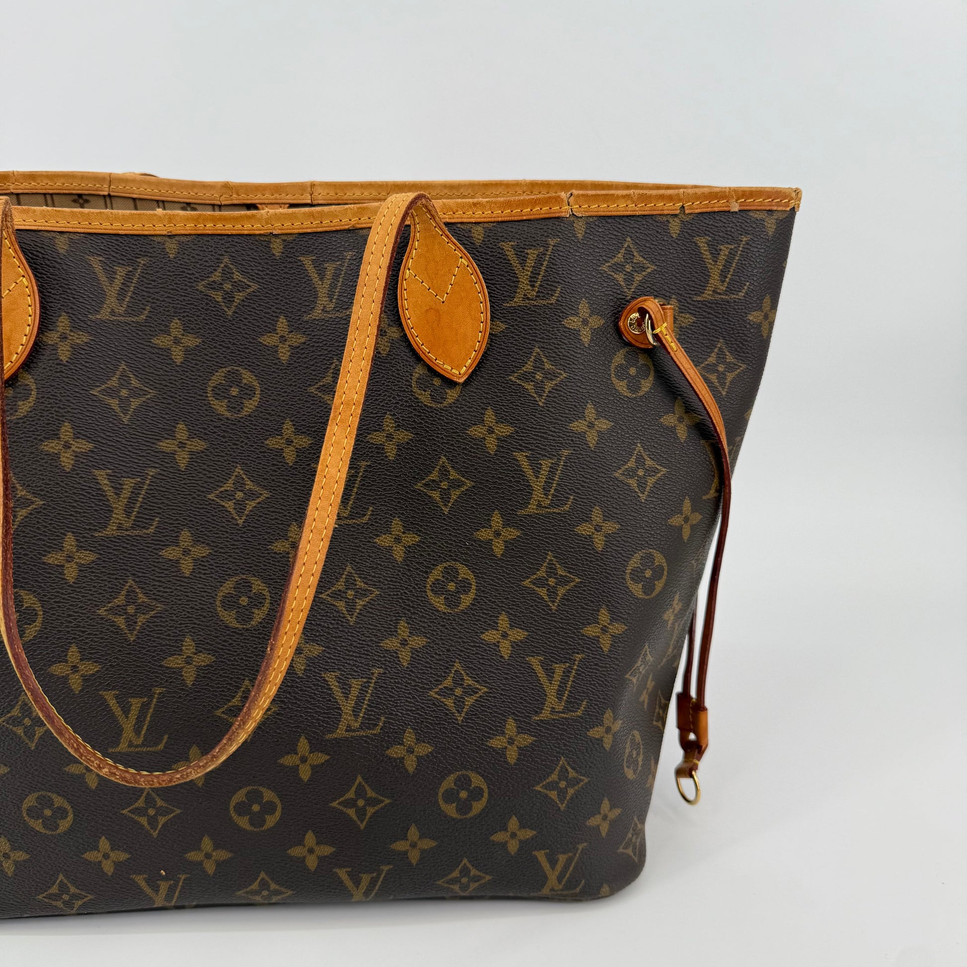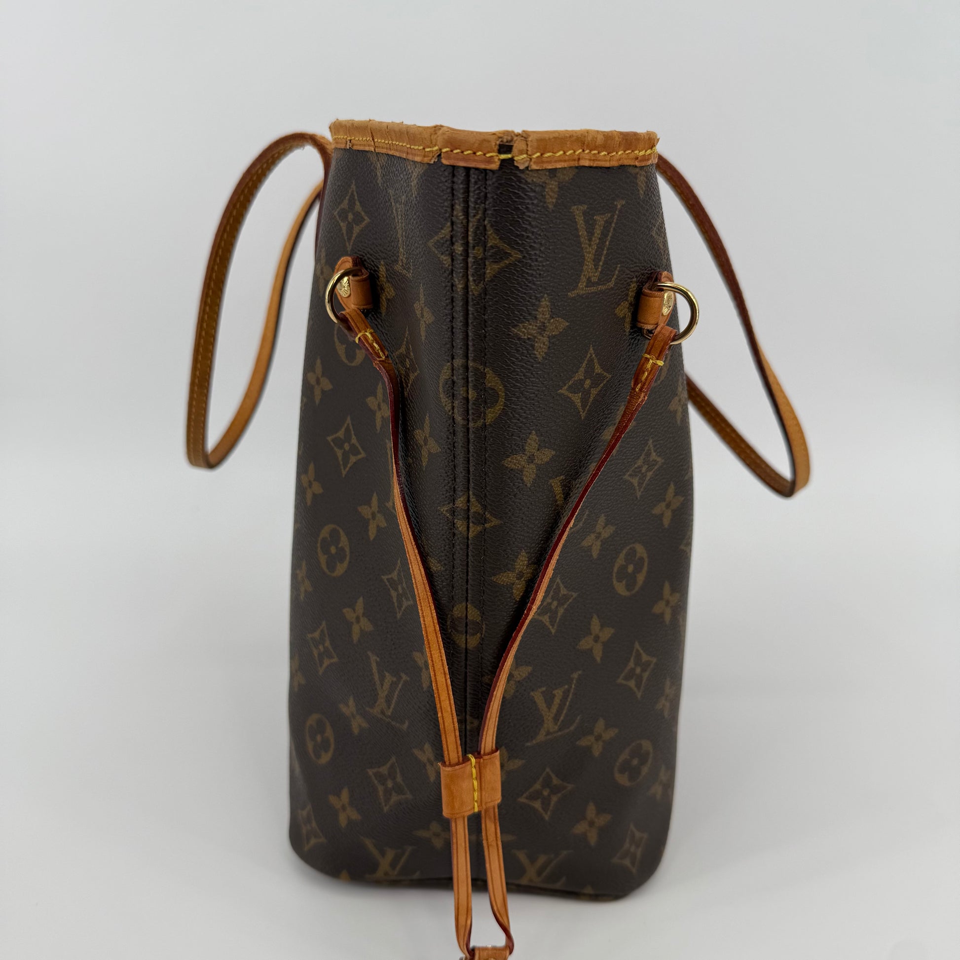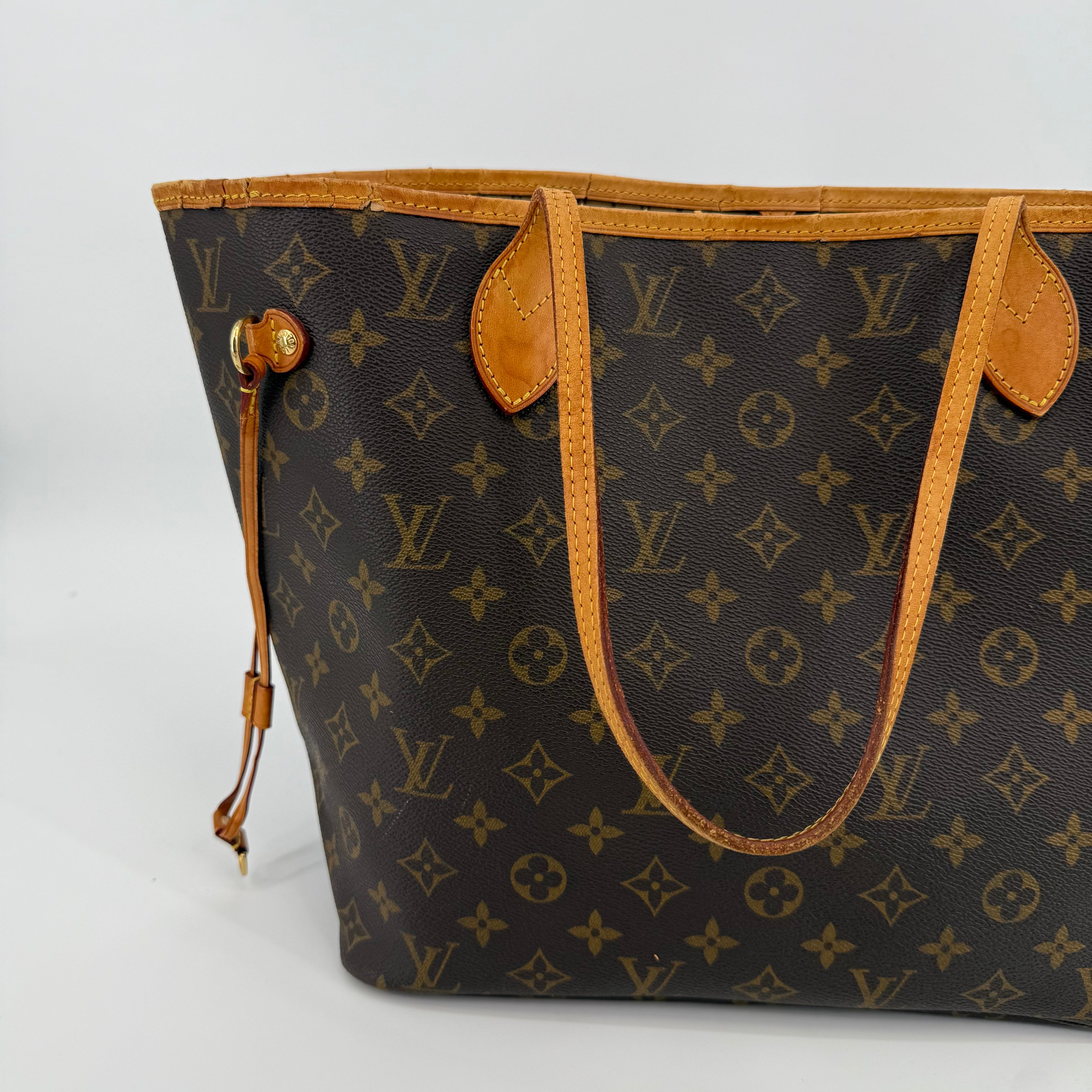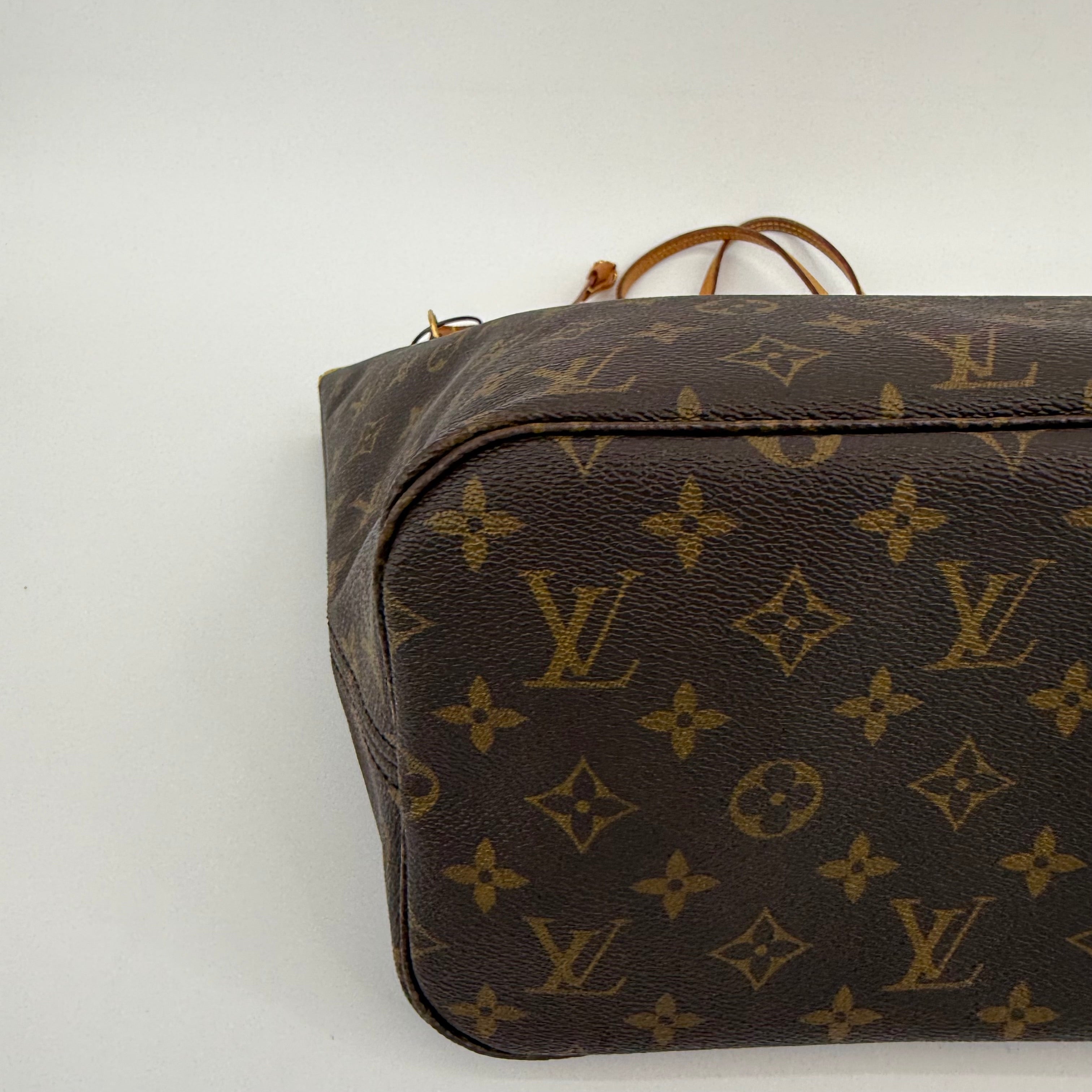 This Louis Vuitton Monogram Neverfull MM features the classic brown monogram canvas with dark brown leather trim and slim shoulder straps. The exterior shows gentle wear with a soft, relaxed shape typical of vintage Neverfulls, while still maintaining good structure. Side cinch cords and gold-tone hardware are intact. The interior is not shown in this specific image, so condition may need separate detailing if required. A timeless everyday tote in the highly sought-after MM size.