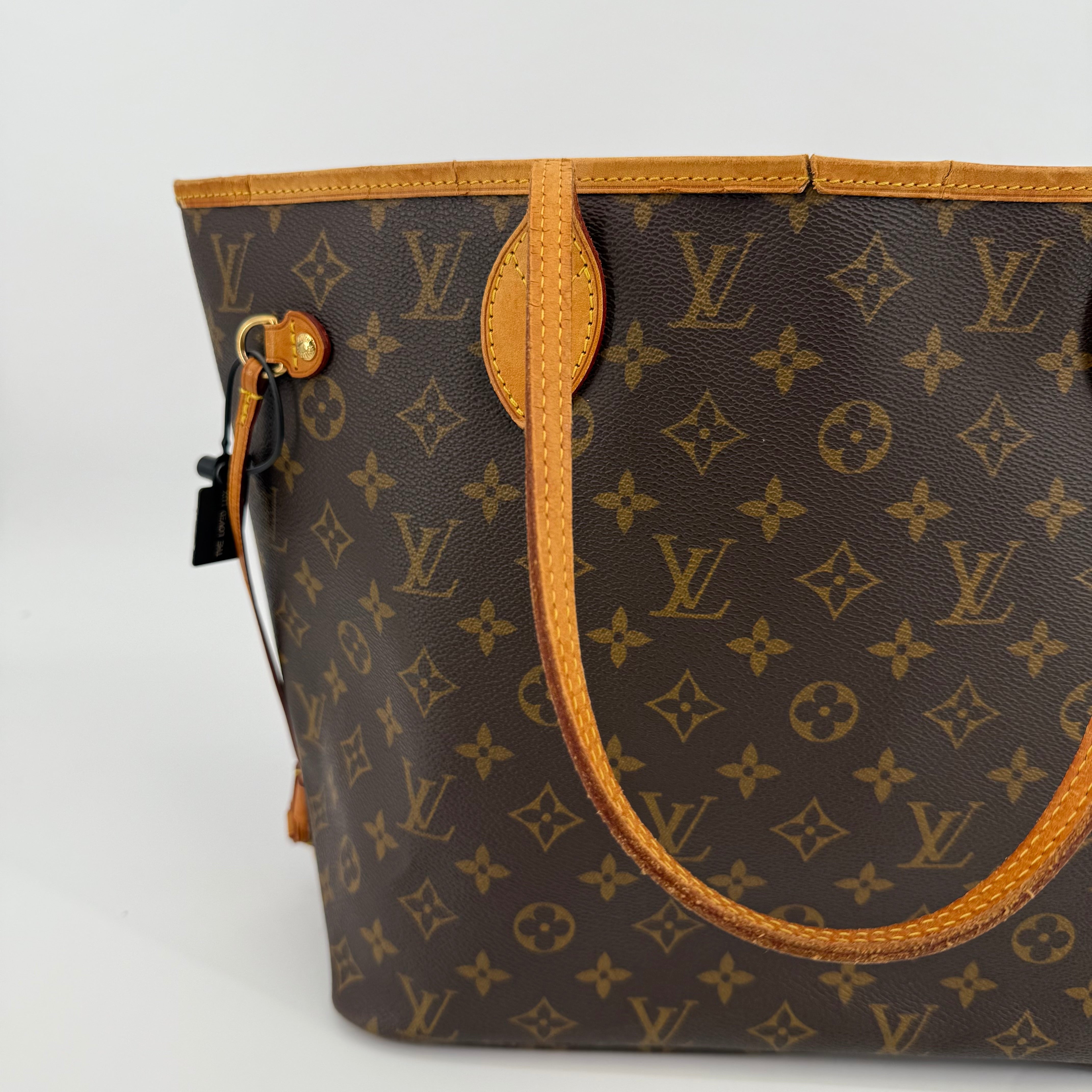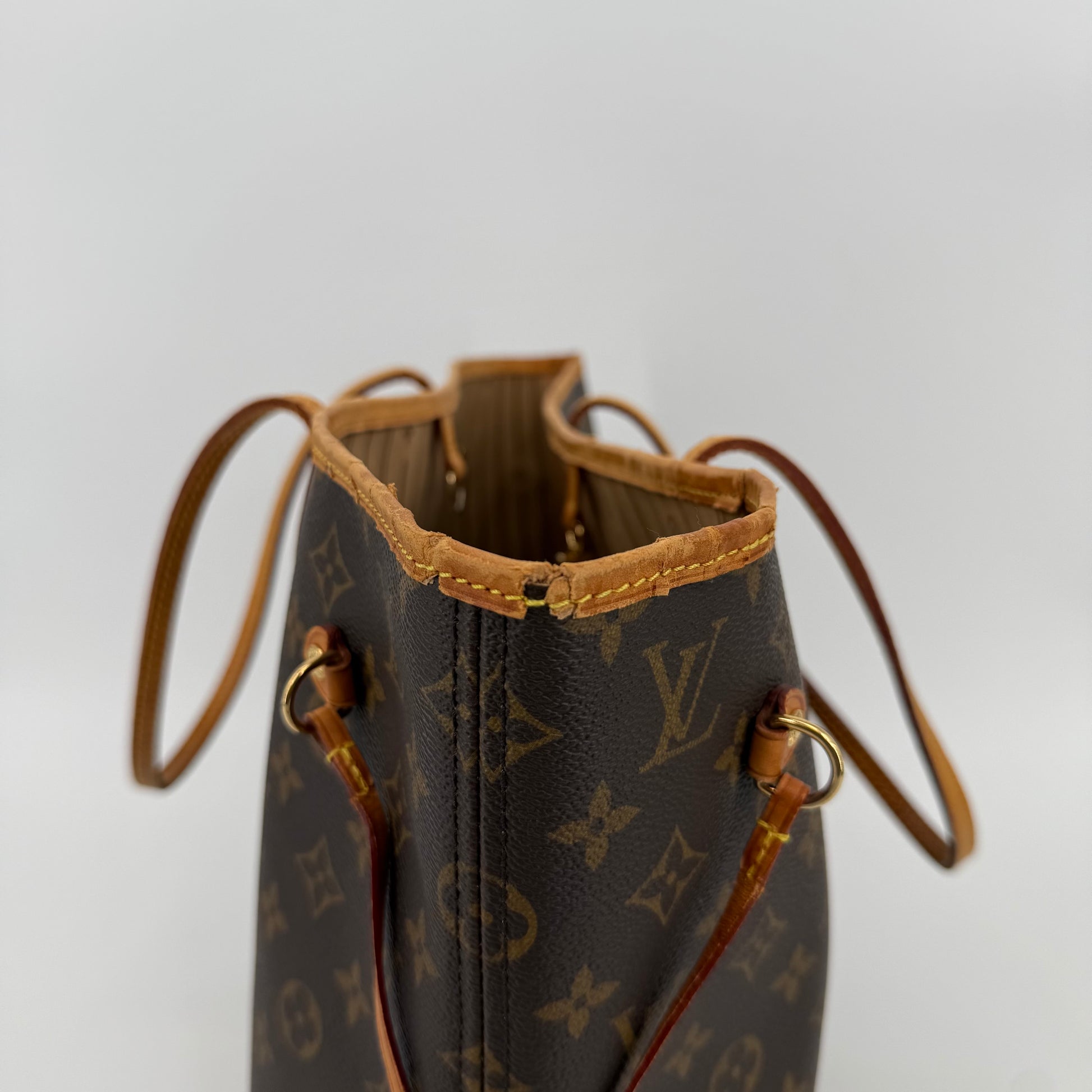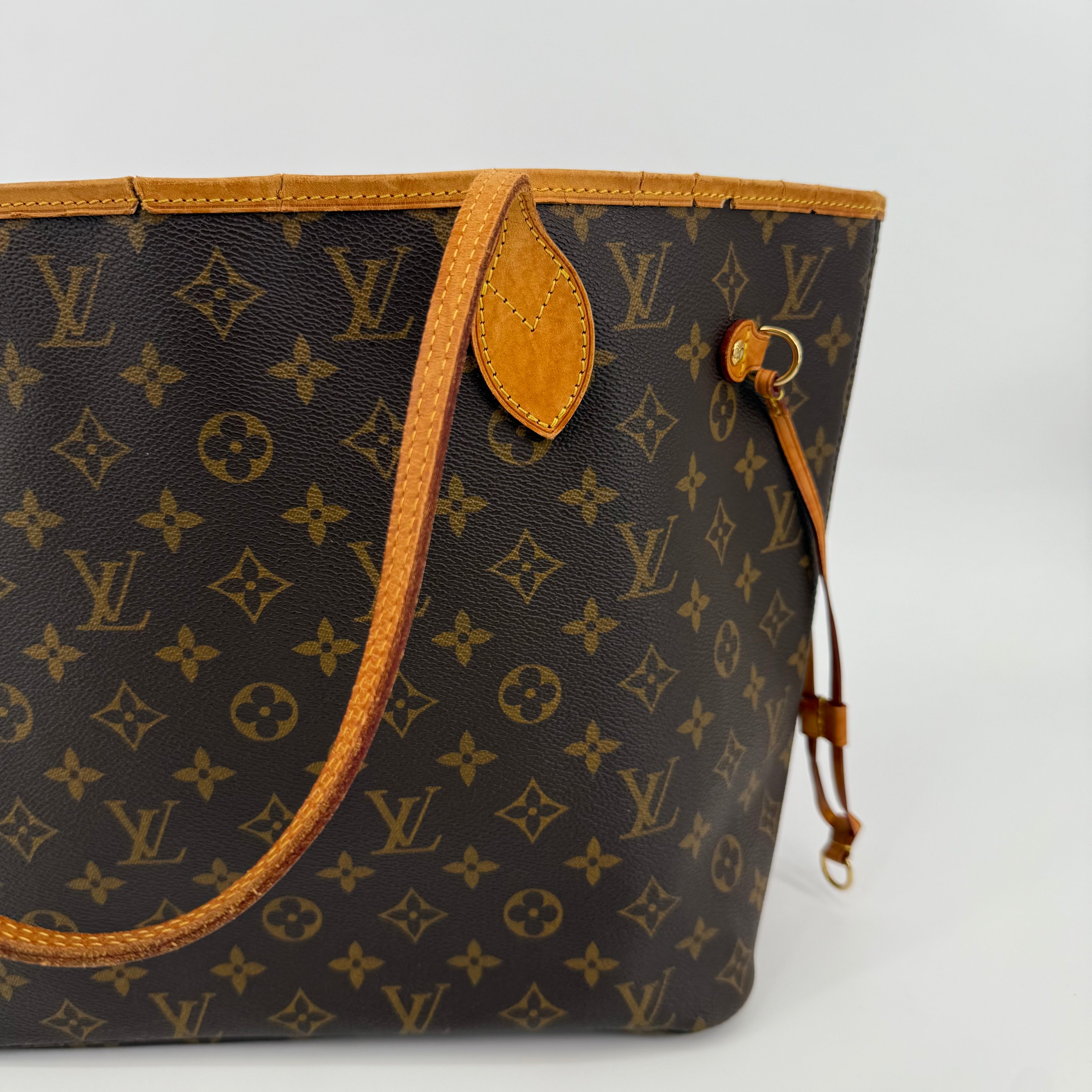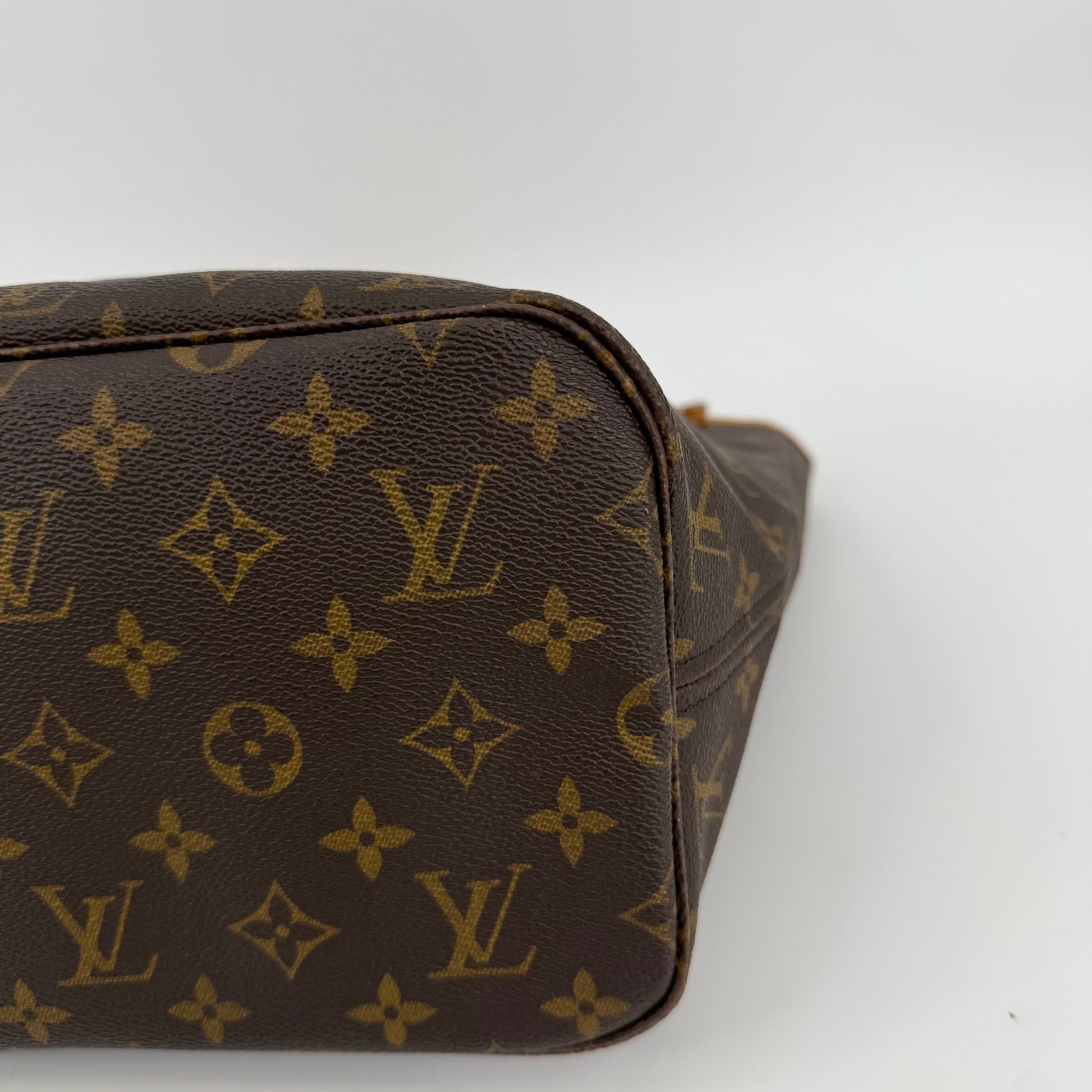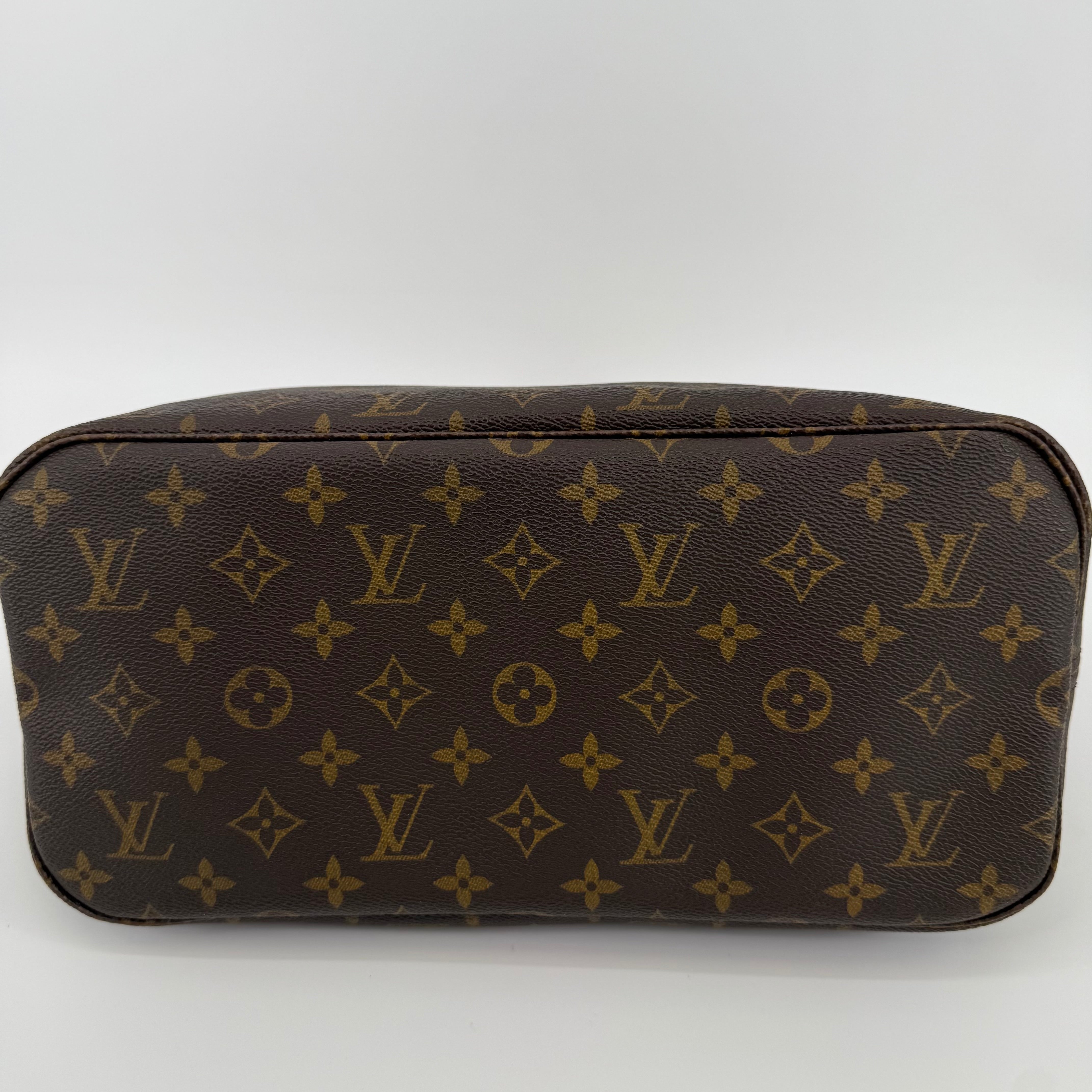 This Louis Vuitton Monogram Neverfull MM features the classic brown monogram canvas with dark brown leather trim and slim shoulder straps. The exterior shows gentle wear with a soft, relaxed shape typical of vintage Neverfulls, while still maintaining good structure. Side cinch cords and gold-tone hardware are intact. The interior is not shown in this specific image, so condition may need separate detailing if required. A timeless everyday tote in the highly sought-after MM size.