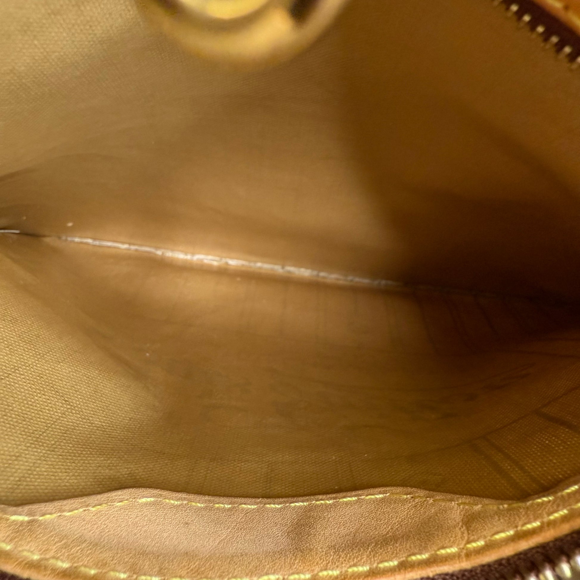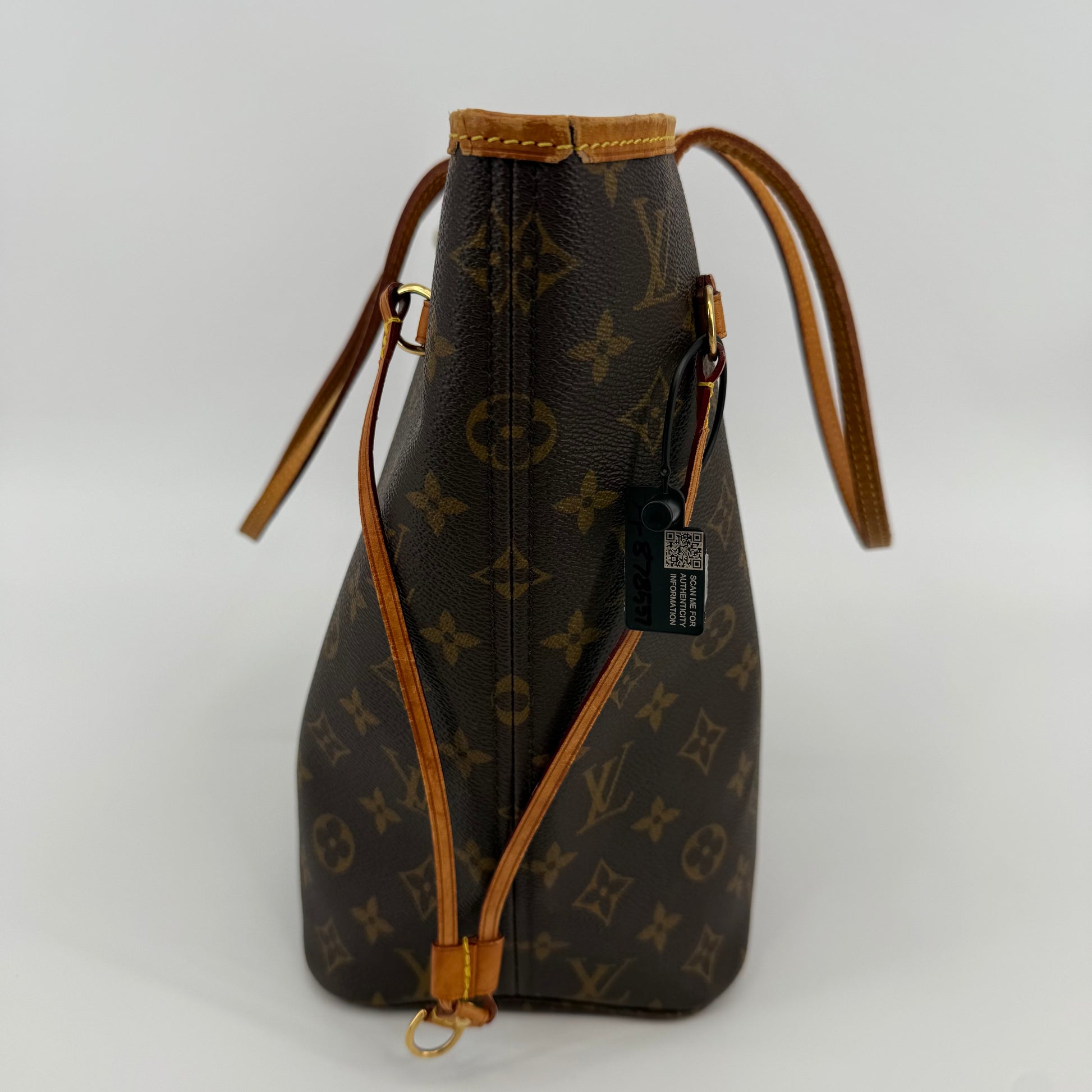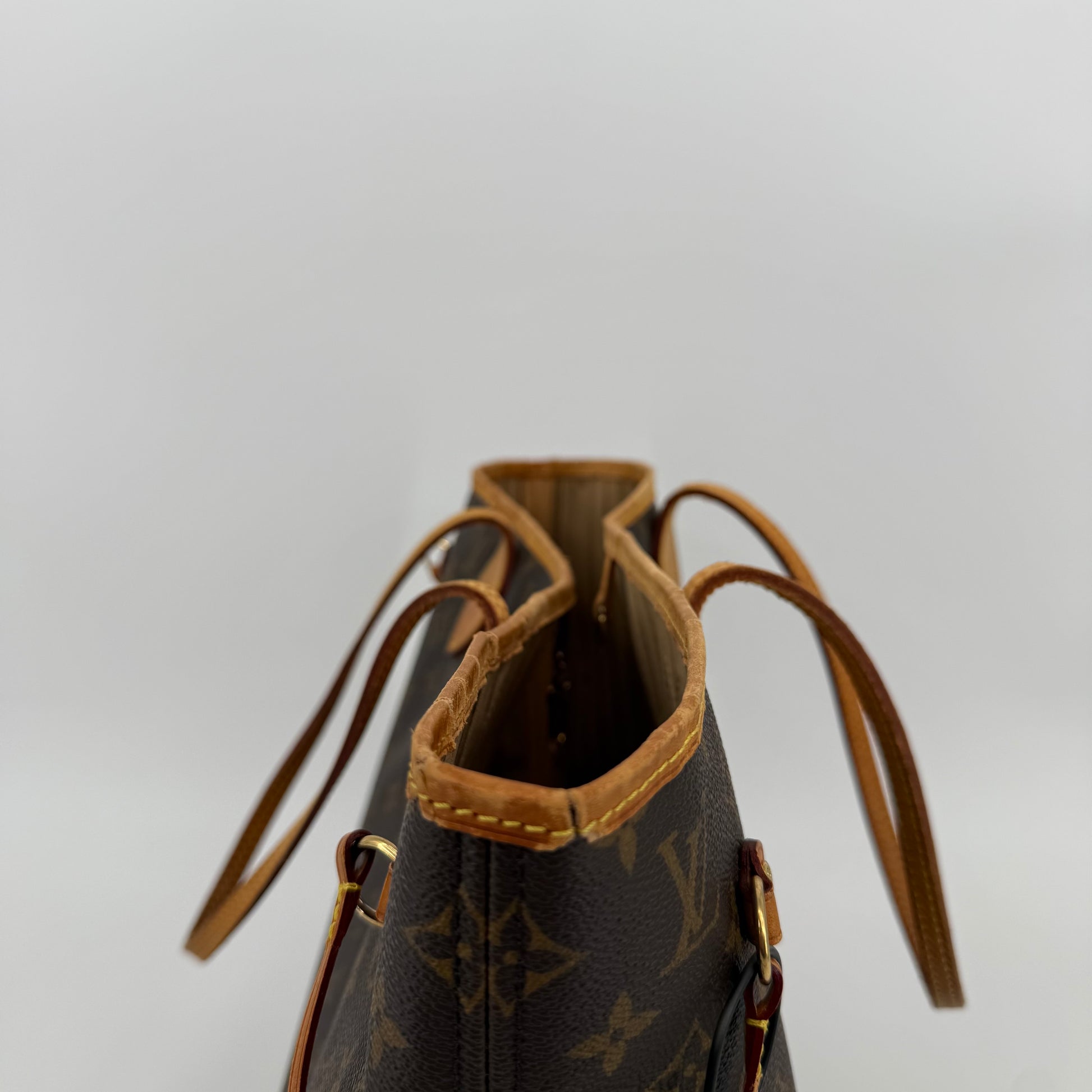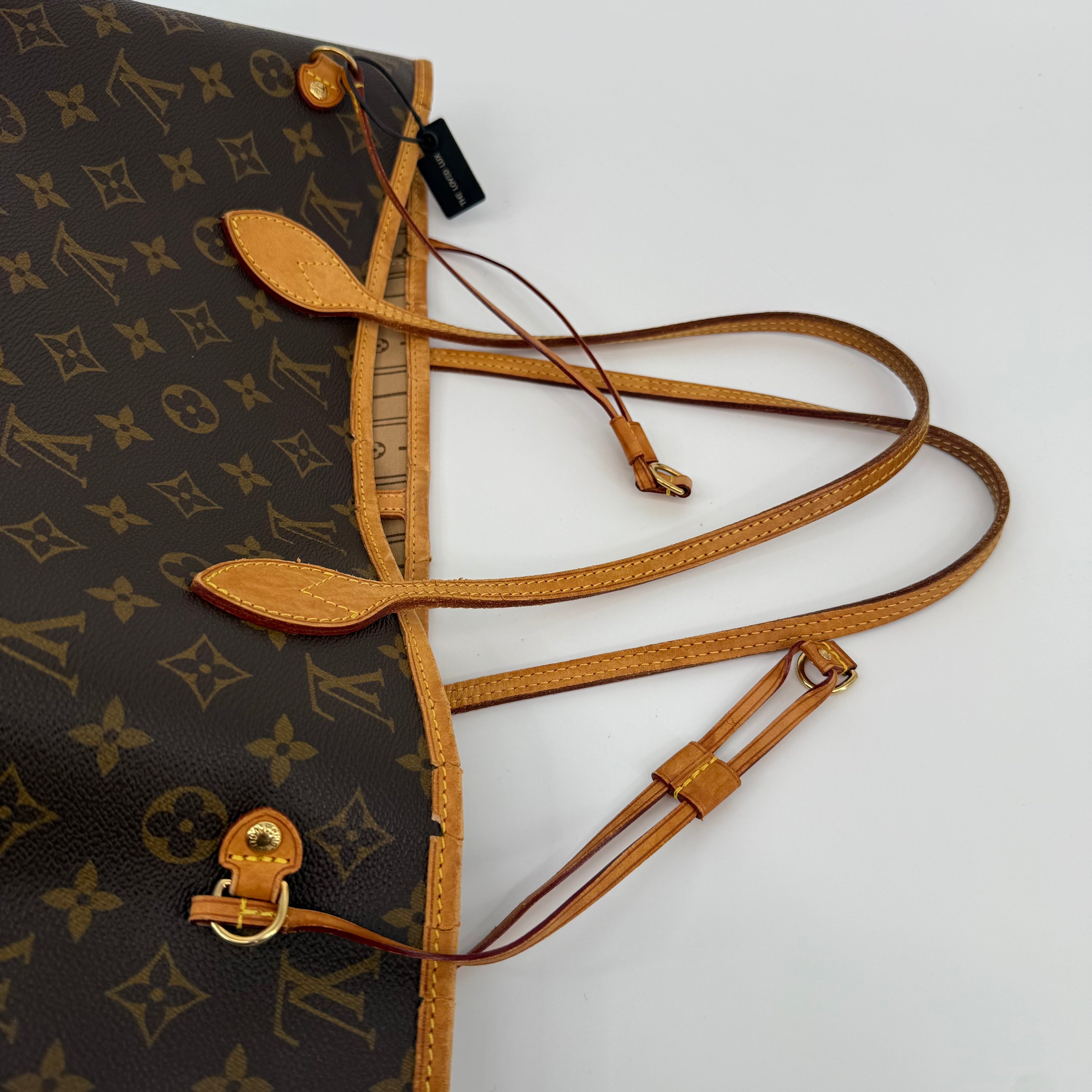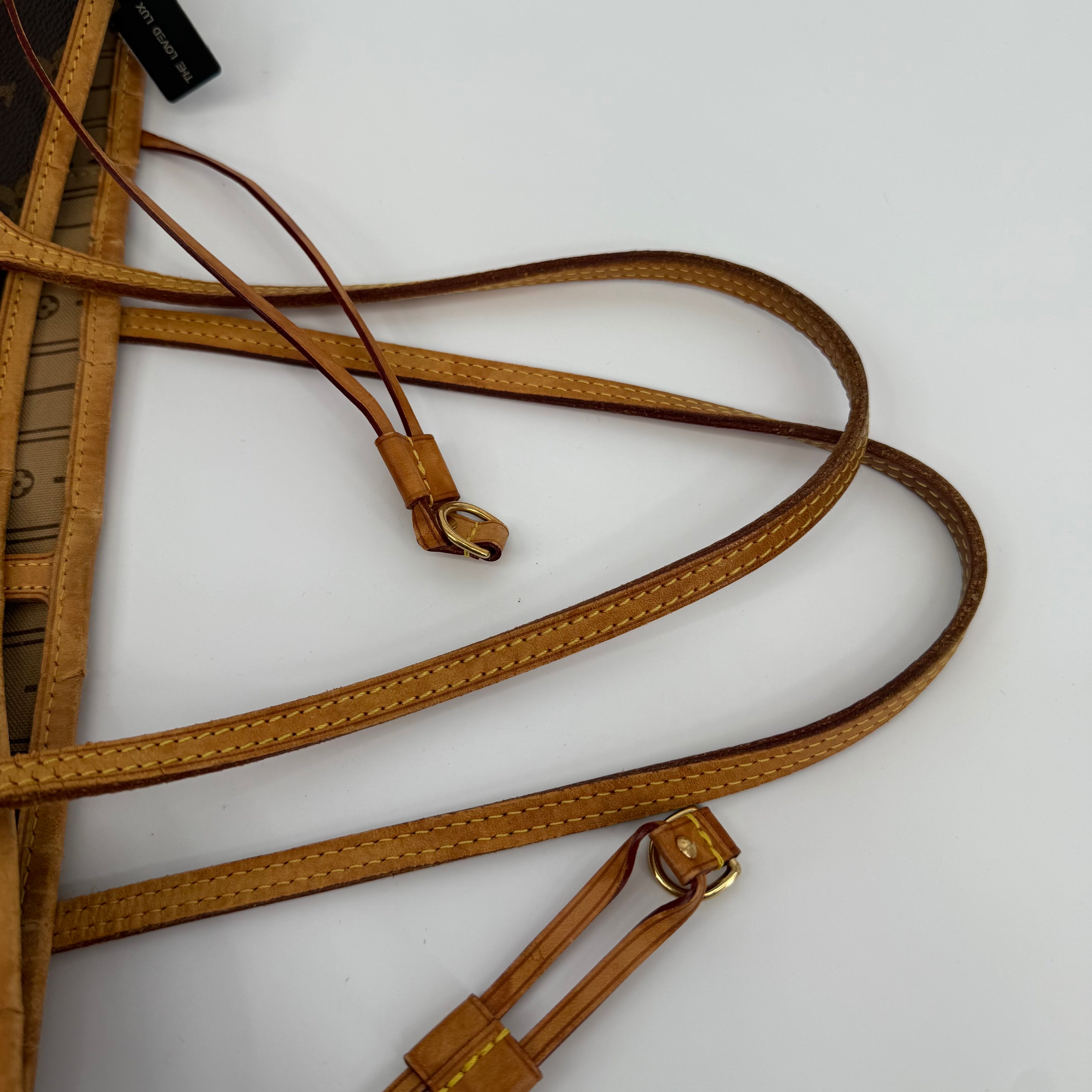 This Louis Vuitton Monogram Neverfull MM features the classic brown monogram canvas with dark brown leather trim and slim shoulder straps. The exterior shows gentle wear with a soft, relaxed shape typical of vintage Neverfulls, while still maintaining good structure. Side cinch cords and gold-tone hardware are intact. The interior is not shown in this specific image, so condition may need separate detailing if required. A timeless everyday tote in the highly sought-after MM size.