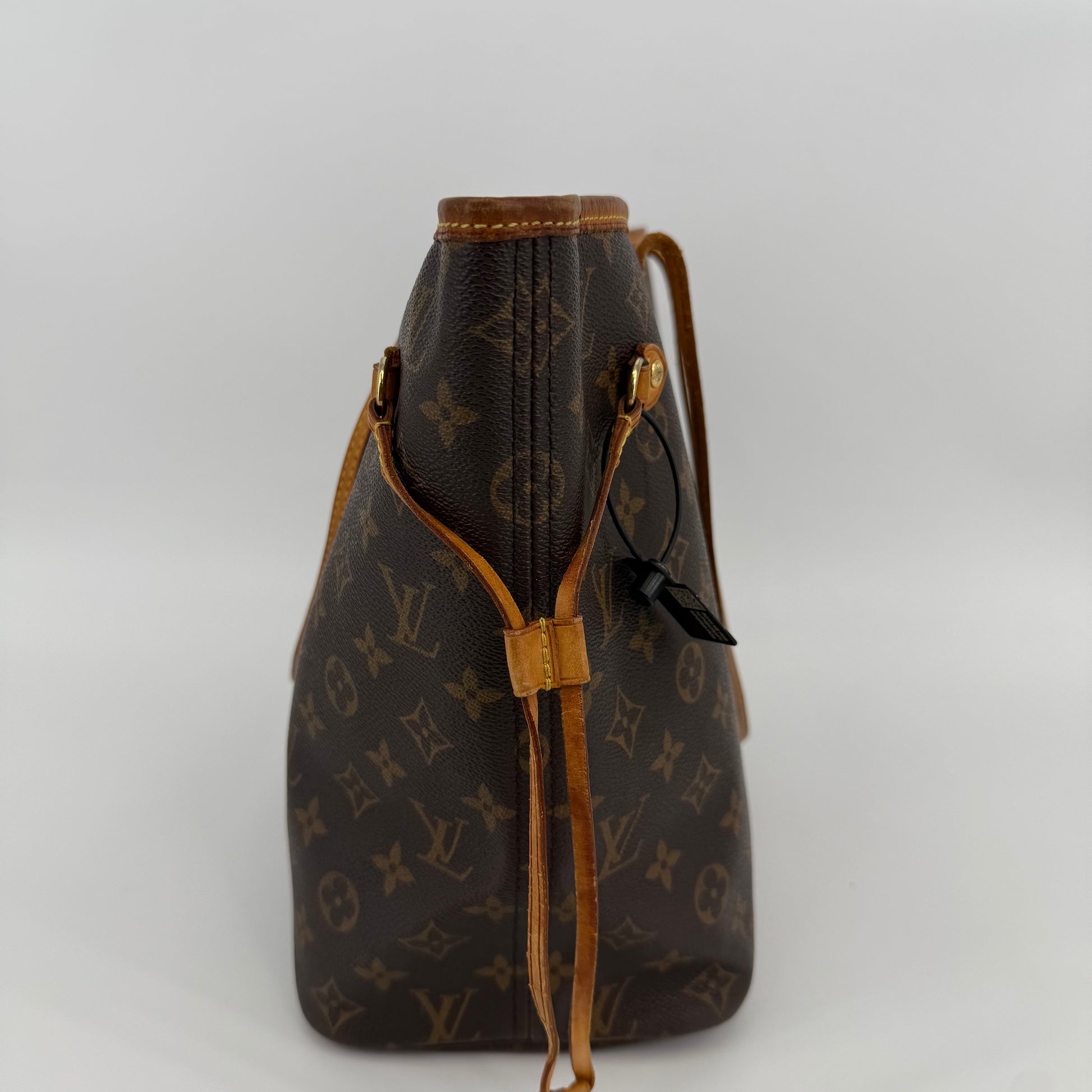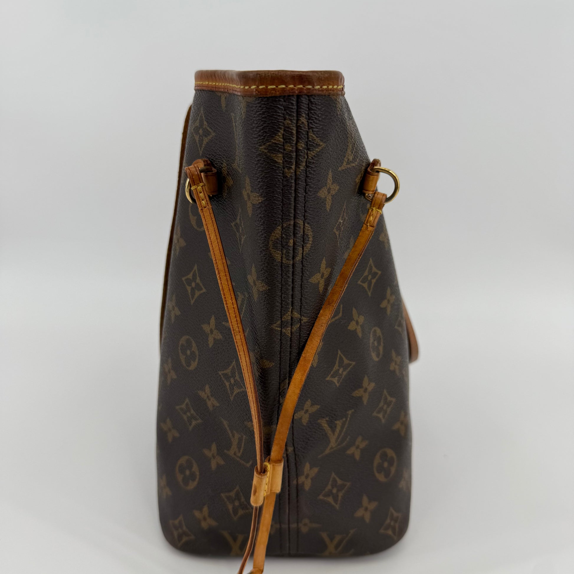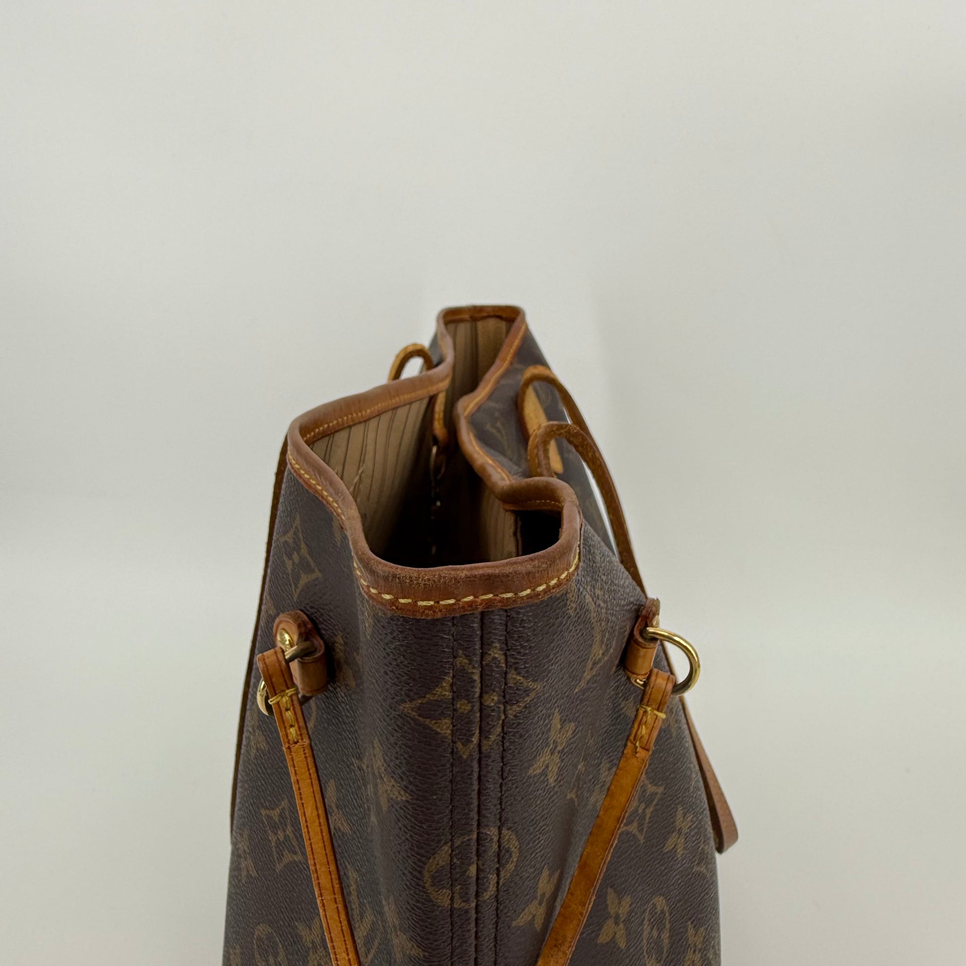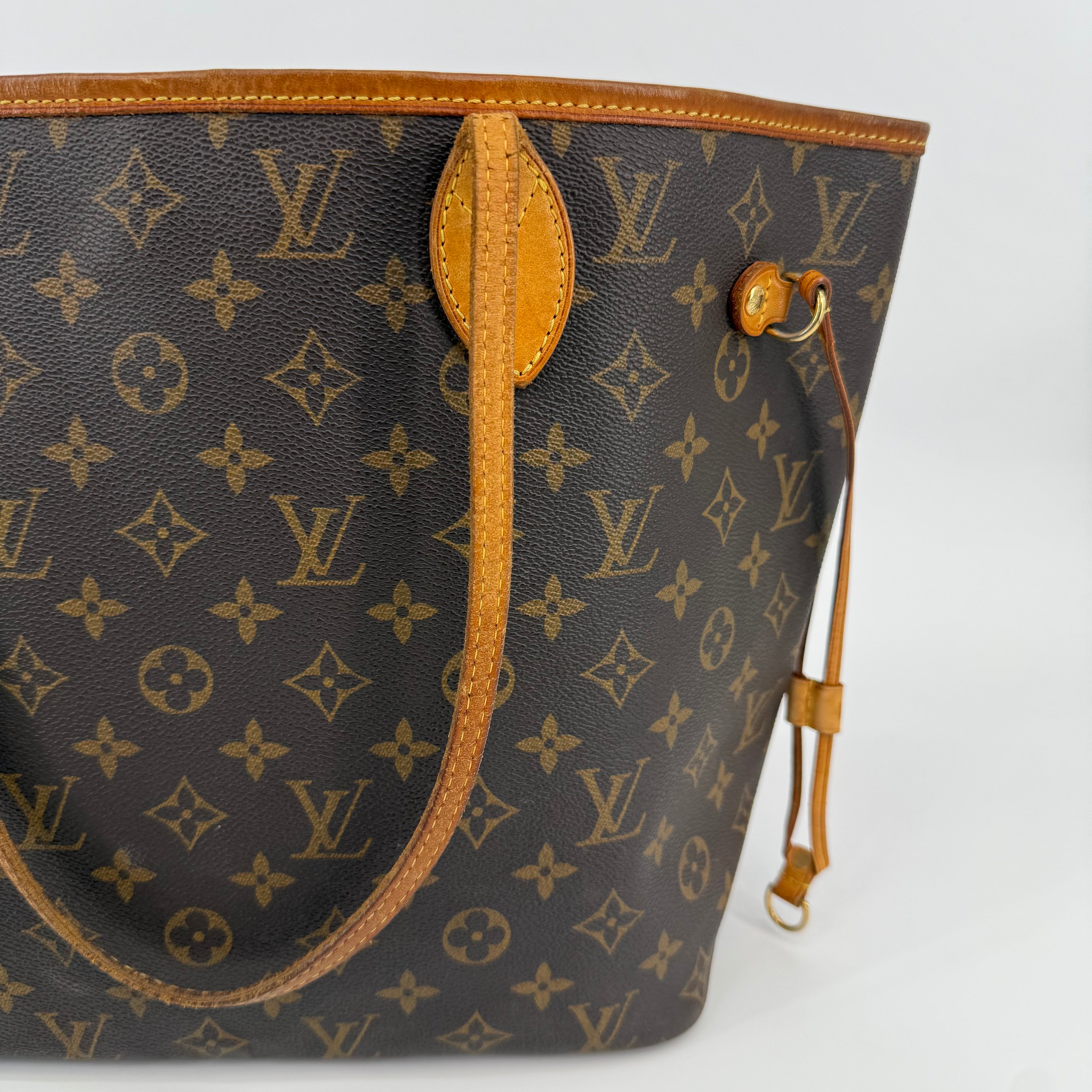 Louis Vuitton Monogram Neverfull MM in classic brown coated canvas with natural vachetta leather trim and shoulder straps. Features adjustable side laces to alter the shape, gold-tone hardware, and a spacious open interior with a striped lining and zip pocket. Lightweight, durable, and iconic—perfect for everyday carry with moderate, age-appropriate wear.