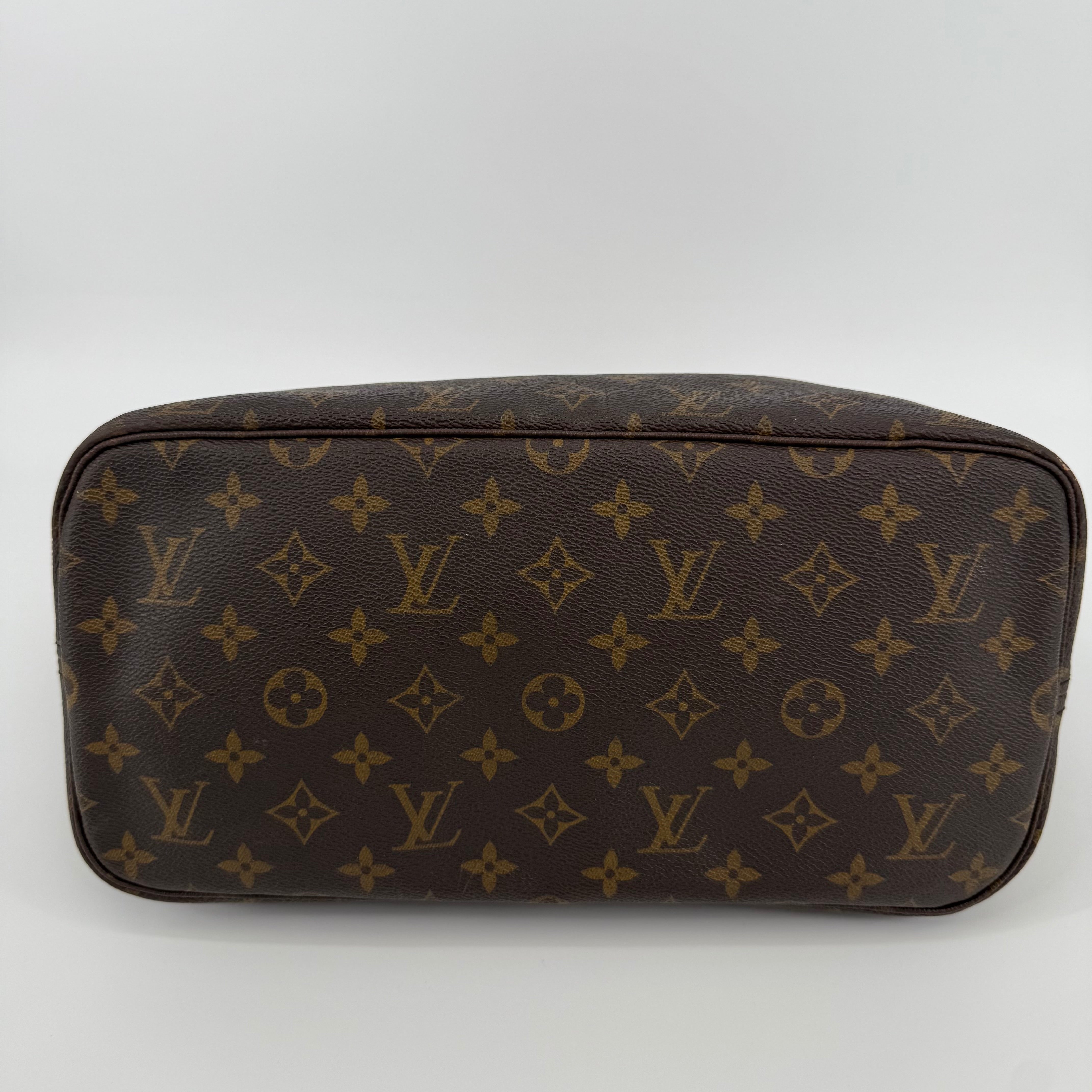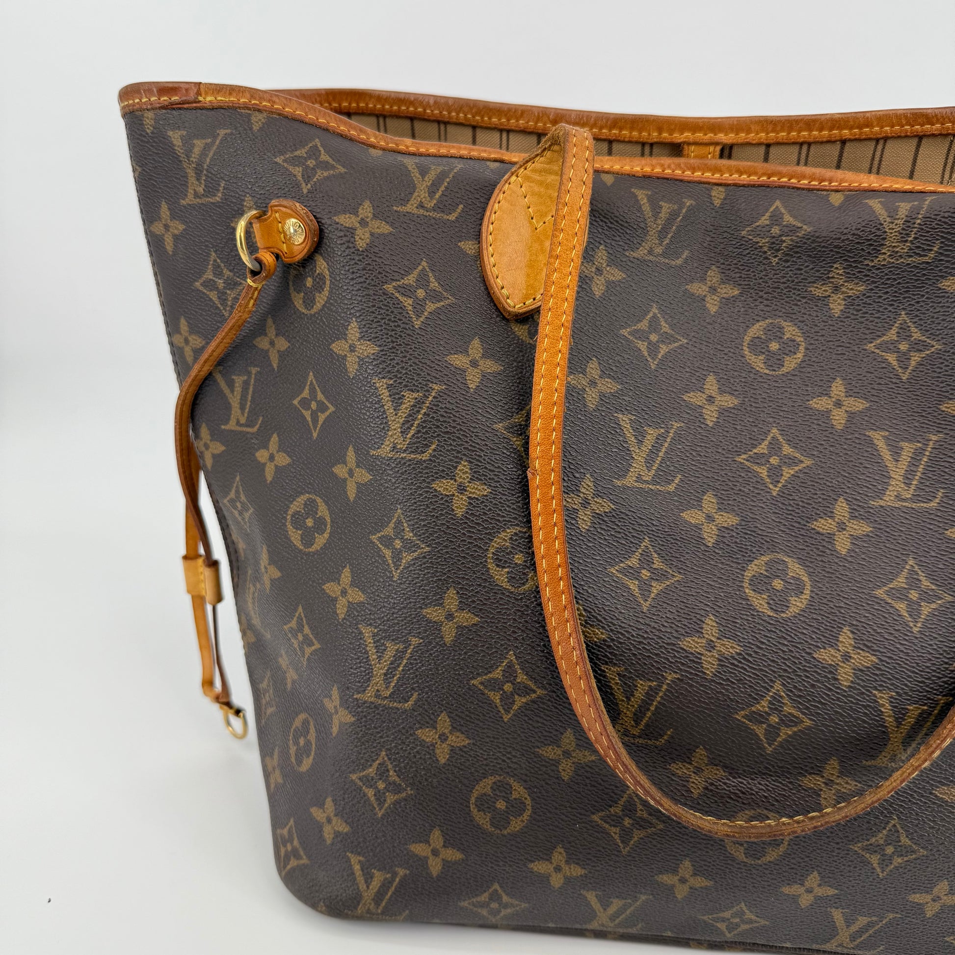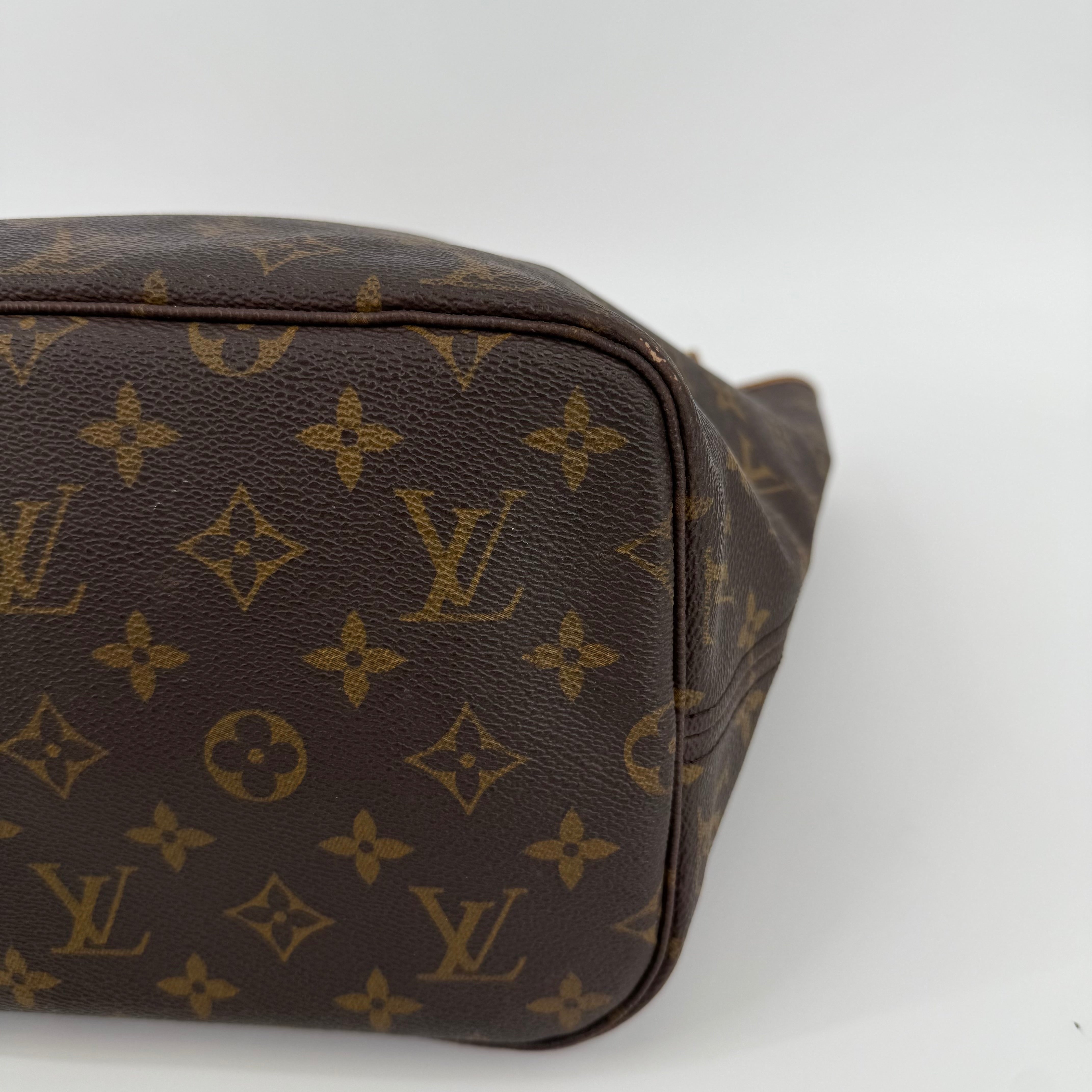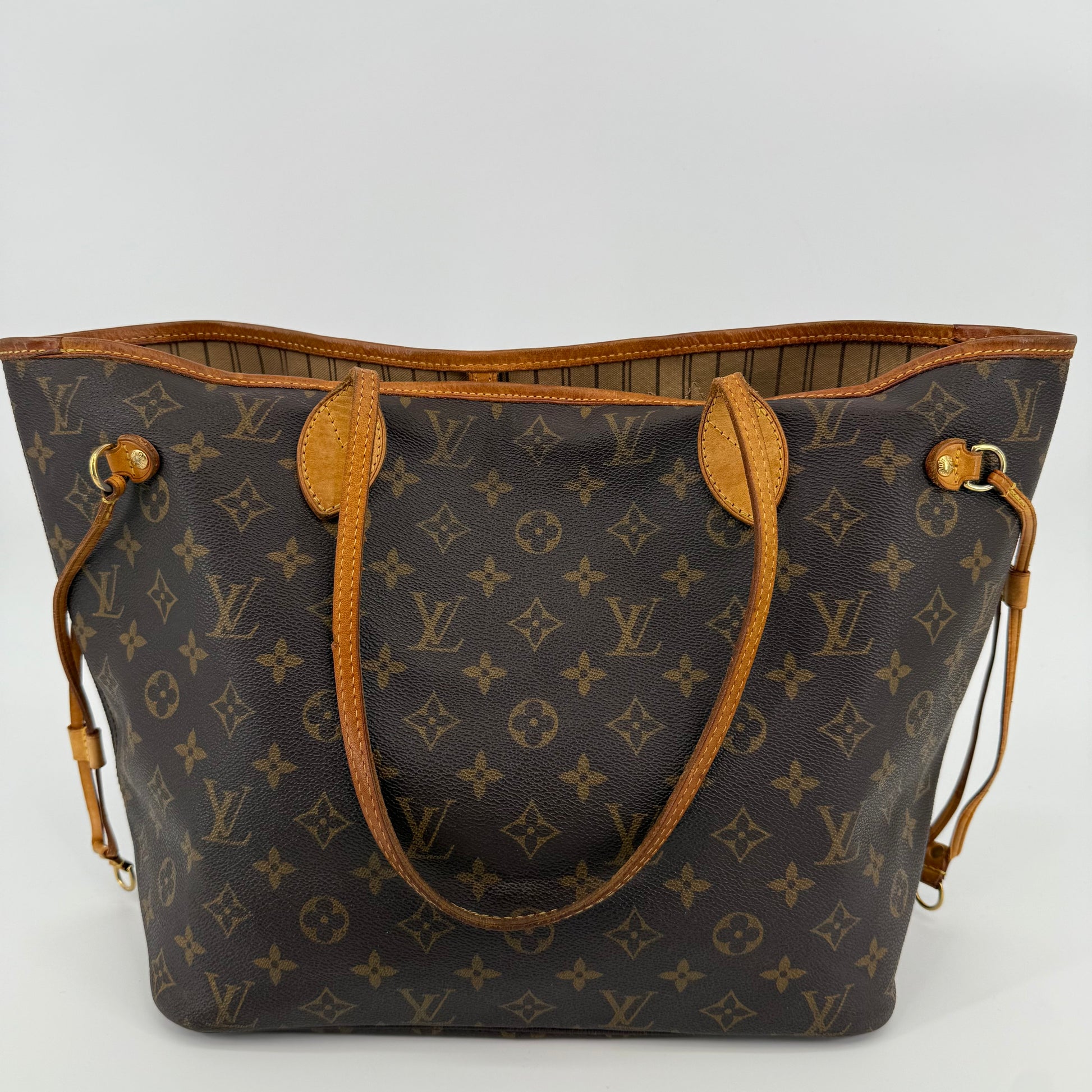 Louis Vuitton Monogram Neverfull MM in classic brown coated canvas with natural vachetta leather trim and shoulder straps. Features adjustable side laces to alter the shape, gold-tone hardware, and a spacious open interior with a striped lining and zip pocket. Lightweight, durable, and iconic—perfect for everyday carry with moderate, age-appropriate wear.