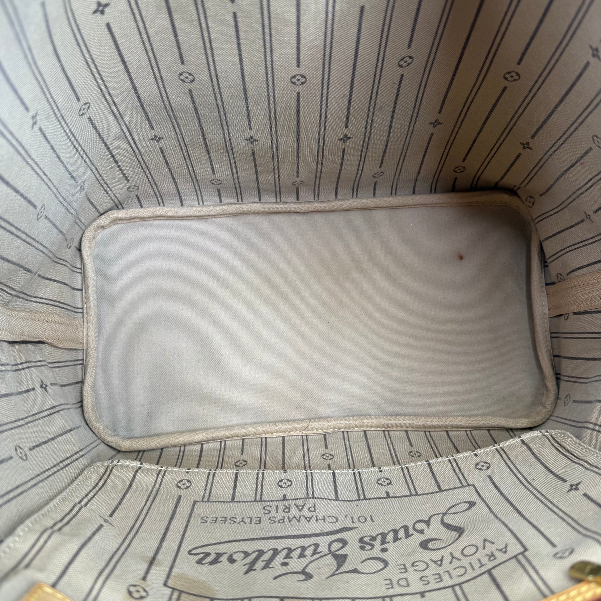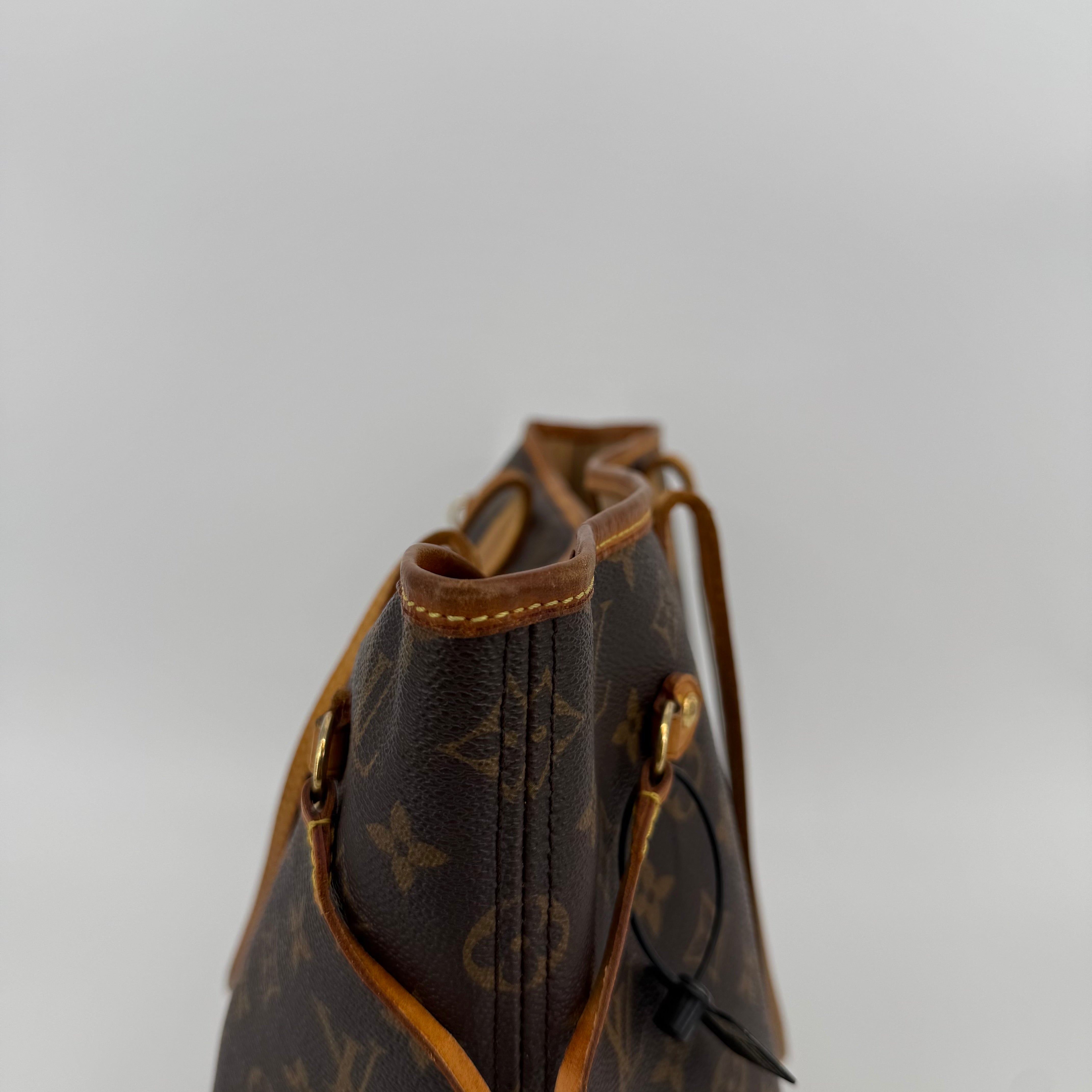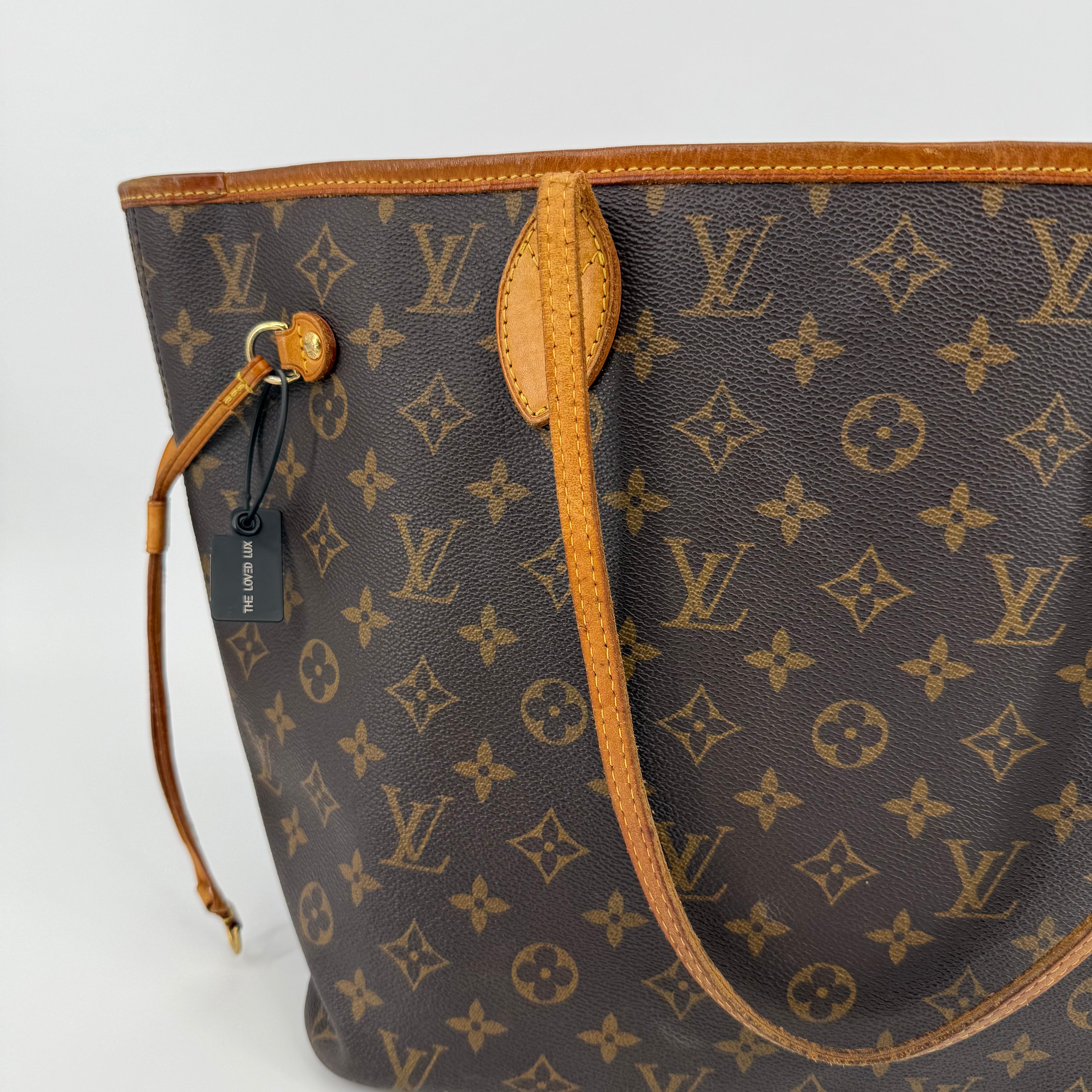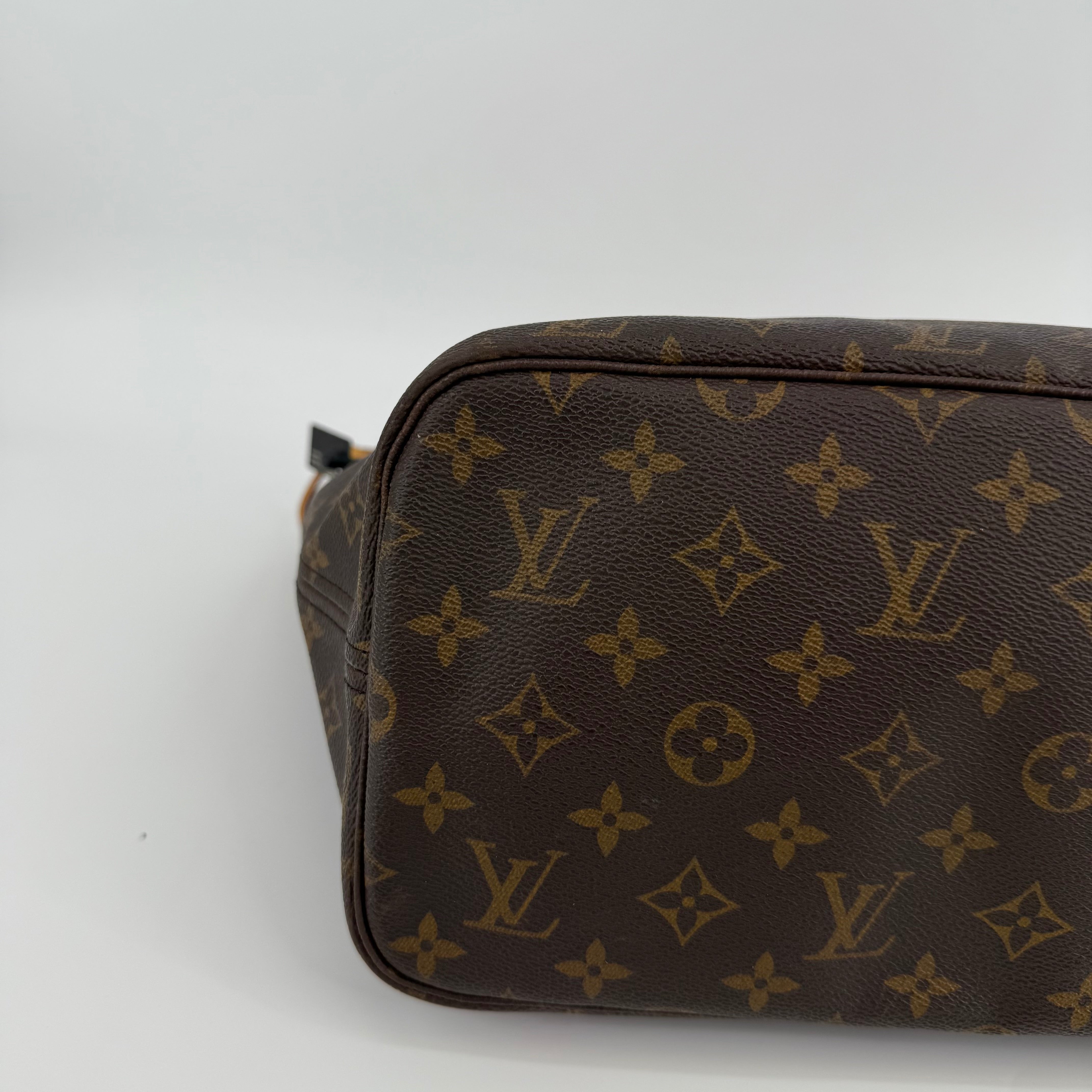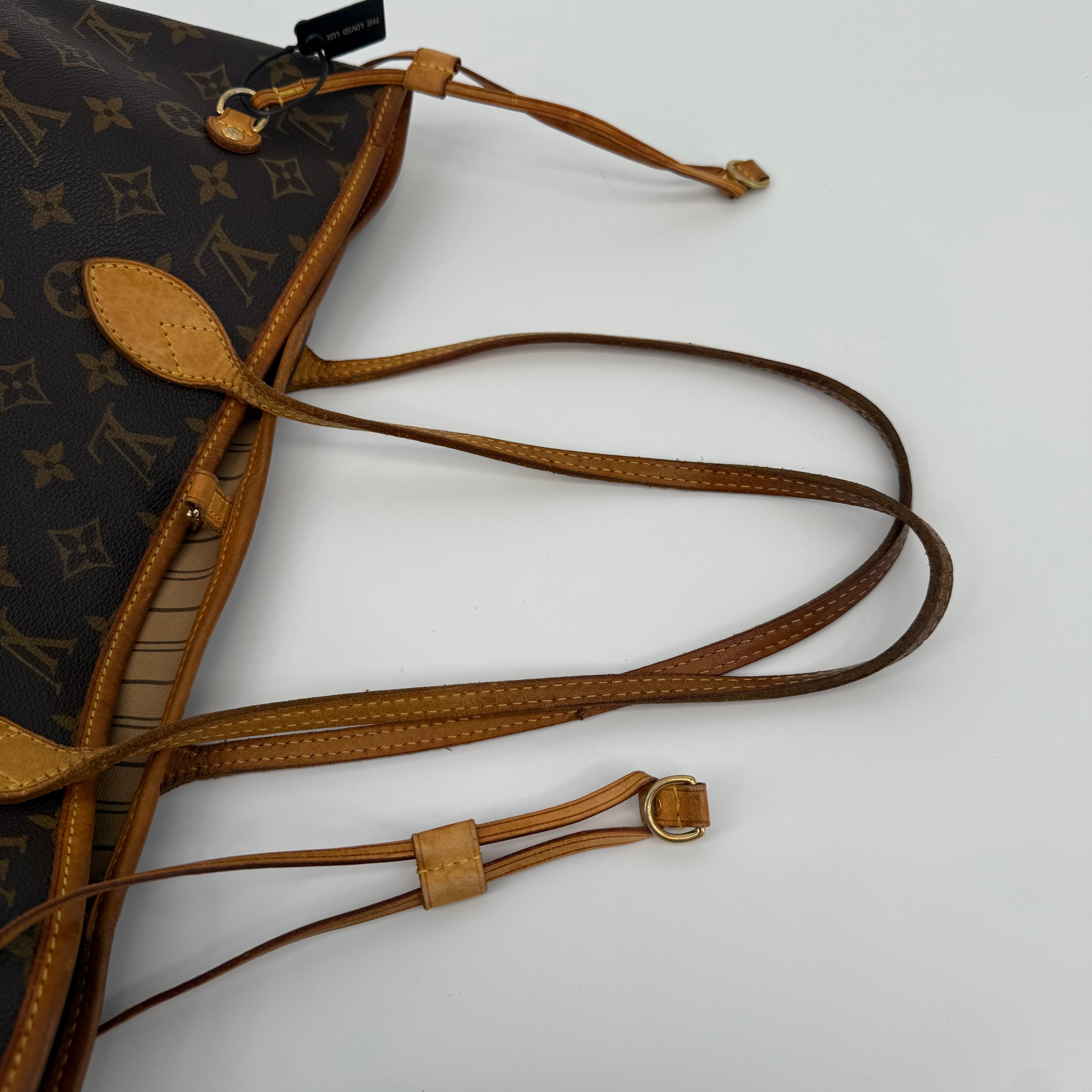 Louis Vuitton Monogram Neverfull MM in classic brown coated canvas with natural vachetta leather trim and shoulder straps. Features adjustable side laces to alter the shape, gold-tone hardware, and a spacious open interior with a striped lining and zip pocket. Lightweight, durable, and iconic—perfect for everyday carry with moderate, age-appropriate wear.