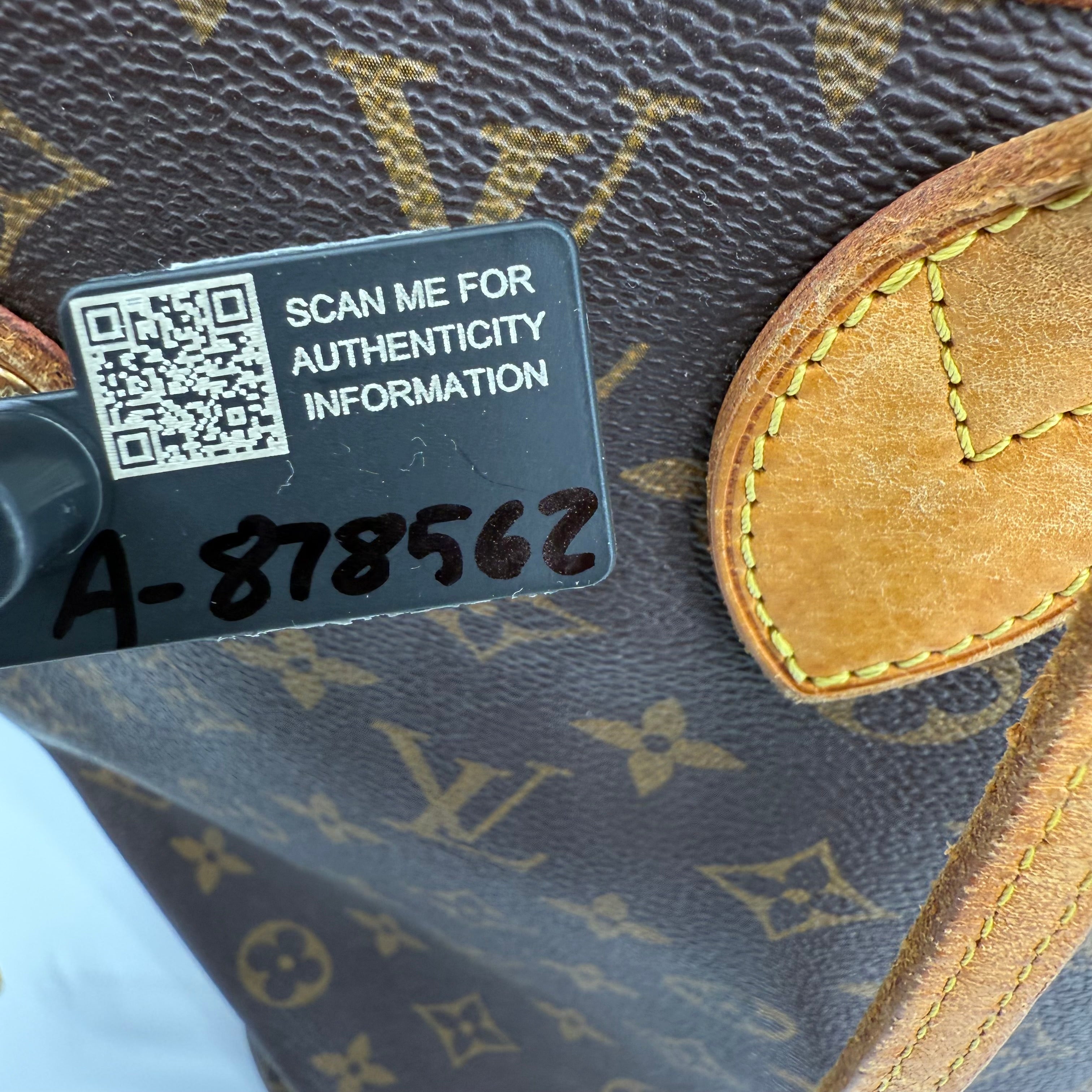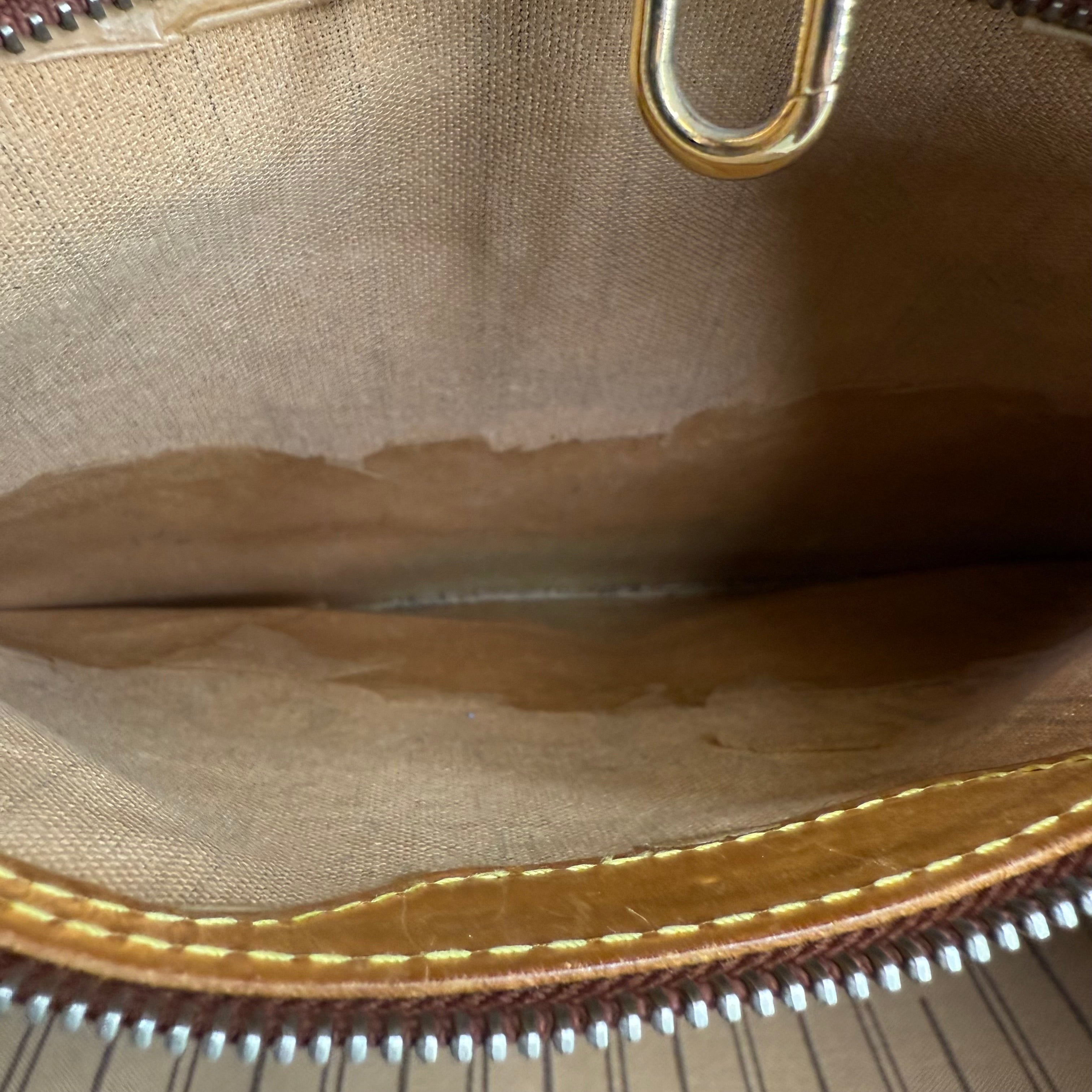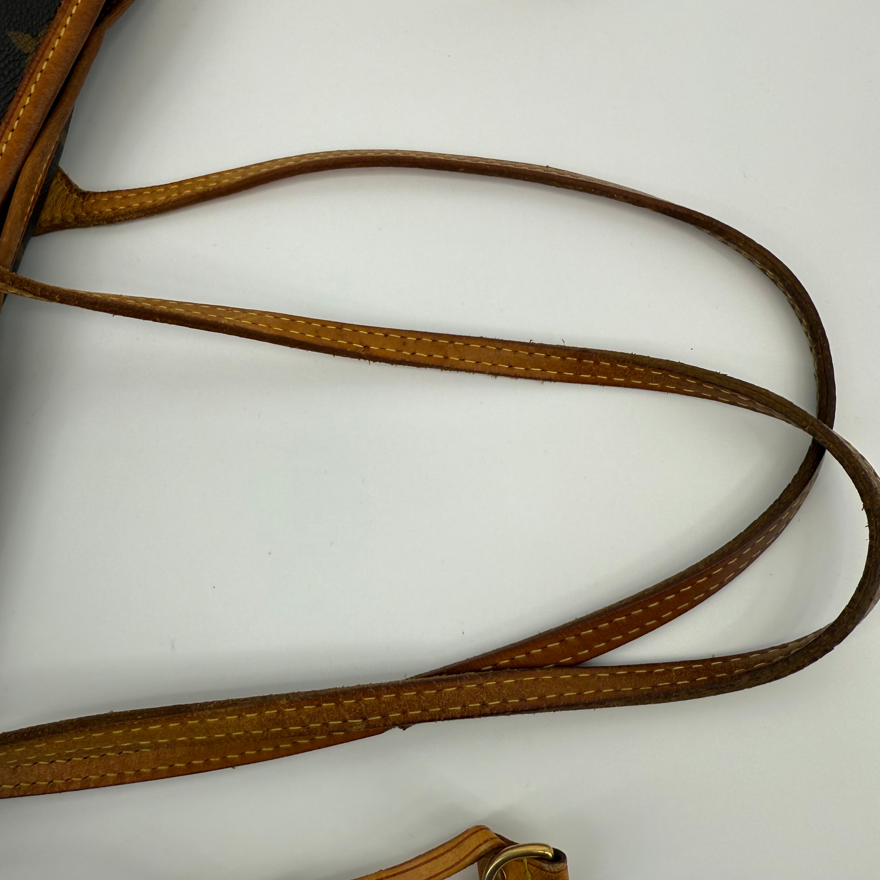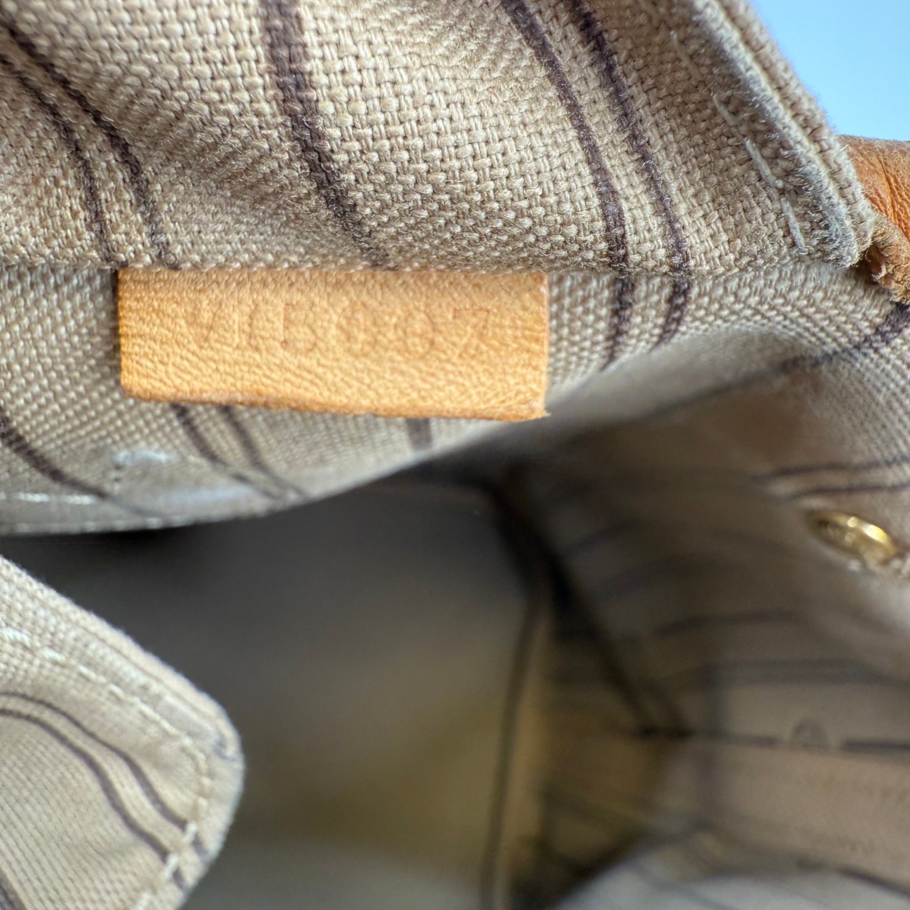 Louis Vuitton Monogram Neverfull MM in classic brown coated canvas with natural vachetta leather trim and shoulder straps. Features adjustable side laces to alter the shape, gold-tone hardware, and a spacious open interior with a striped lining and zip pocket. Lightweight, durable, and iconic—perfect for everyday carry with moderate, age-appropriate wear.