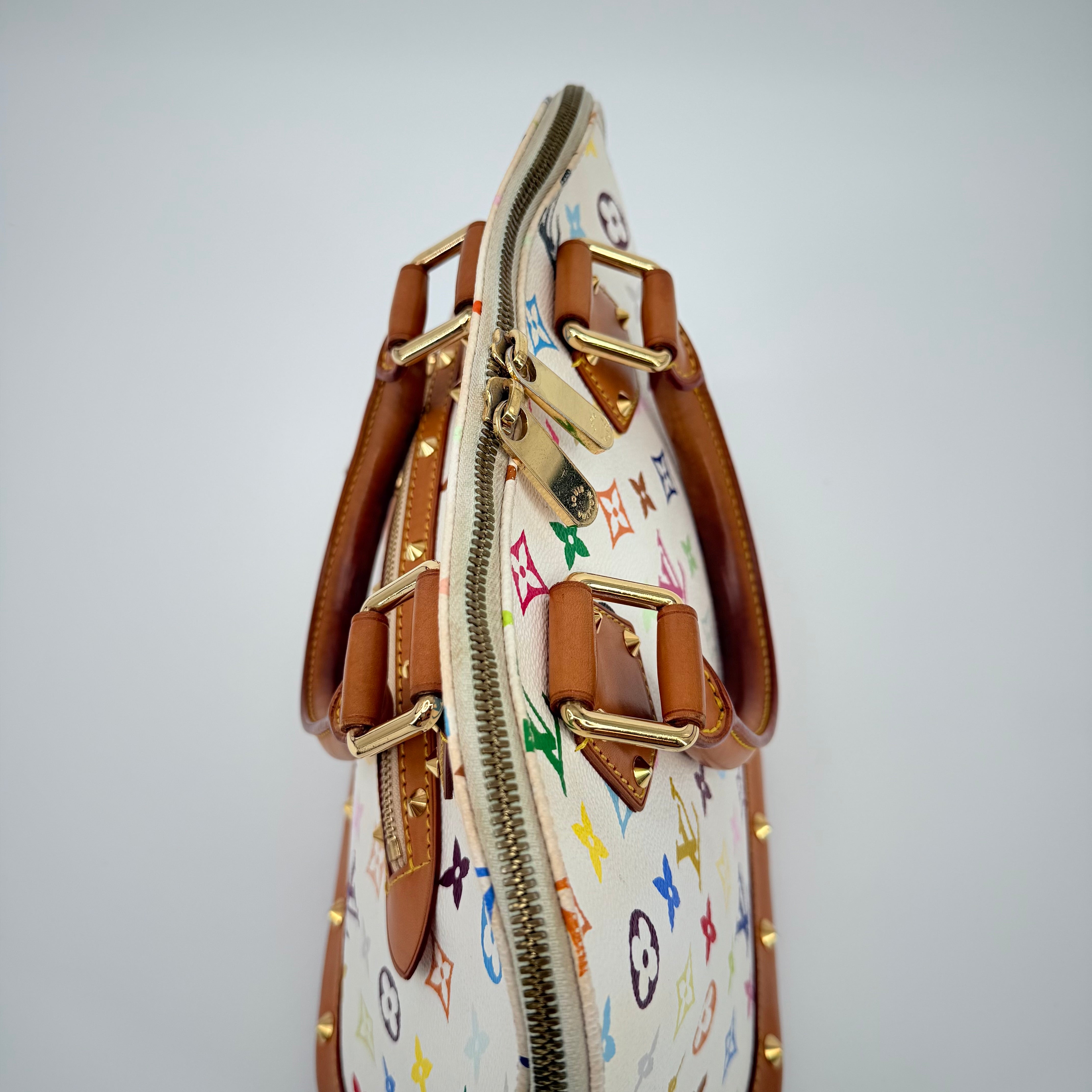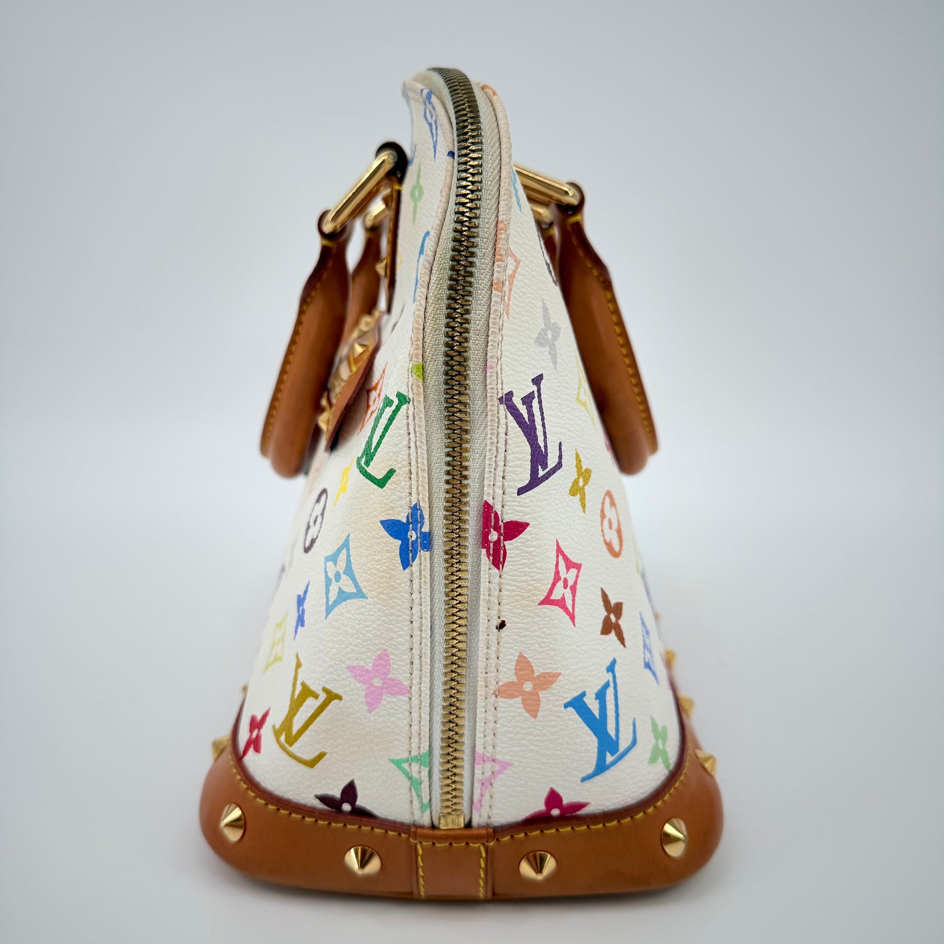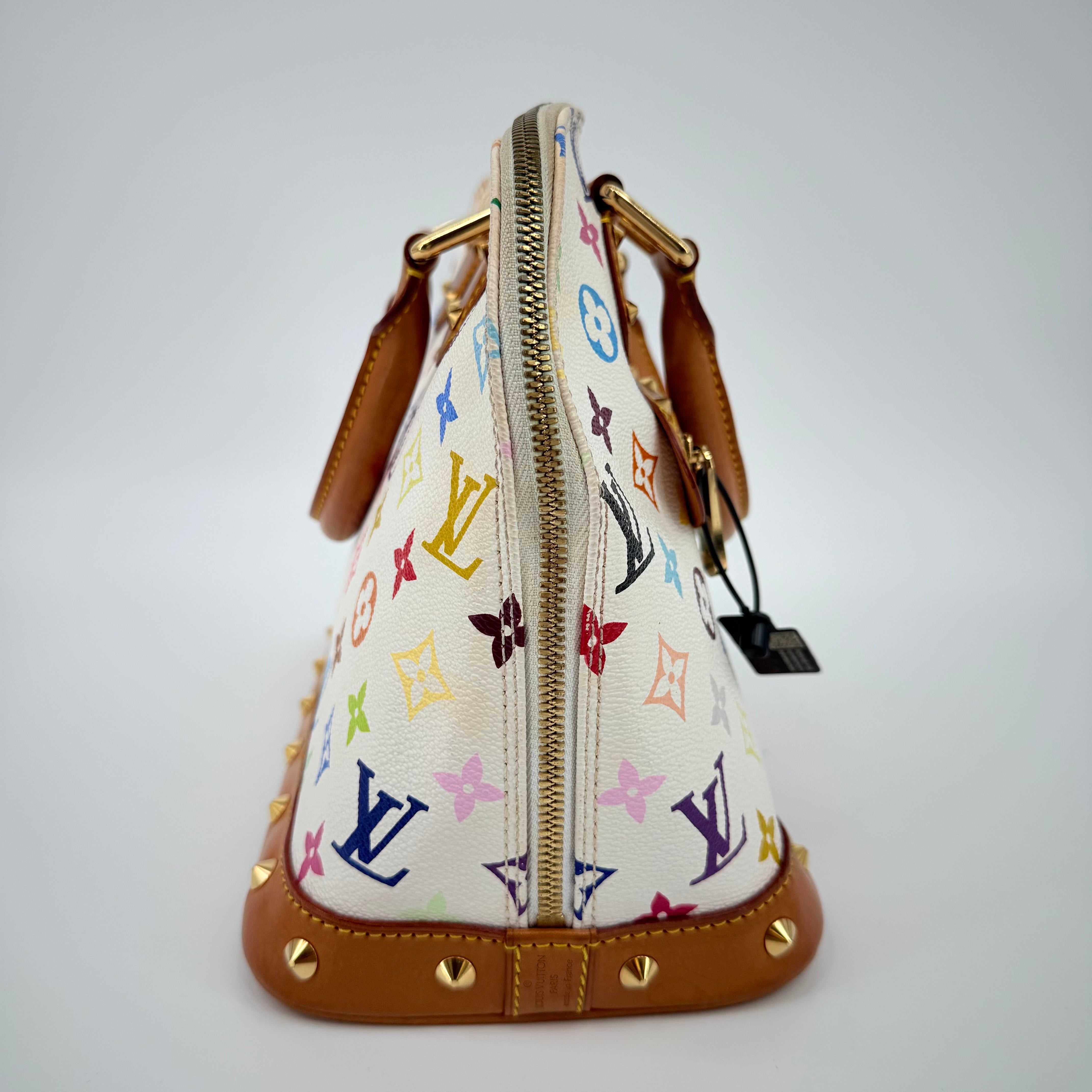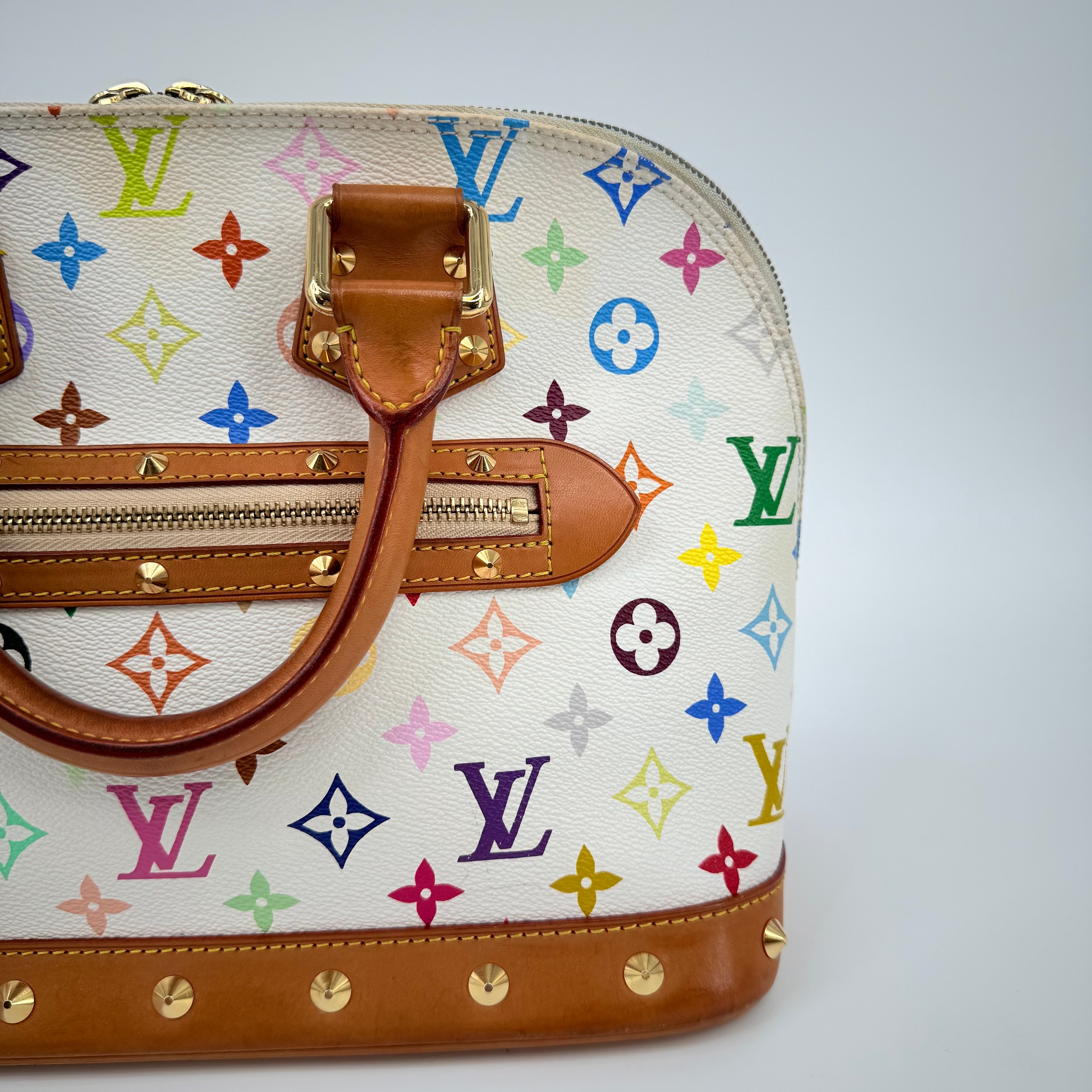 The Louis Vuitton Alma Multicolore in Blanc, from the celebrated Takashi Murakami collaboration, is a vibrant expression of artistry and luxury. Crafted from white monogram canvas adorned with Murakami’s iconic rainbow motif, it’s beautifully contrasted with natural vachetta leather and gold-tone stud detailing. This statement piece blends playful creativity with timeless Louis Vuitton craftsmanship — a collector’s favourite that perfectly embodies the spirit of early 200