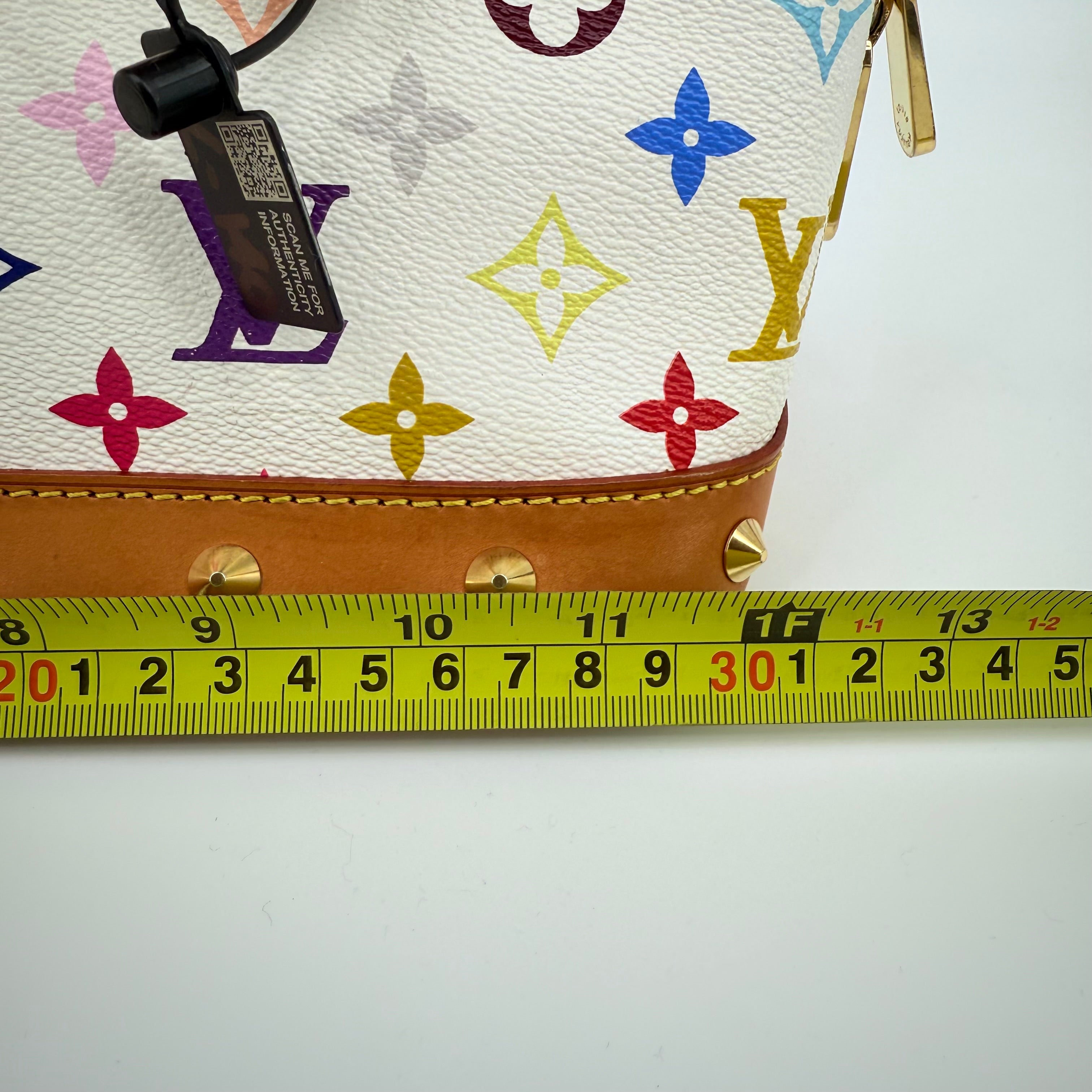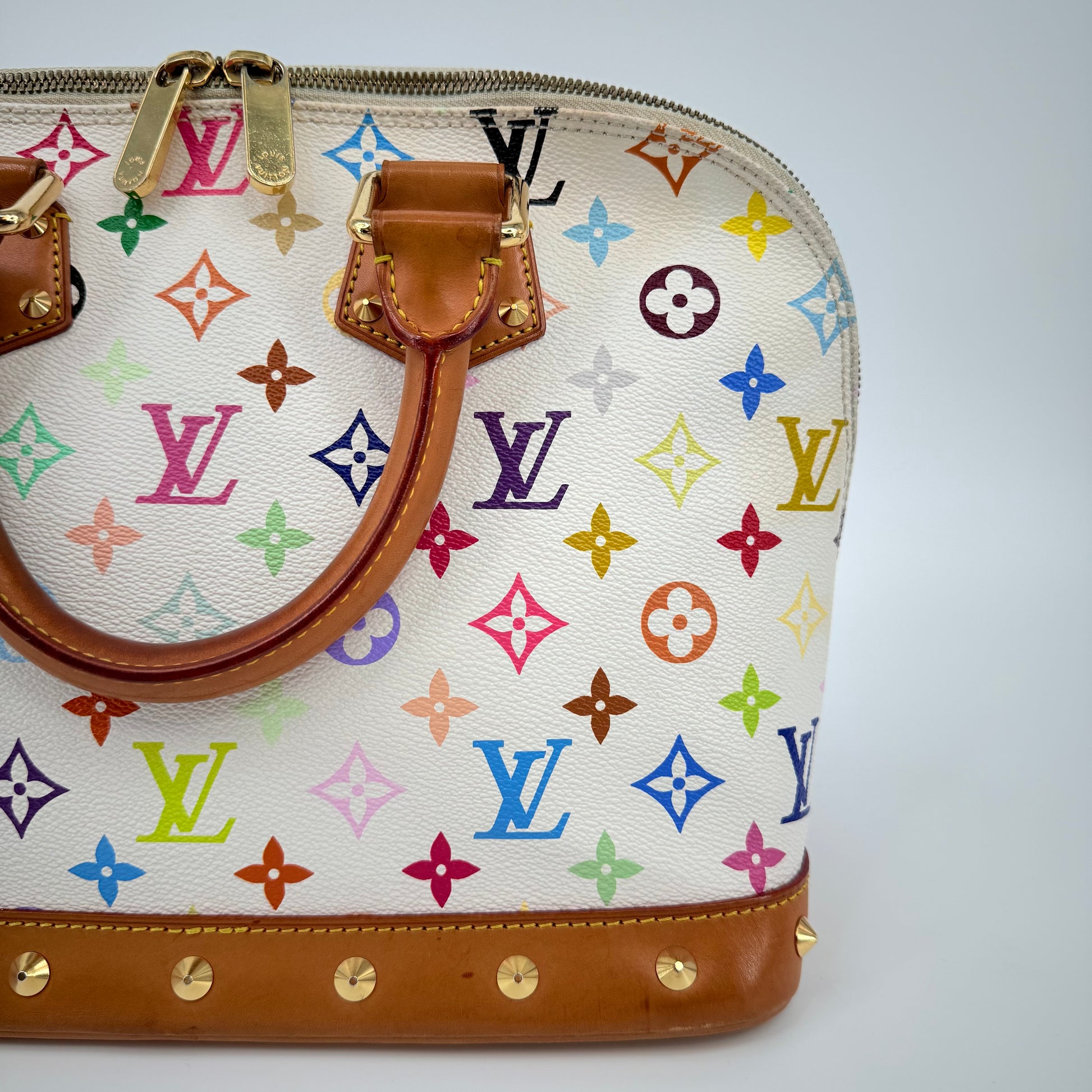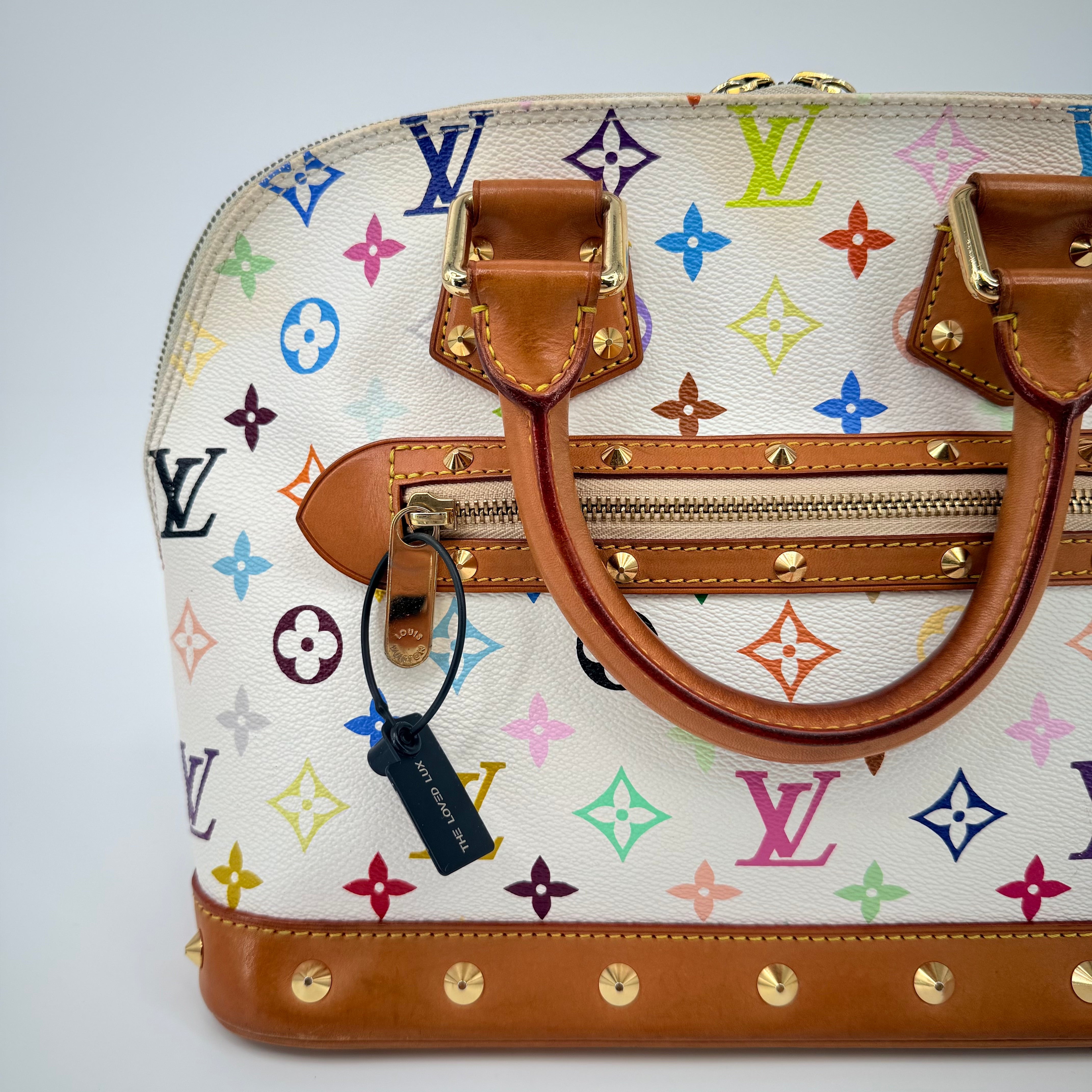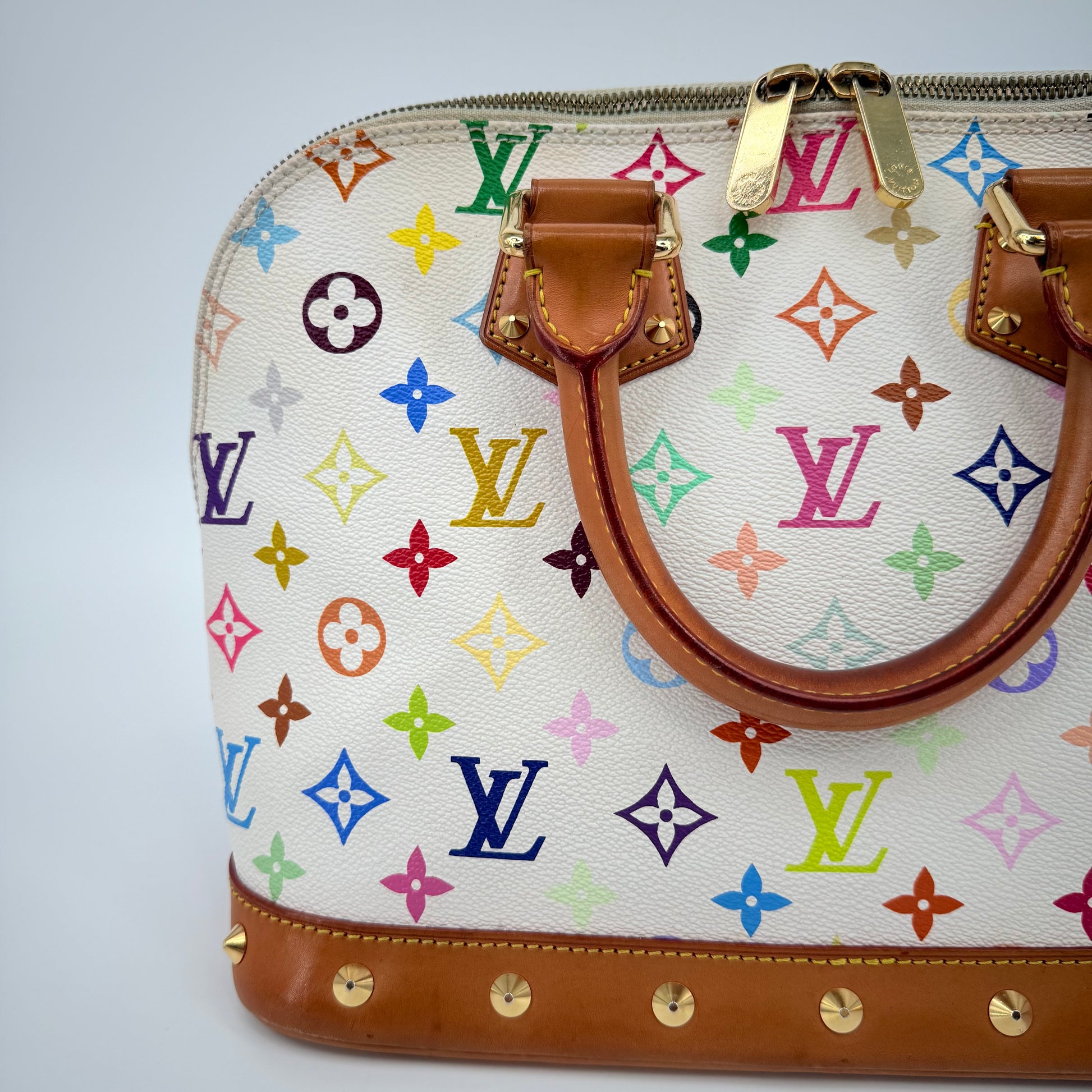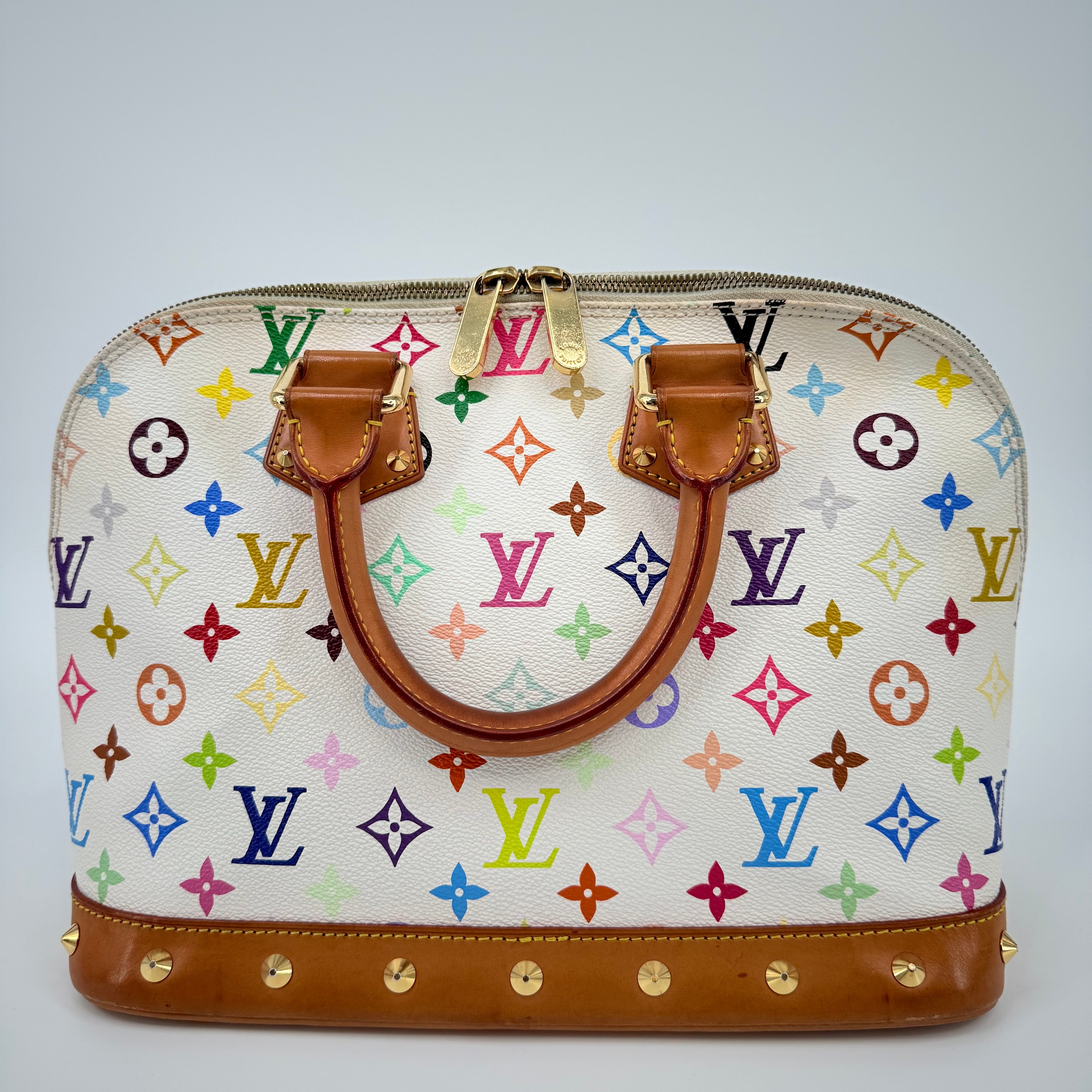 The Louis Vuitton Alma Multicolore in Blanc, from the celebrated Takashi Murakami collaboration, is a vibrant expression of artistry and luxury. Crafted from white monogram canvas adorned with Murakami’s iconic rainbow motif, it’s beautifully contrasted with natural vachetta leather and gold-tone stud detailing. This statement piece blends playful creativity with timeless Louis Vuitton craftsmanship — a collector’s favourite that perfectly embodies the spirit of early 200