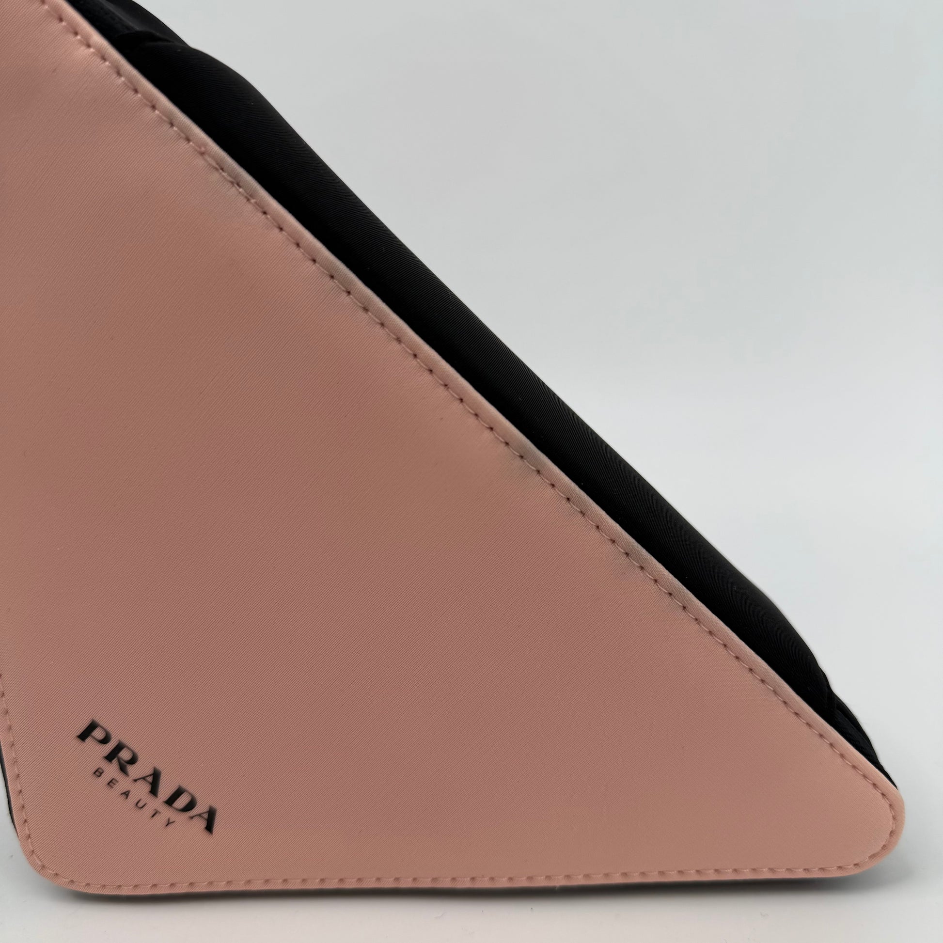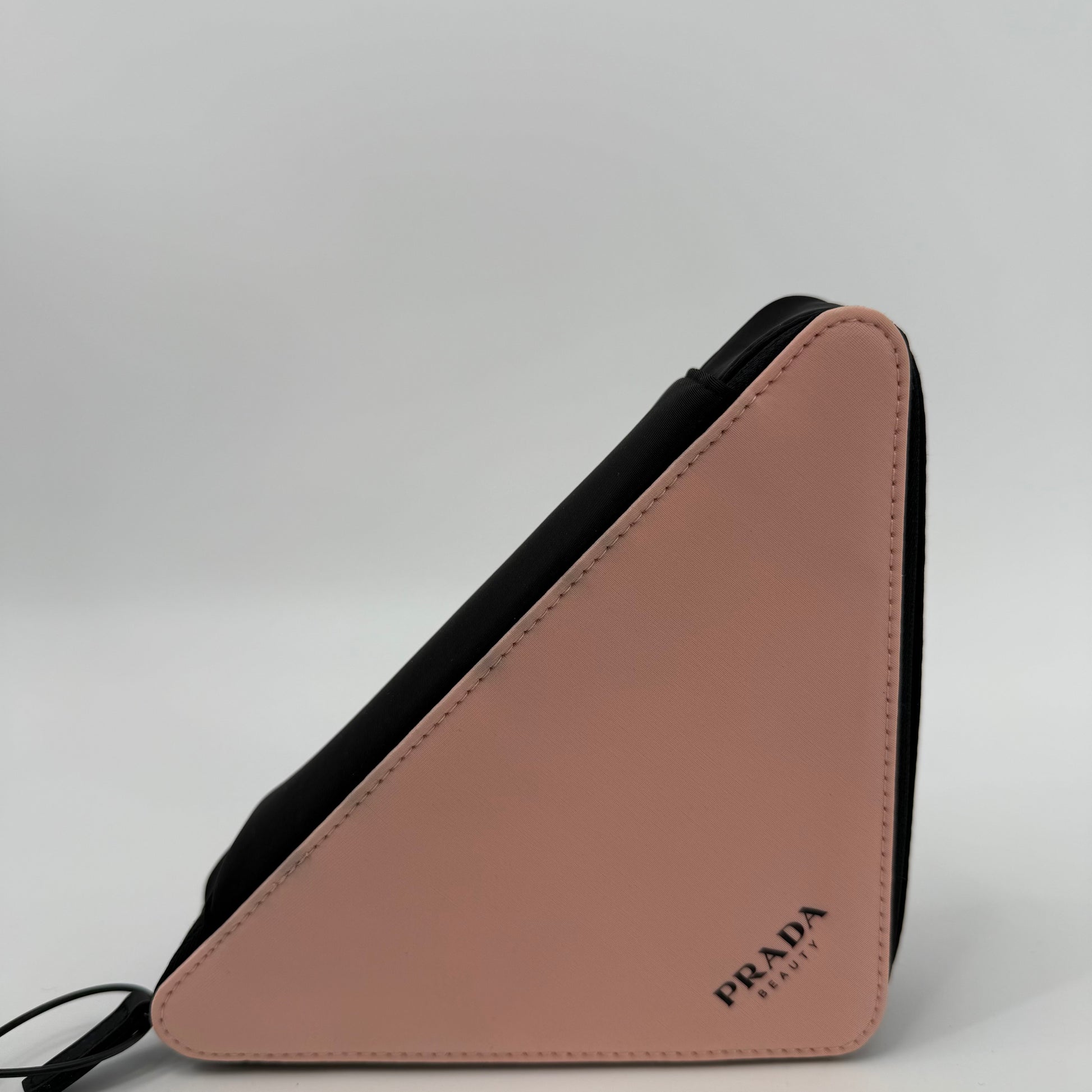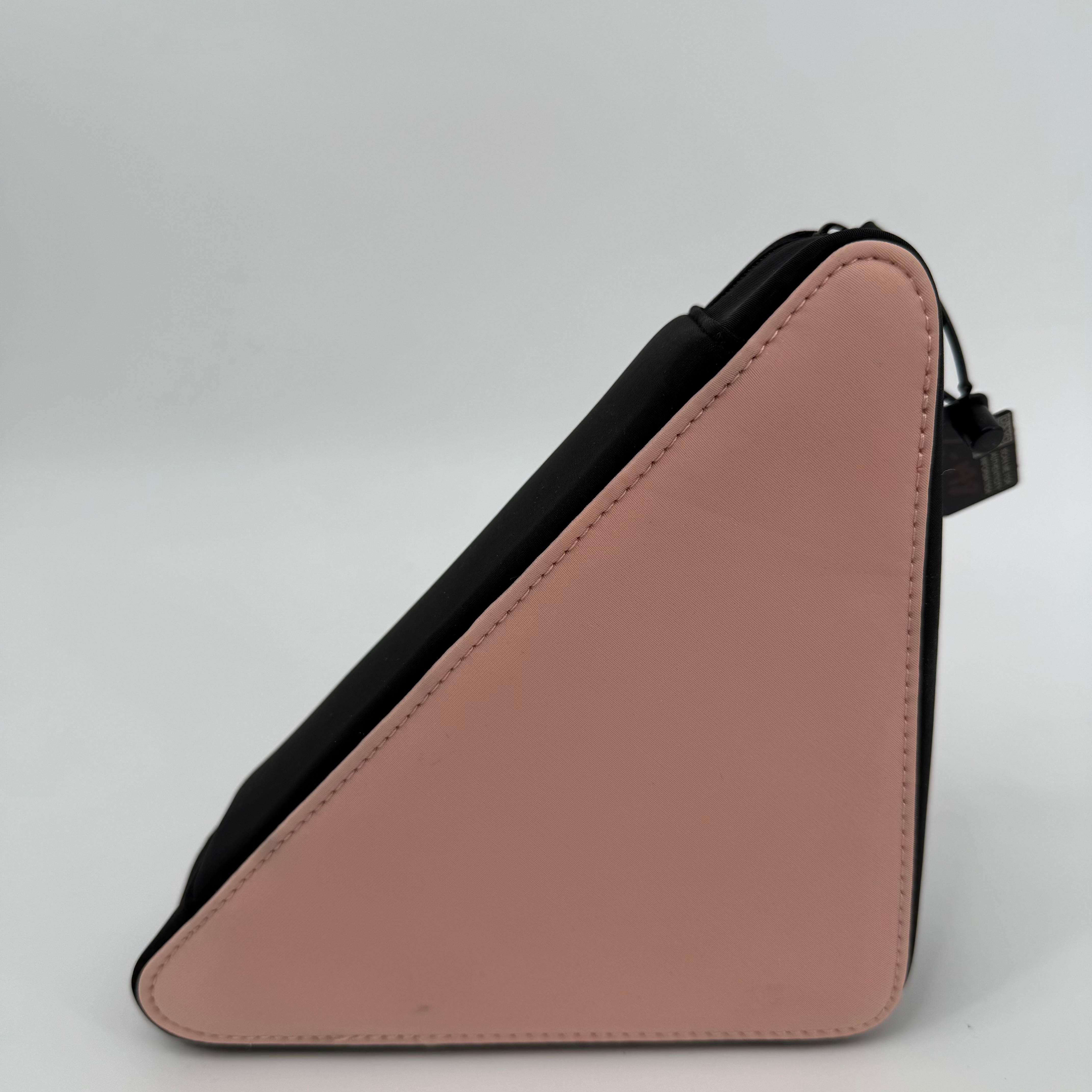 This Prada triangular pouch features the brand’s signature geometric silhouette in soft blush pink, contrasted with black trim and clean stitching for a modern, architectural look. Finished with the subtle Prada Milano logo at the corner and a secure zip closure, this compact yet eye-catching piece is ideal for carrying essentials while making a bold, minimalist style statement.
