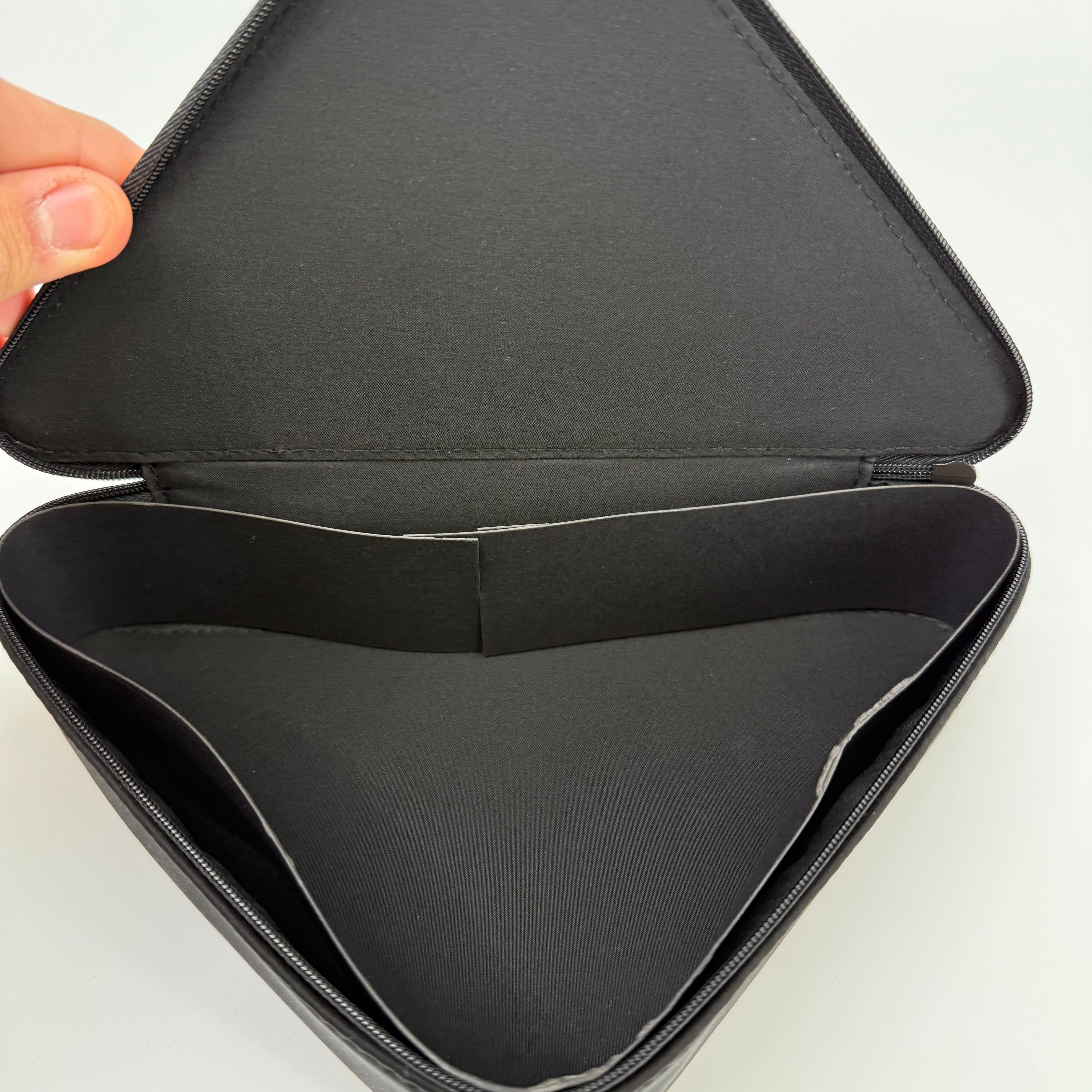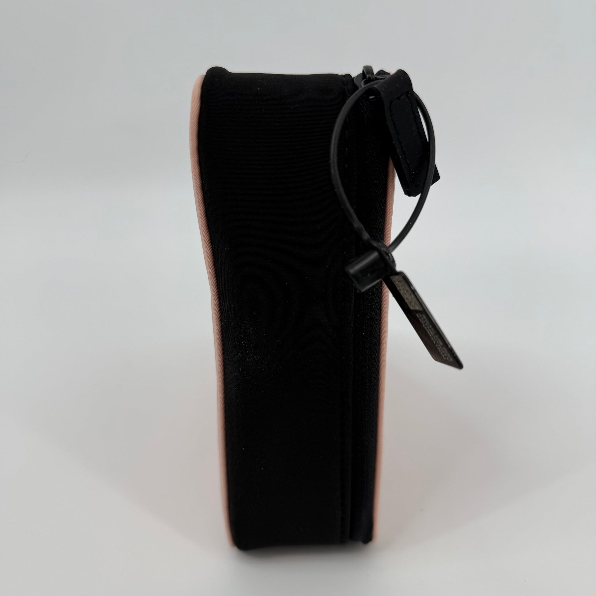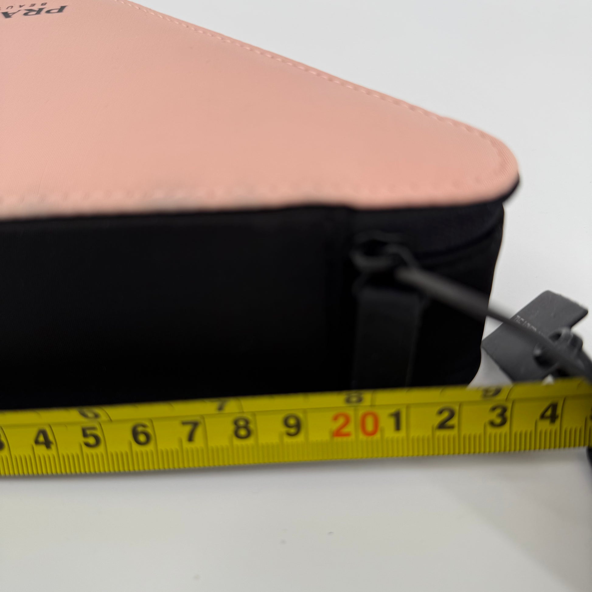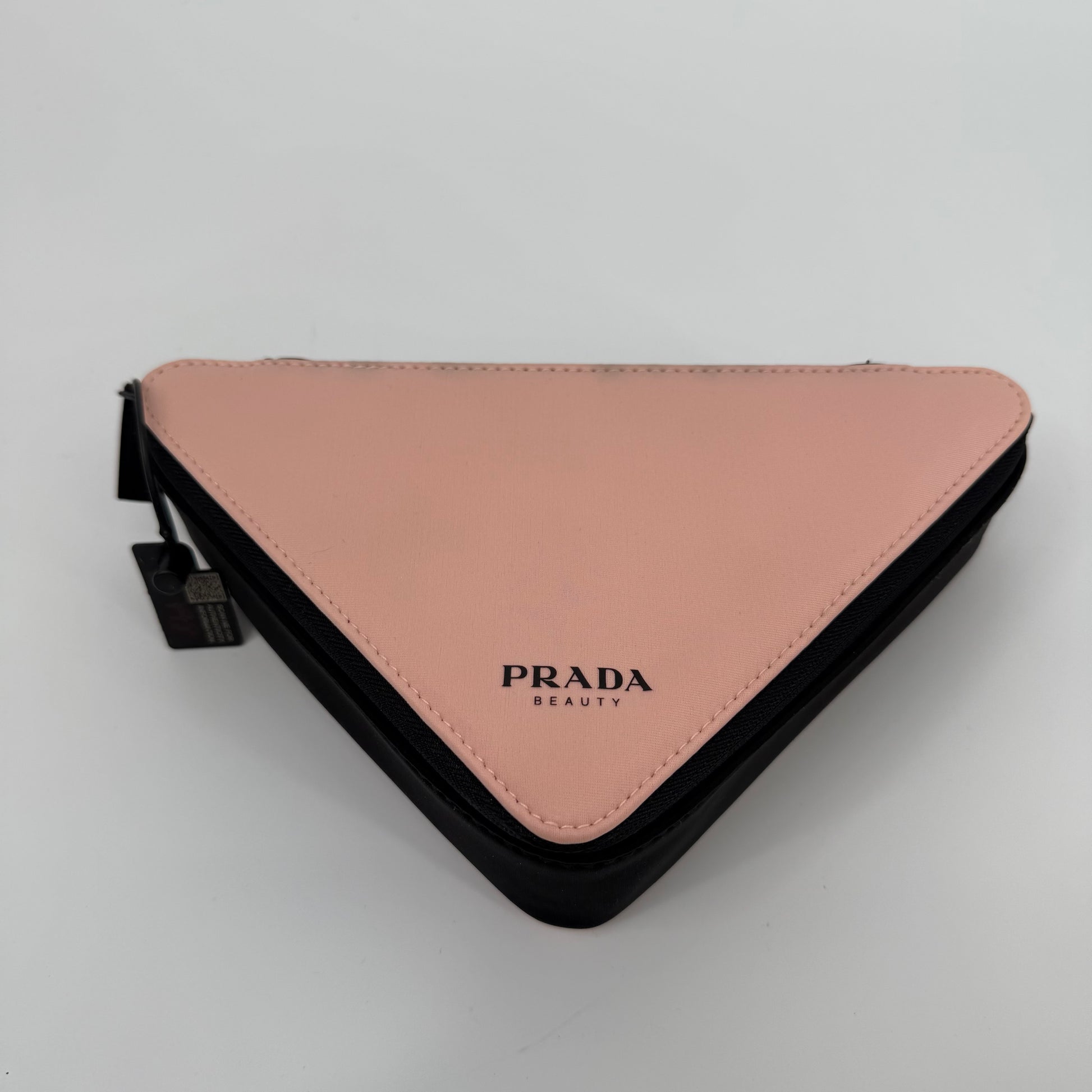 This Prada triangular pouch features the brand’s signature geometric silhouette in soft blush pink, contrasted with black trim and clean stitching for a modern, architectural look. Finished with the subtle Prada Milano logo at the corner and a secure zip closure, this compact yet eye-catching piece is ideal for carrying essentials while making a bold, minimalist style statement.