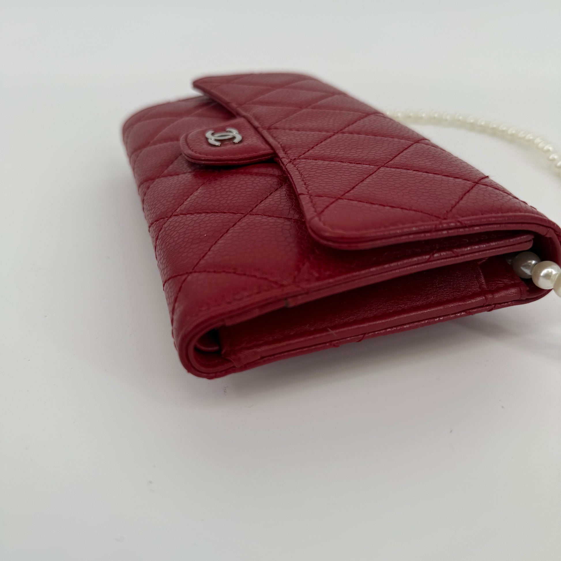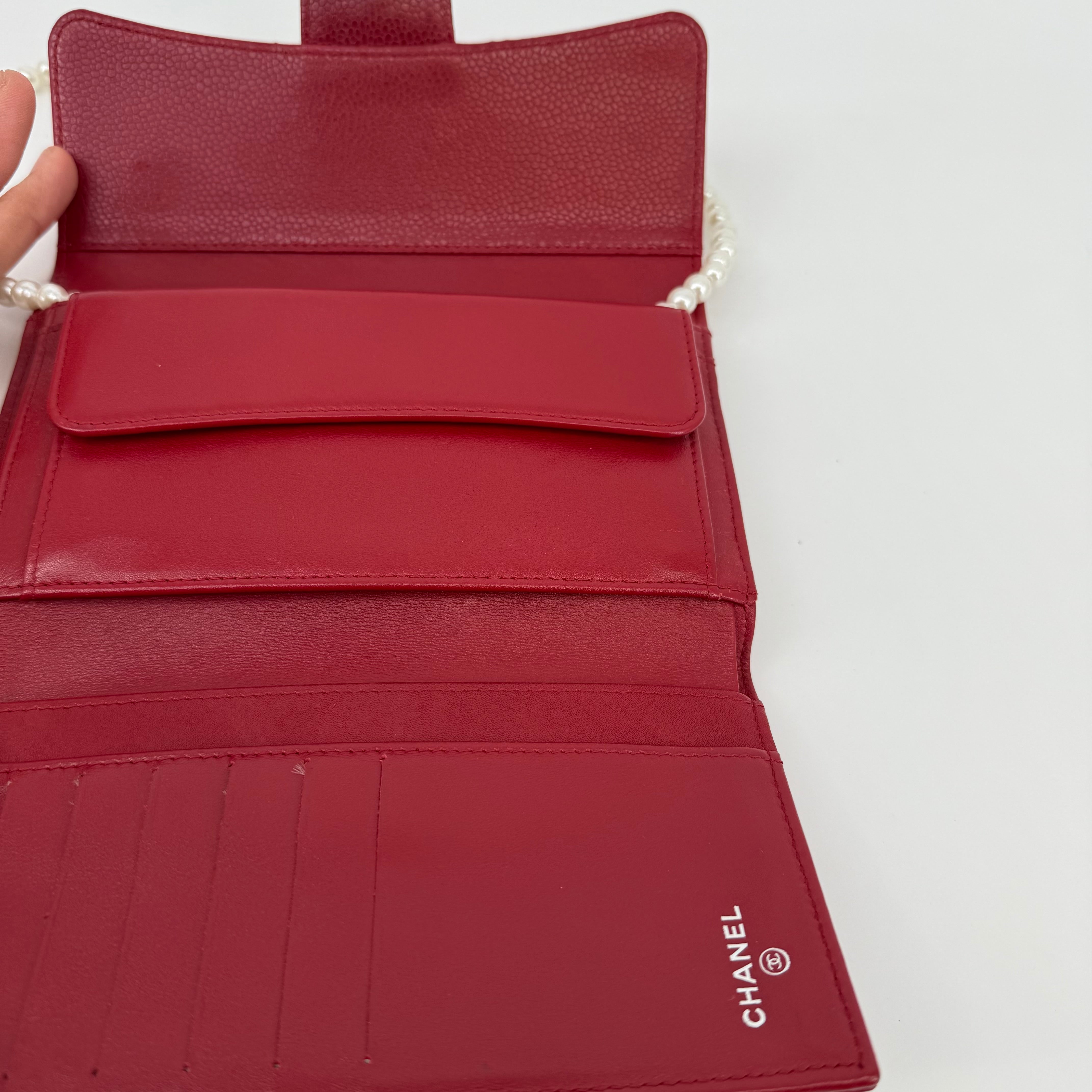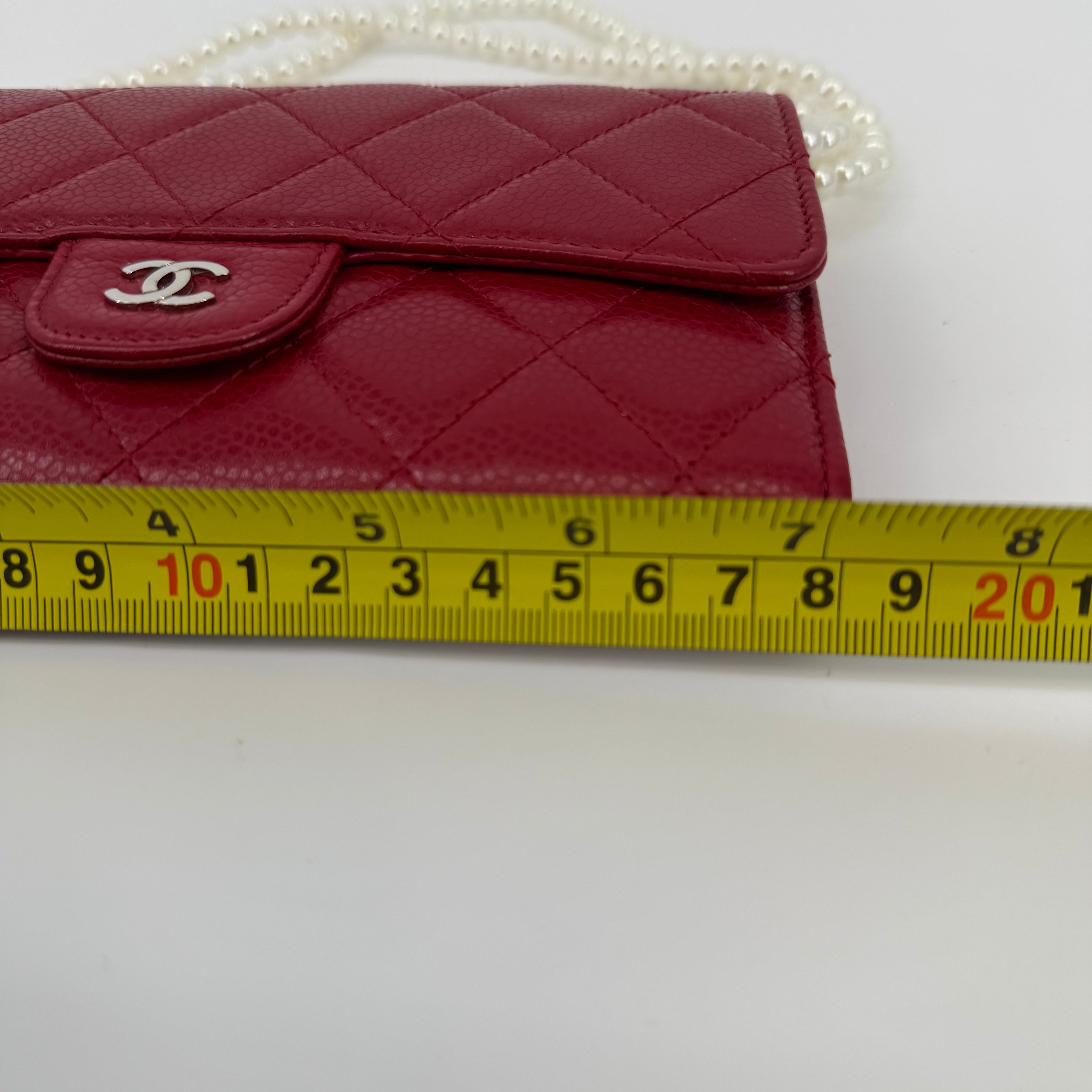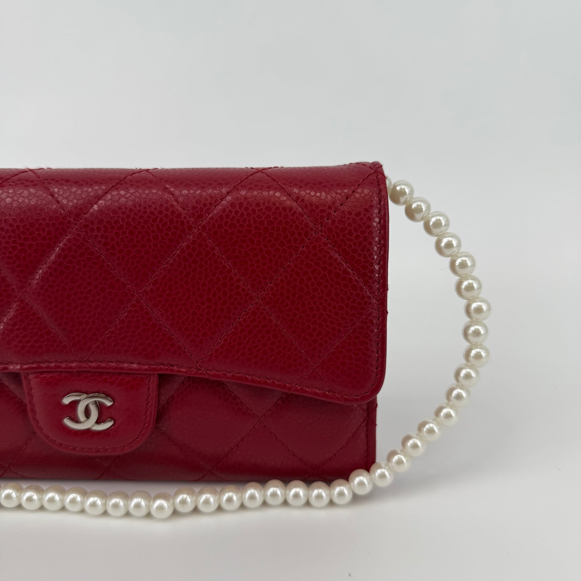 An exquisite blend of elegance and timeless Chanel craftsmanship, this Chanel Wallet on Chain features the brand’s iconic diamond quilting in luxurious red caviar leather, accented with a CC logo in silver-tone hardware. The statement pearl-accented chain strap adds a touch of femininity and sophistication, making it perfect for both day and evening wear. Compact yet functional, it offers slots for cards, a zipped coin pocket, and space for small essentials.