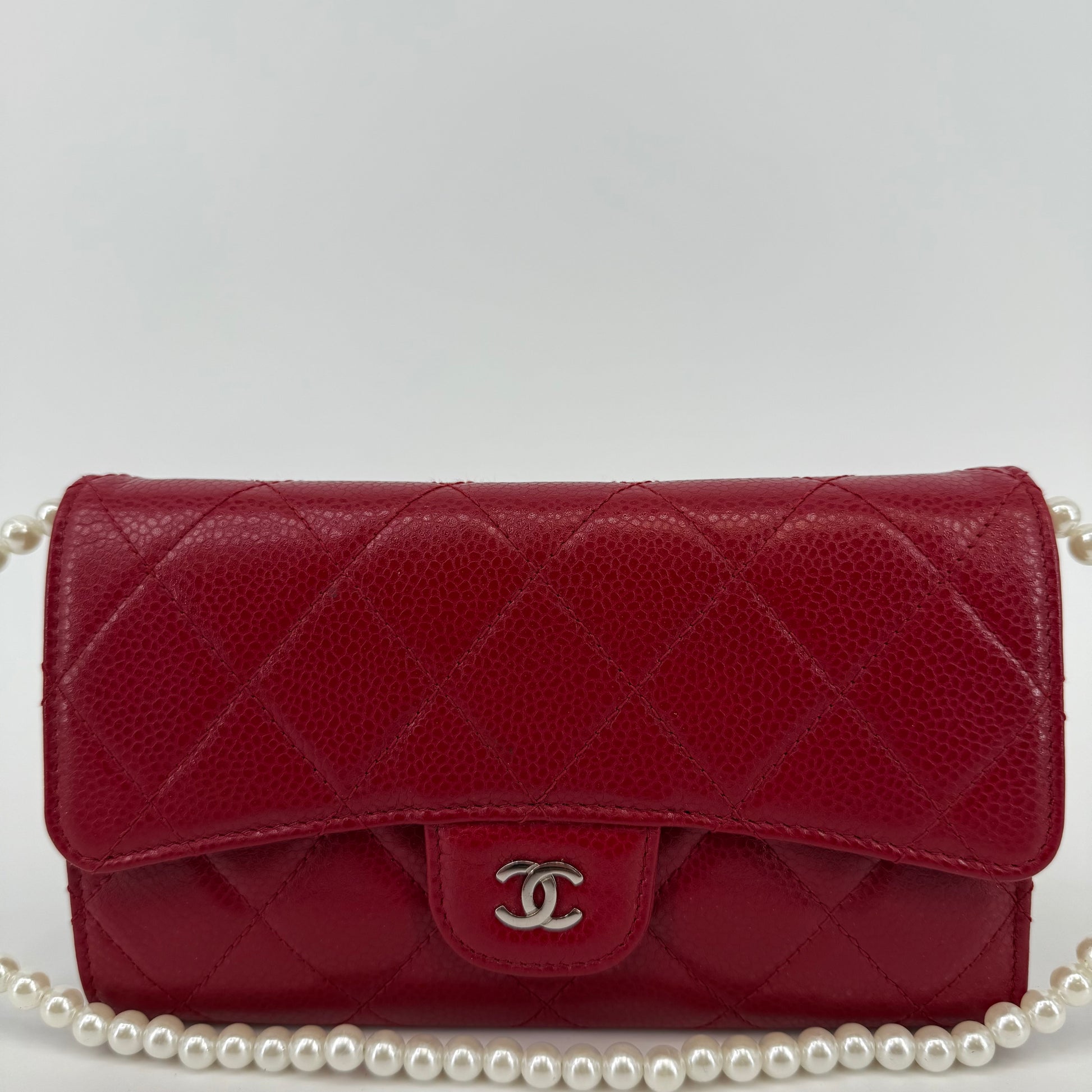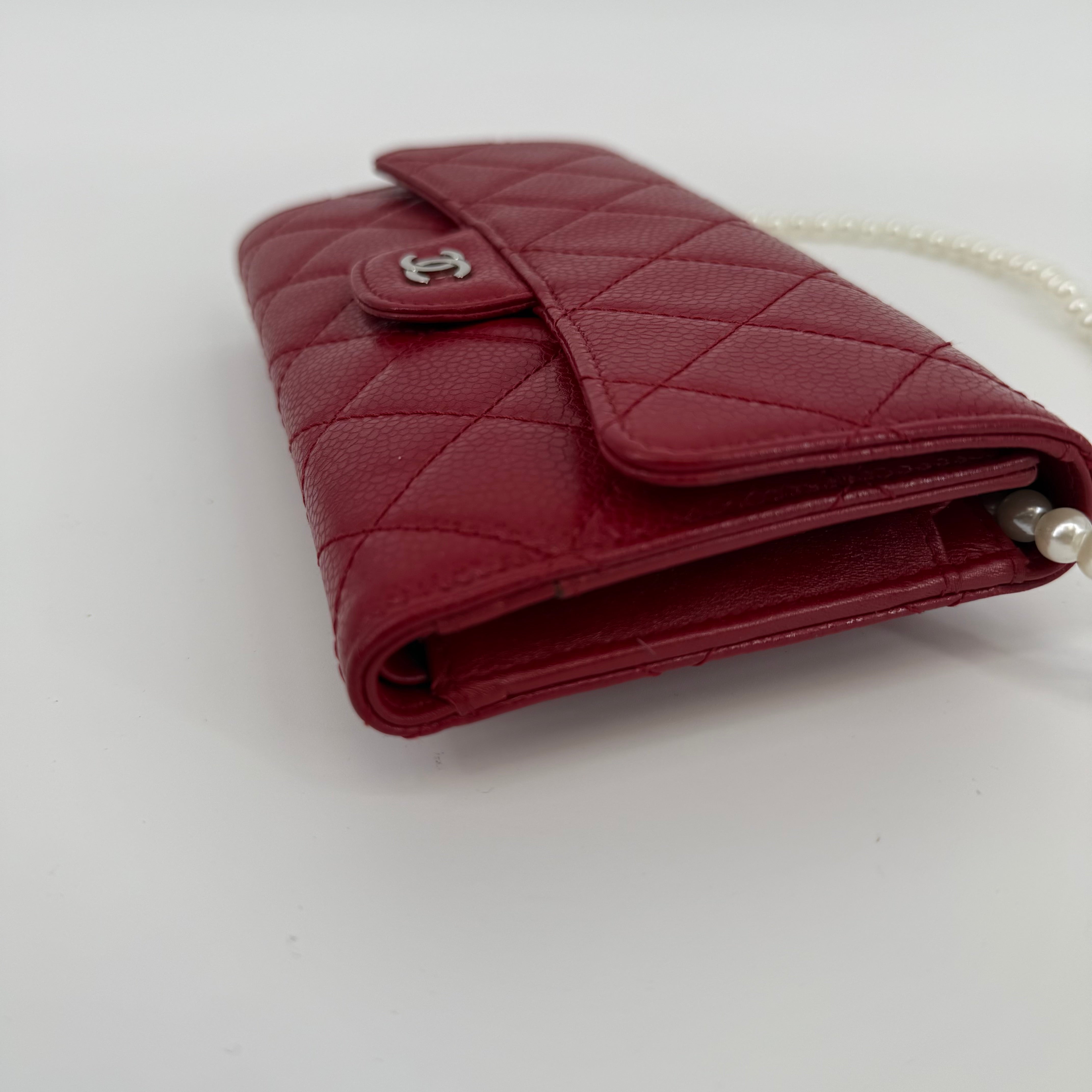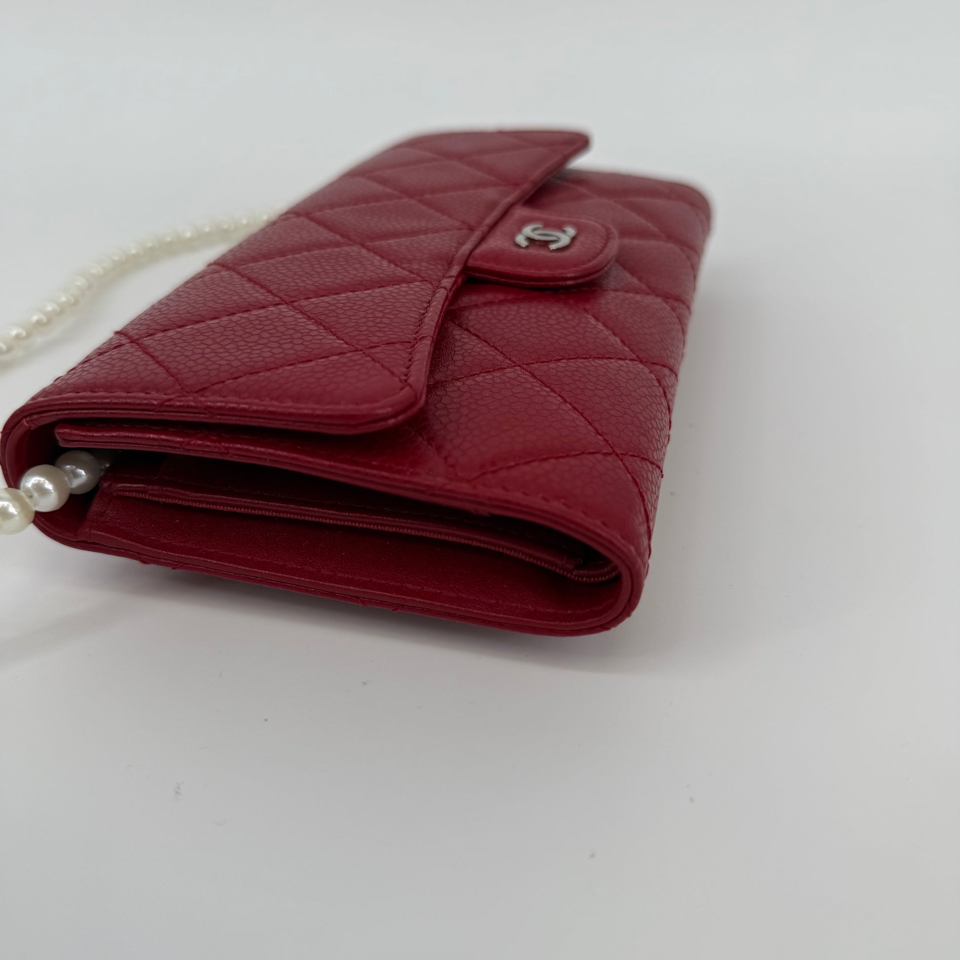 An exquisite blend of elegance and timeless Chanel craftsmanship, this Chanel Wallet on Chain features the brand’s iconic diamond quilting in luxurious red caviar leather, accented with a CC logo in silver-tone hardware. The statement pearl-accented chain strap adds a touch of femininity and sophistication, making it perfect for both day and evening wear. Compact yet functional, it offers slots for cards, a zipped coin pocket, and space for small essentials.