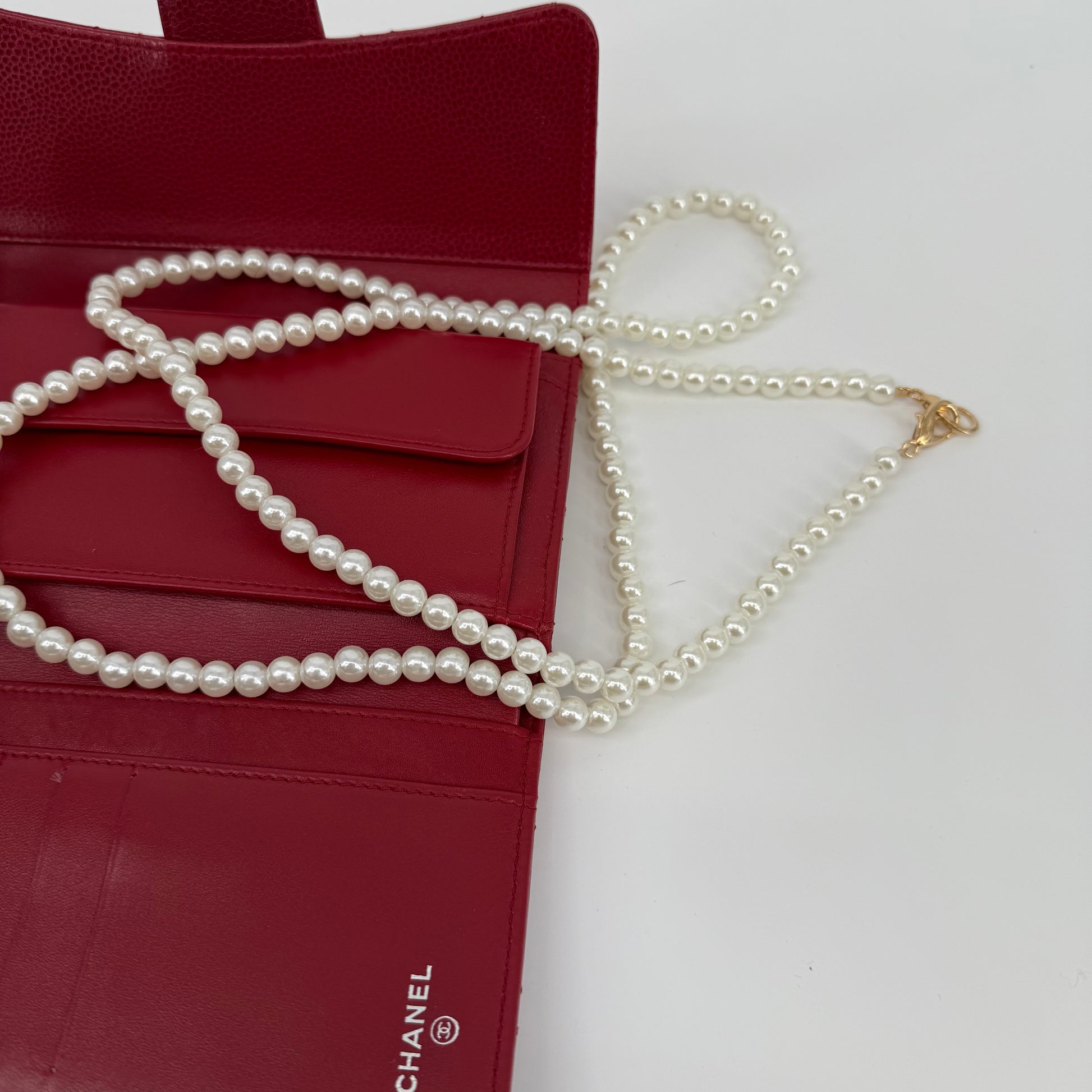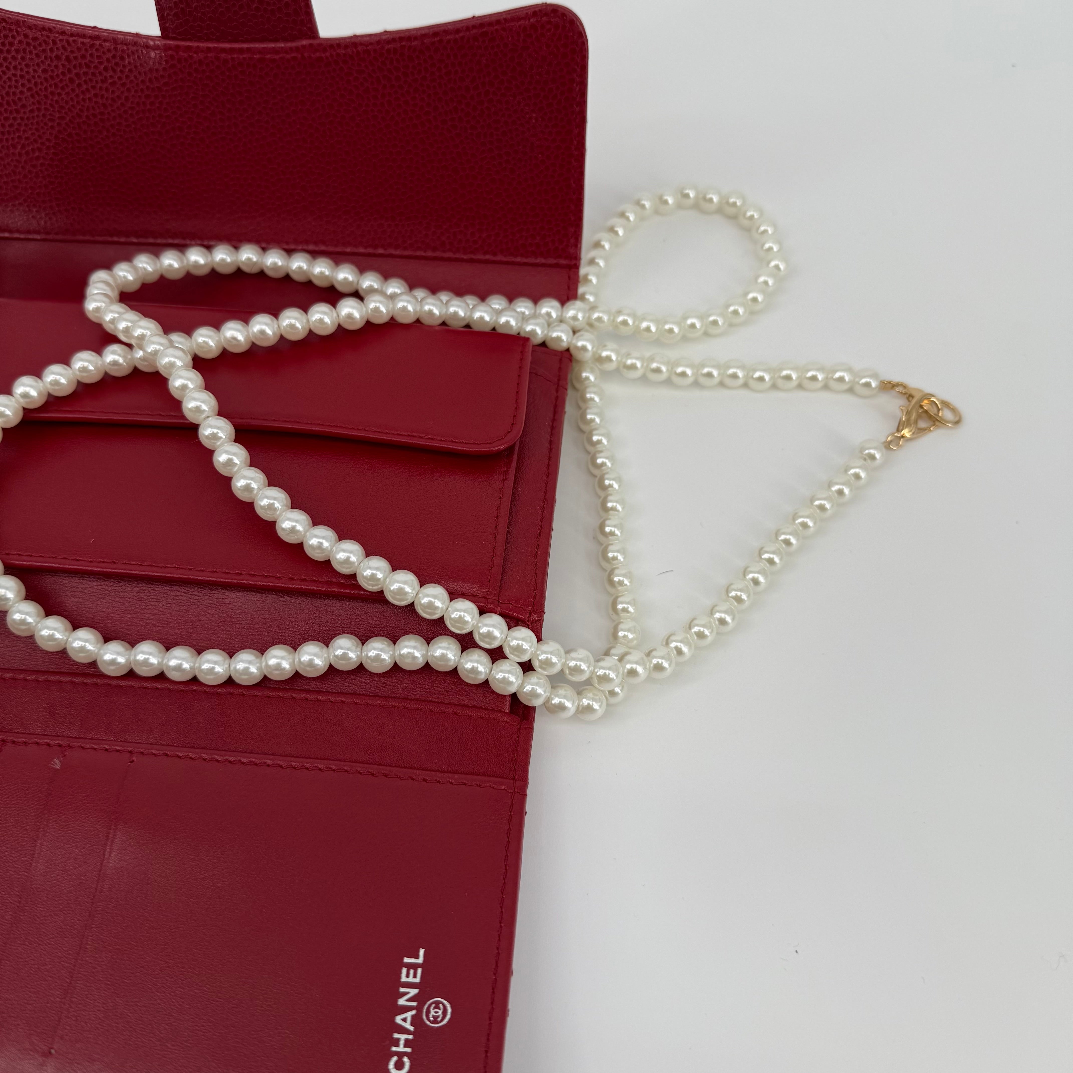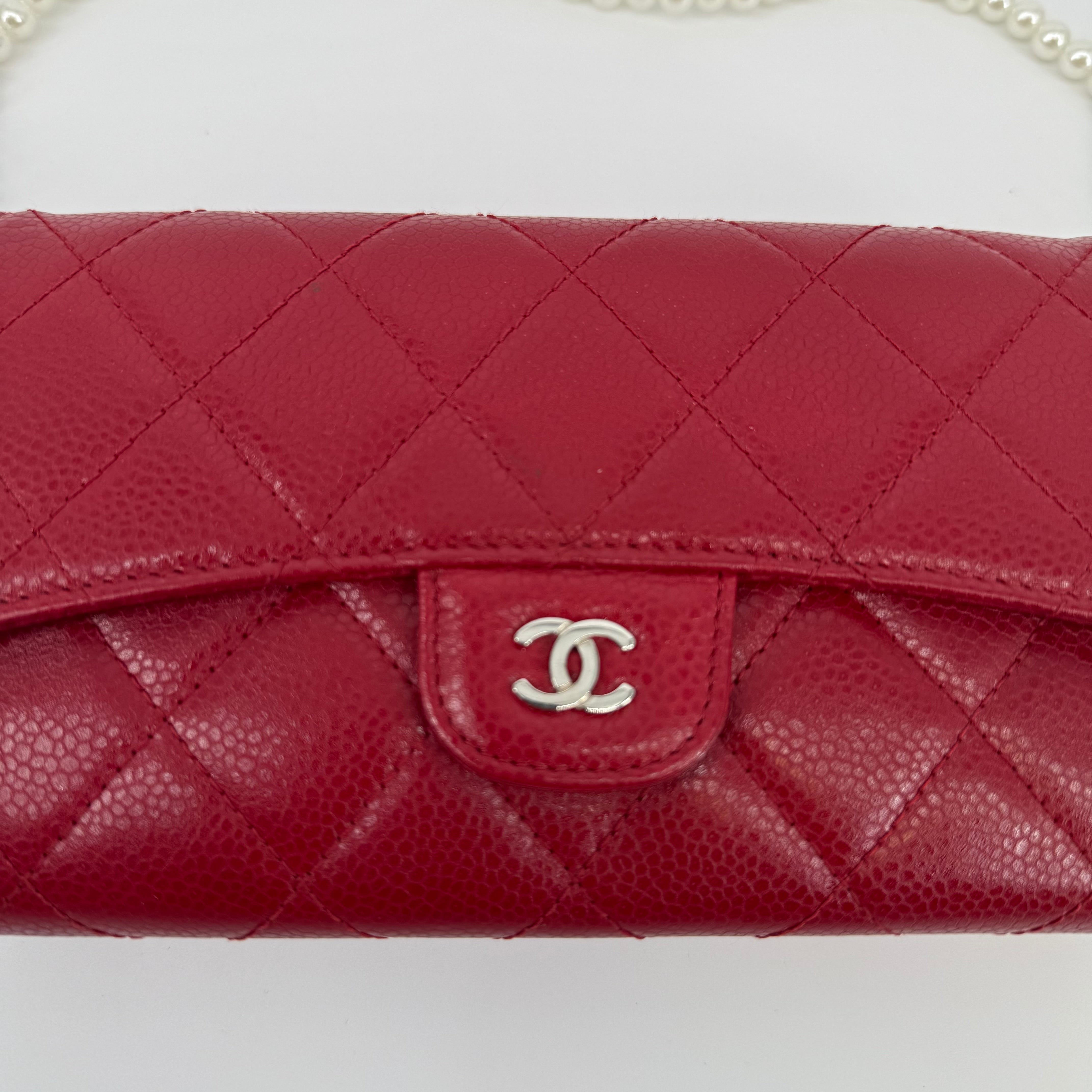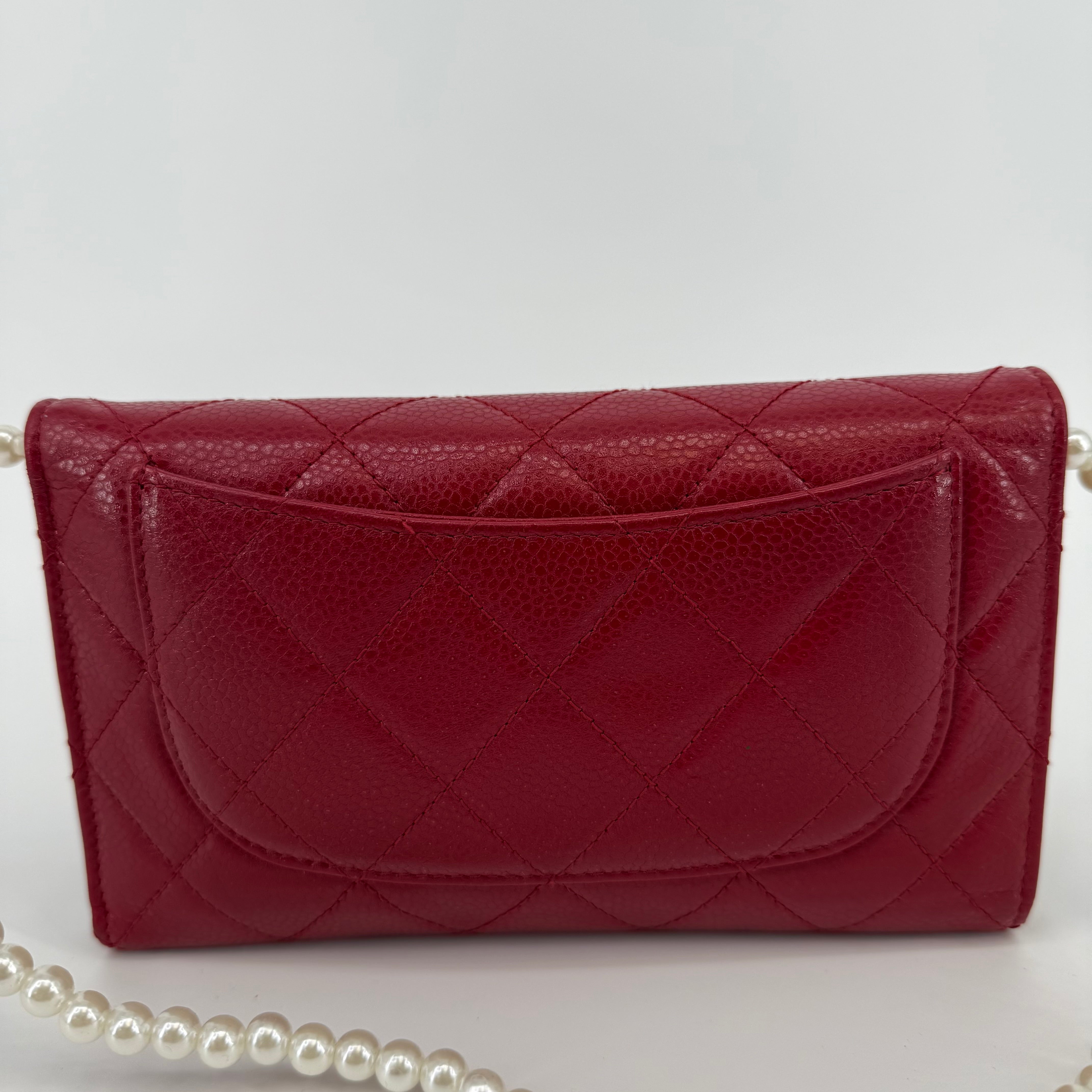 An exquisite blend of elegance and timeless Chanel craftsmanship, this Chanel Wallet on Chain features the brand’s iconic diamond quilting in luxurious red caviar leather, accented with a CC logo in silver-tone hardware. The statement pearl-accented chain strap adds a touch of femininity and sophistication, making it perfect for both day and evening wear. Compact yet functional, it offers slots for cards, a zipped coin pocket, and space for small essentials.