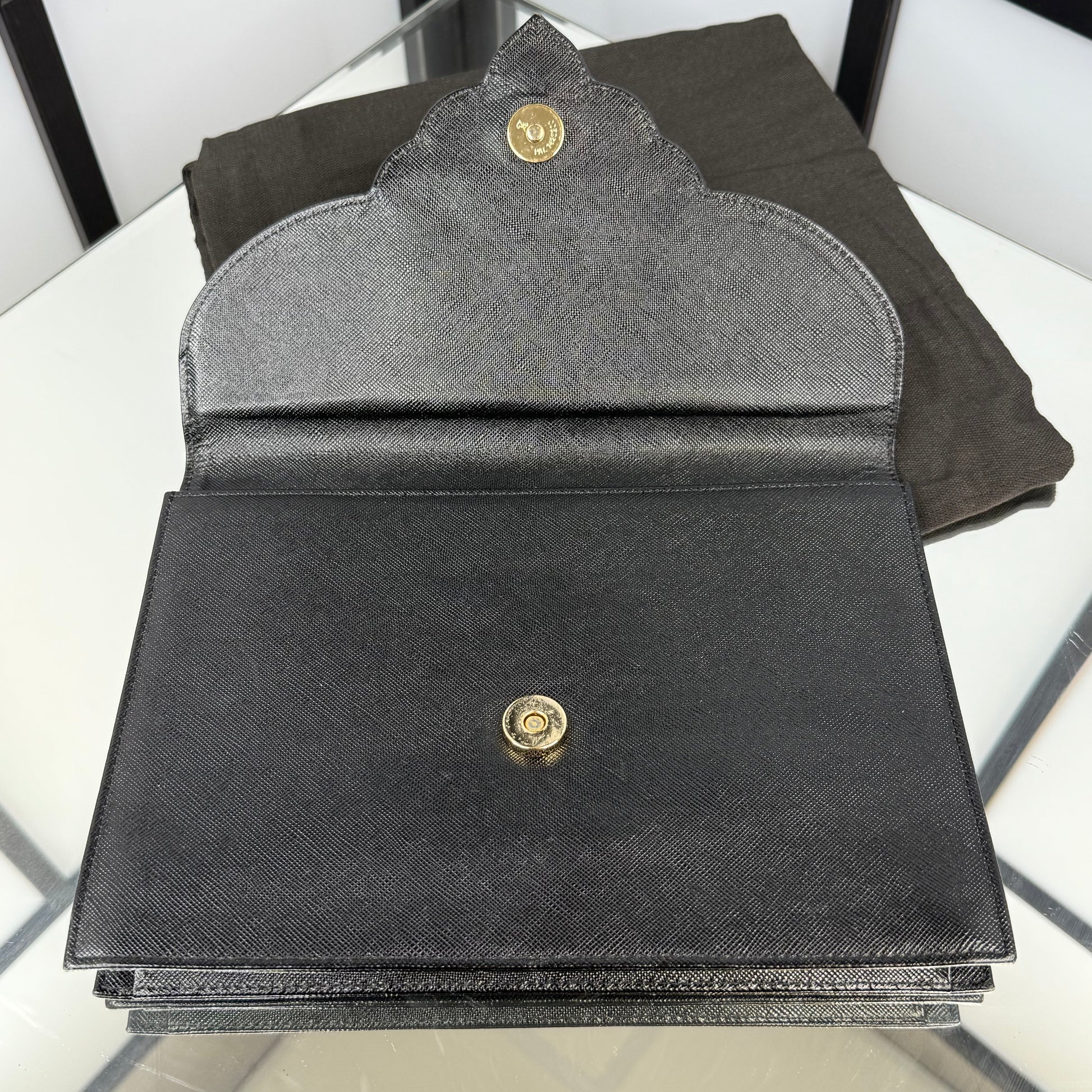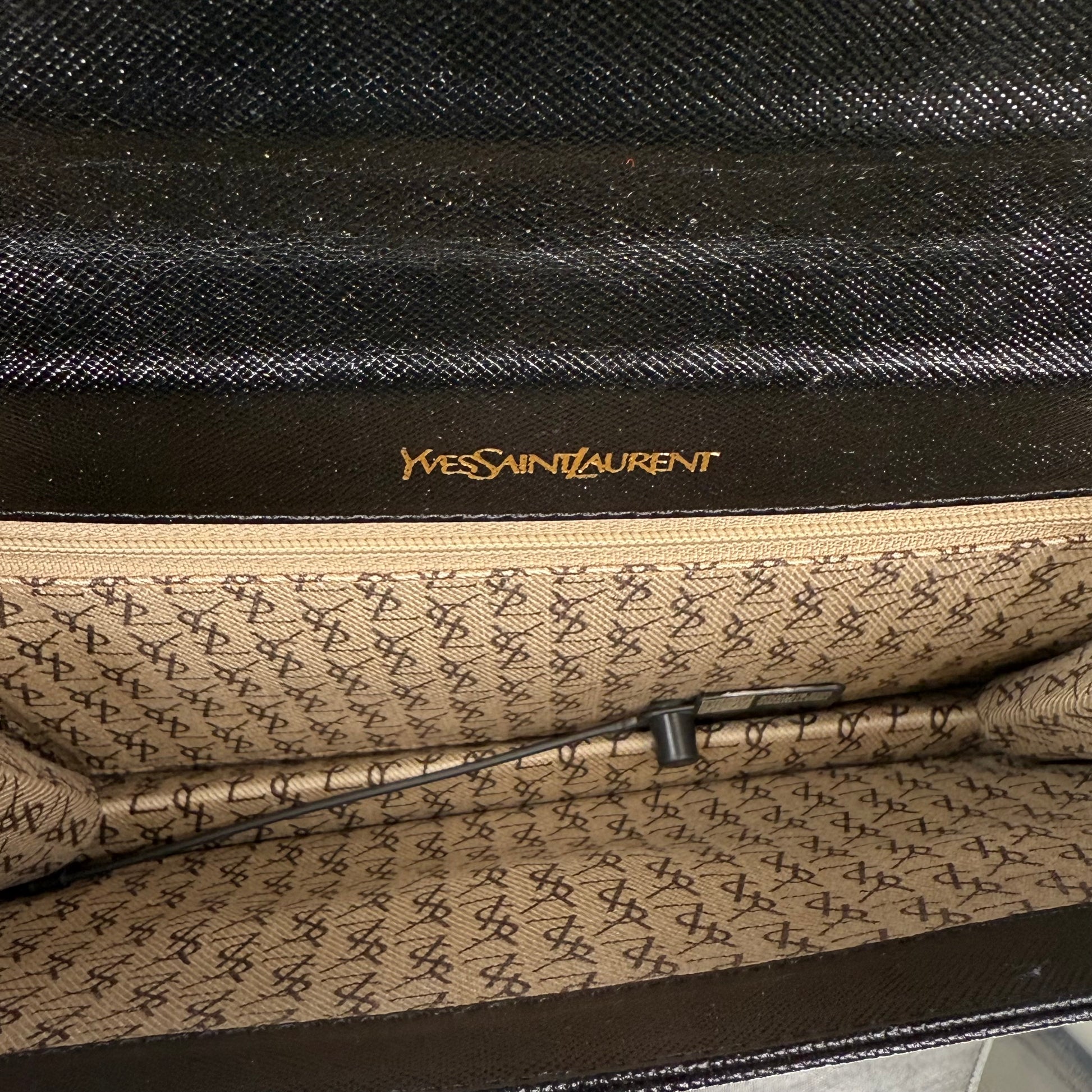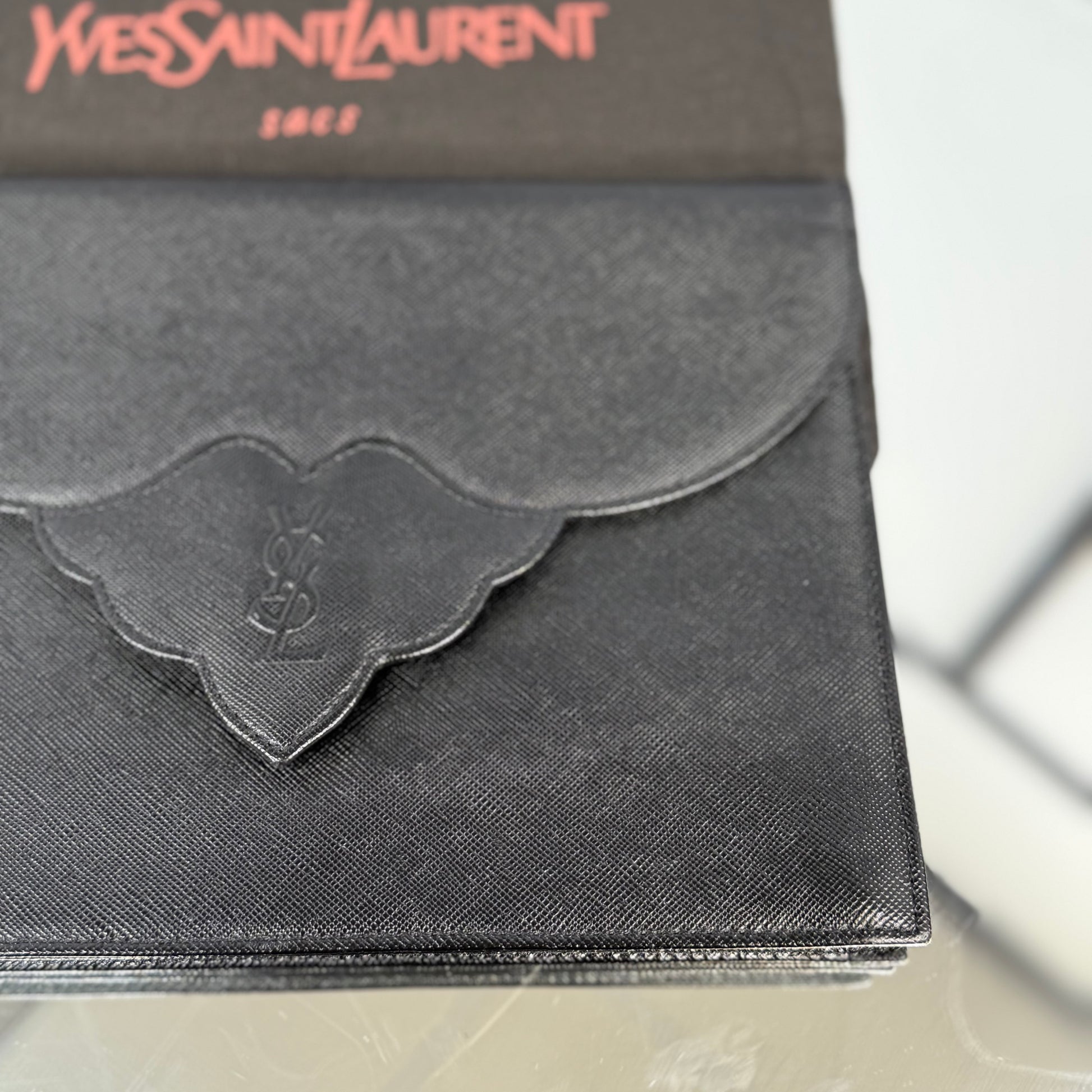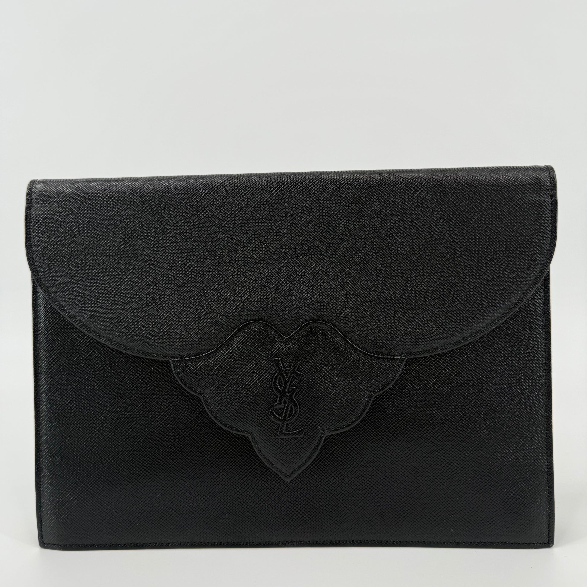 The Yves Saint Laurent Black Clutch Bag is a striking example of the brand’s refined Parisian glamour. Crafted in sleek black suede with the signature YSL logo detail, it balances minimalism with sophistication. Its structured silhouette and fold-over flap make it ideal for evening occasions, effortlessly embodying the timeless elegance and confidence synonymous with Saint Laurent.